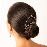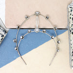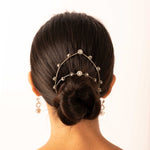 El tocado se compone de dos barras metalizadas, expertamente decoradas con piezas metálicas en tono plata y brillantes, que aportan un toque sofisticado y sutilmente brillante a tu look. Estas tonalidades se entrelazan de manera armoniosa para crear un contraste encantador y resaltar tu belleza.