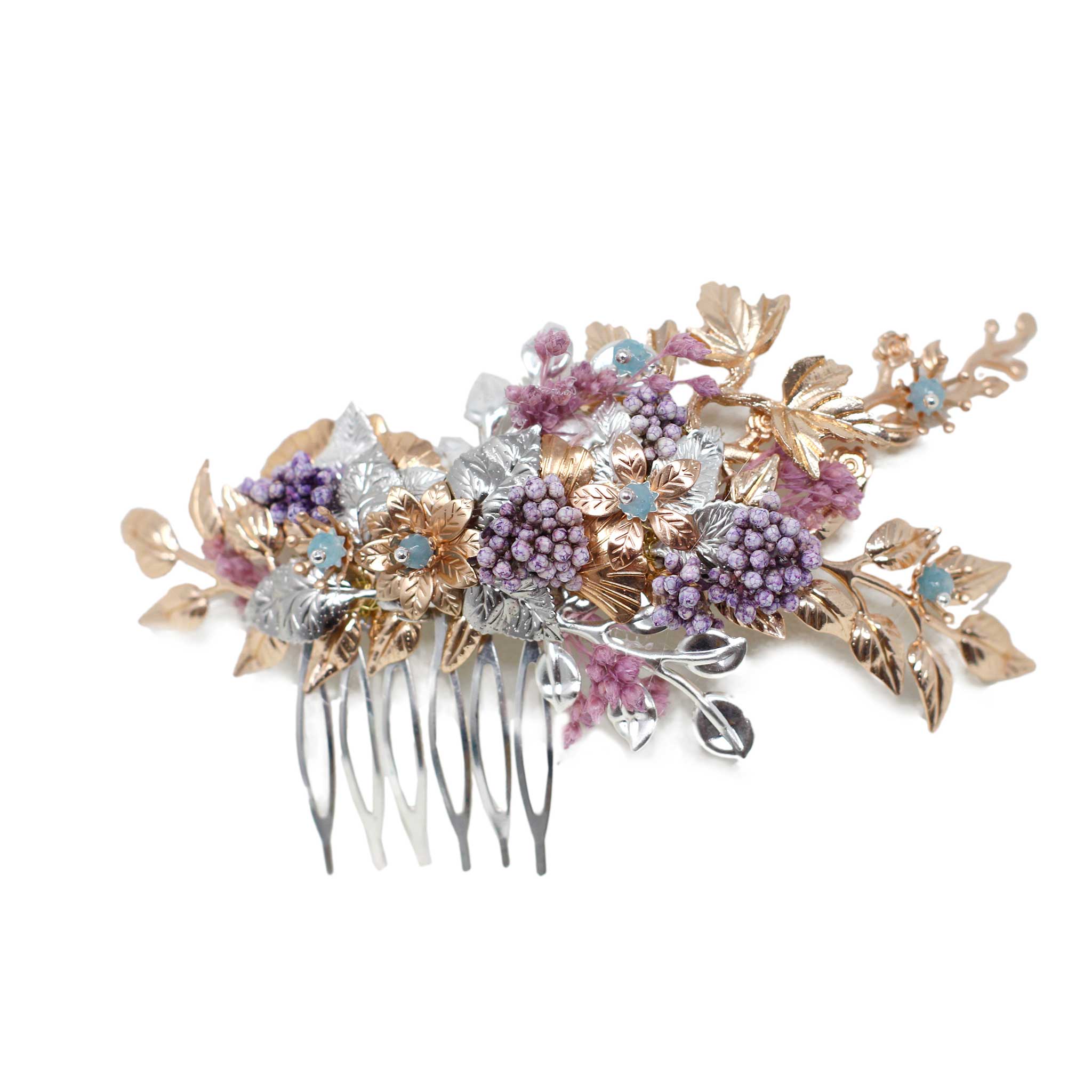 Peineta joya elaborada con piezas doradas y plateadas y detalles de piedrecitas azules.