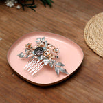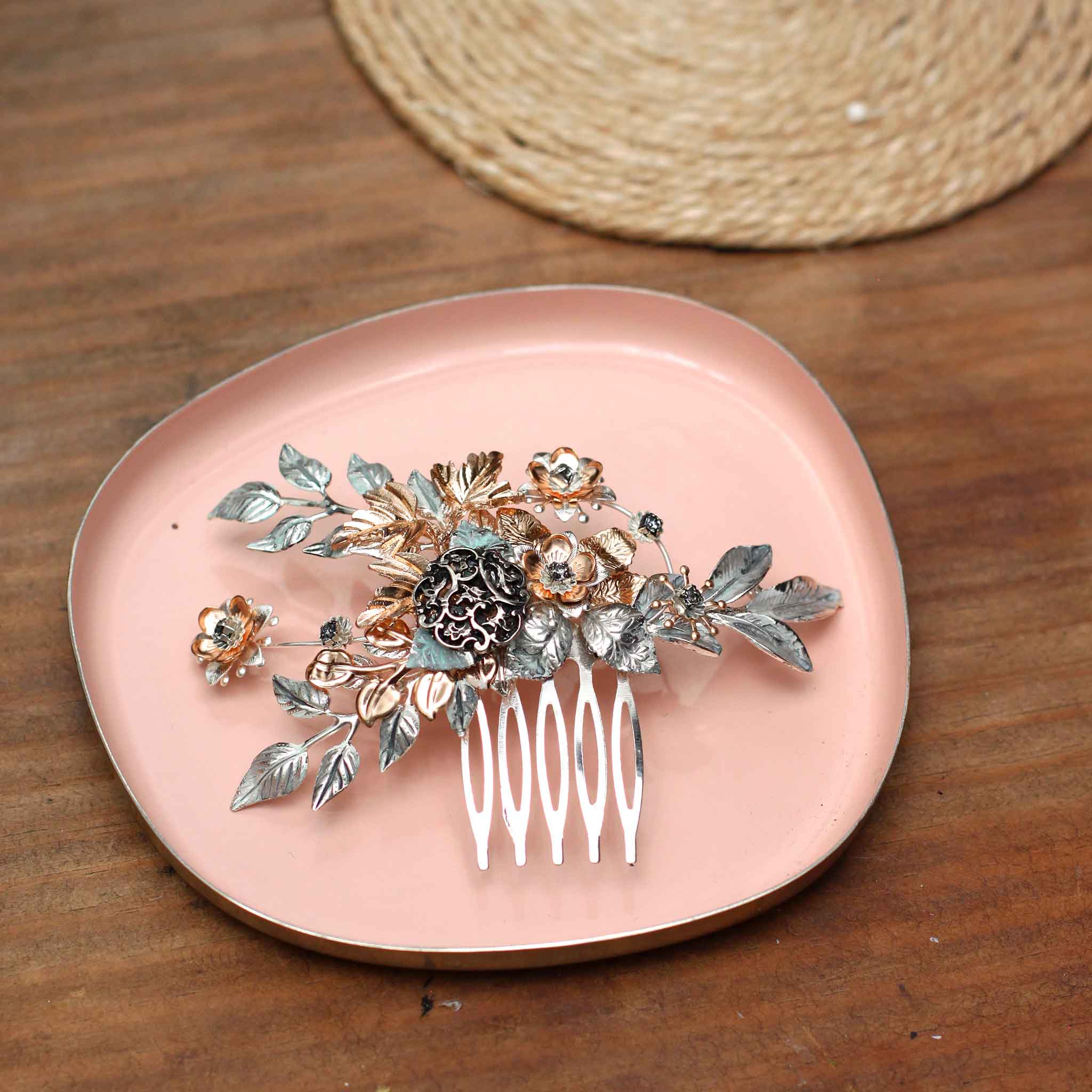 Peineta joya elaborada con piezas doradas y plateadas imitando motivos naturales, con detalles envejecidos pintados a mano.