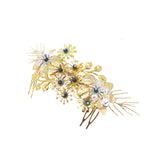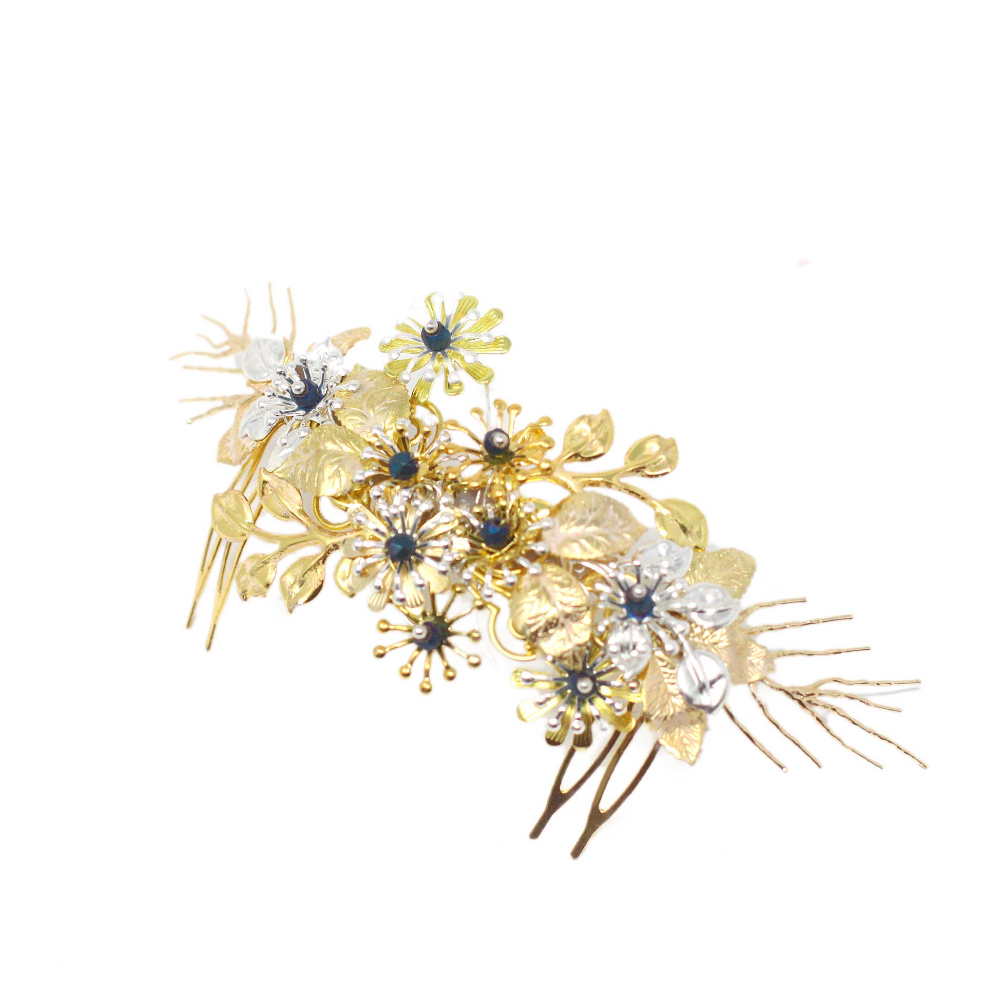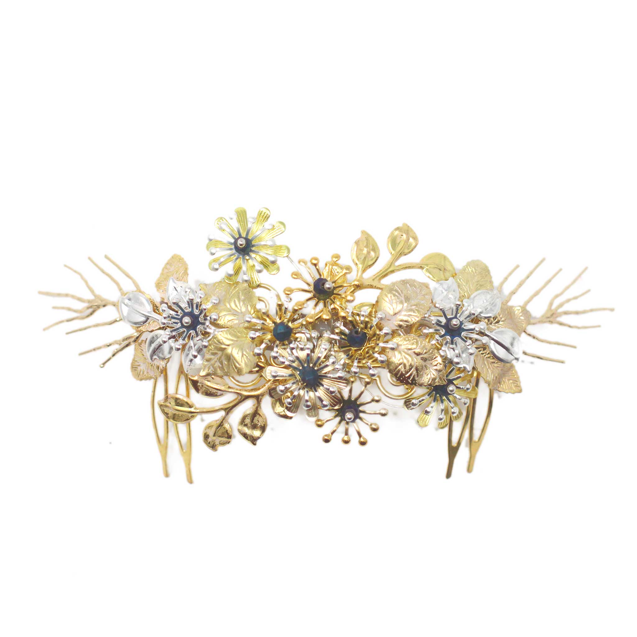 Peineta joya elaborada con piezas doradas y plateadas y detalles de piedrecitas azules.