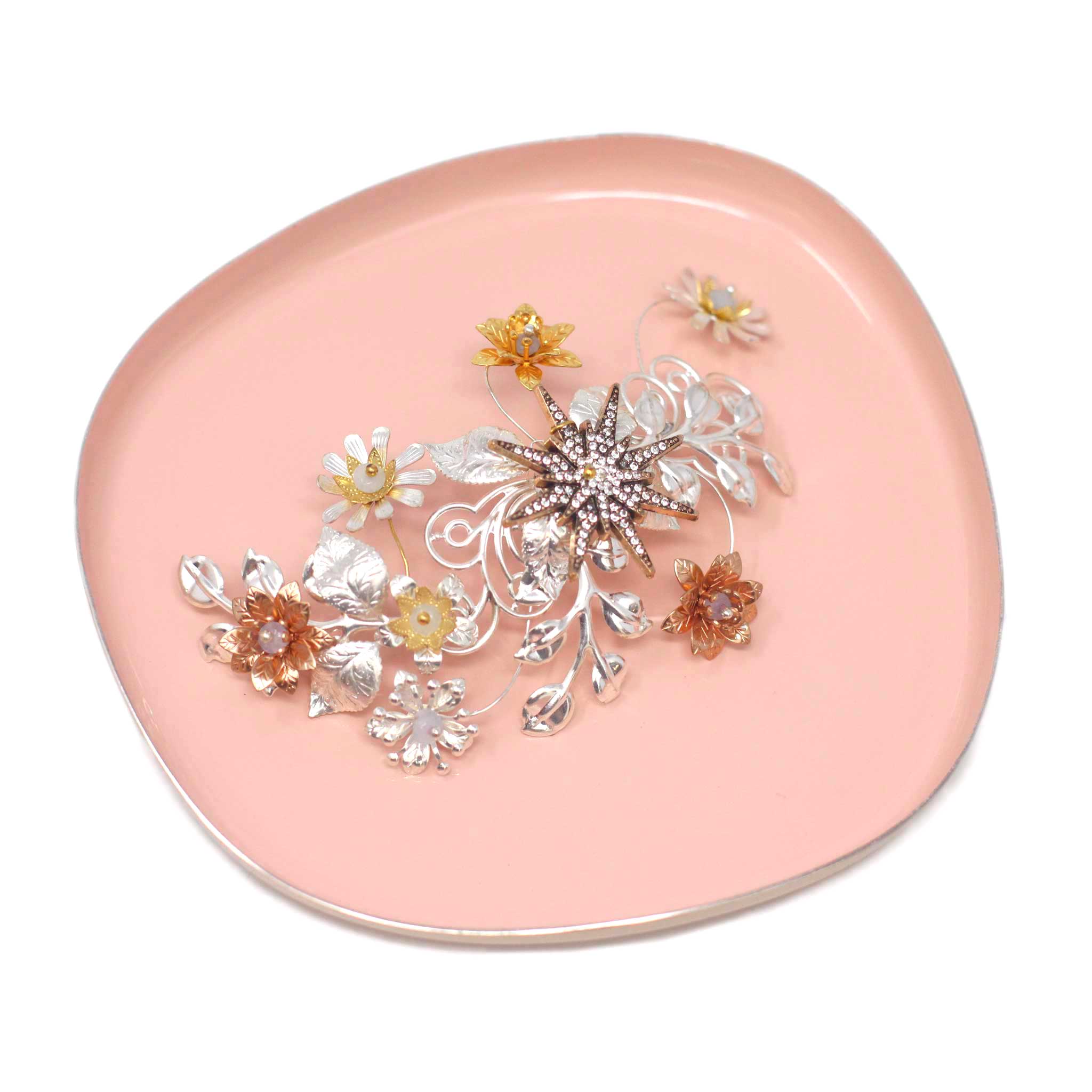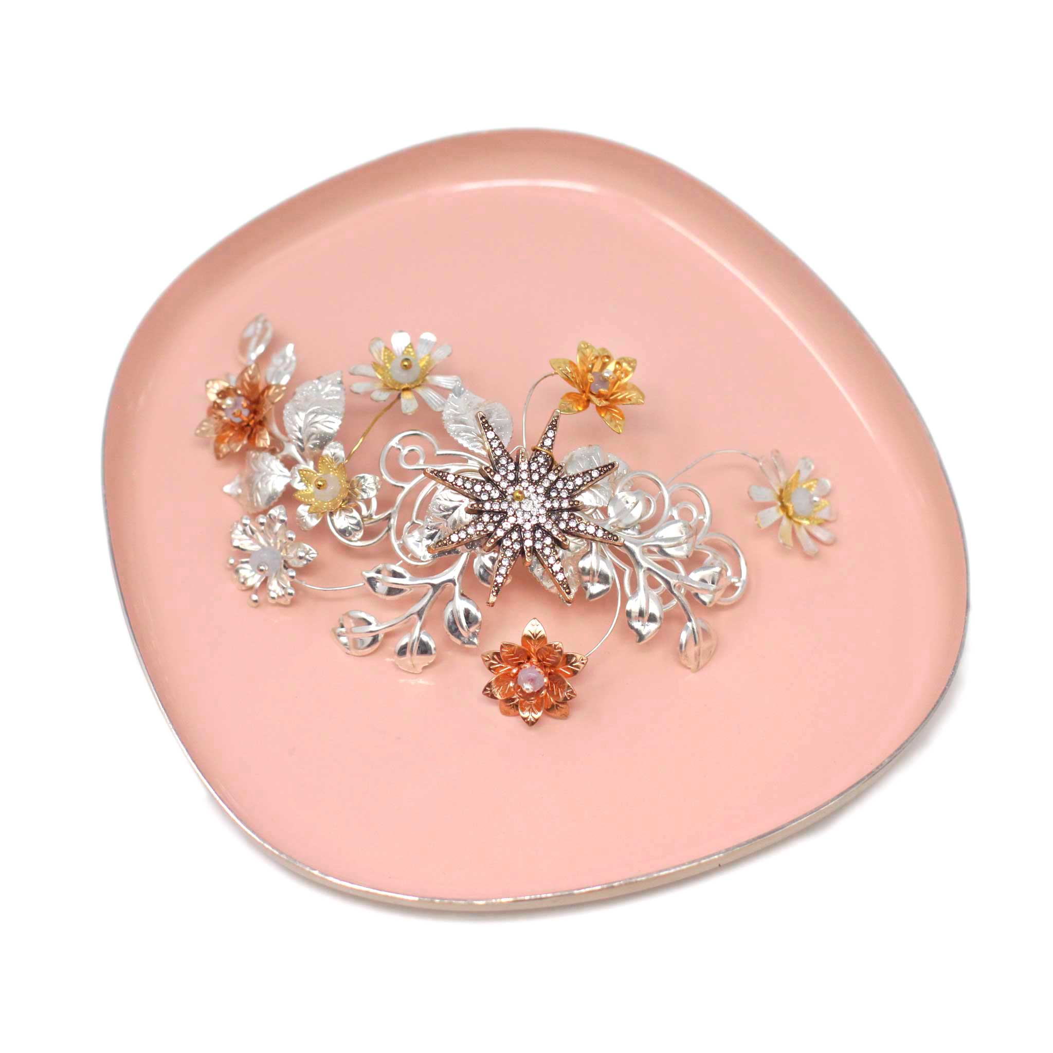 Tocado muy versátil debido a la gran flexibilidad de sus piezas que permite colocar esta preciosidad de muchas maneras diferentes : desde una semi corona tradicional a un tocado lateral. Nos encanta esta pieza porque no es demasiado recargada pero su presencia no pasa desapercibida.