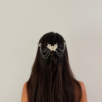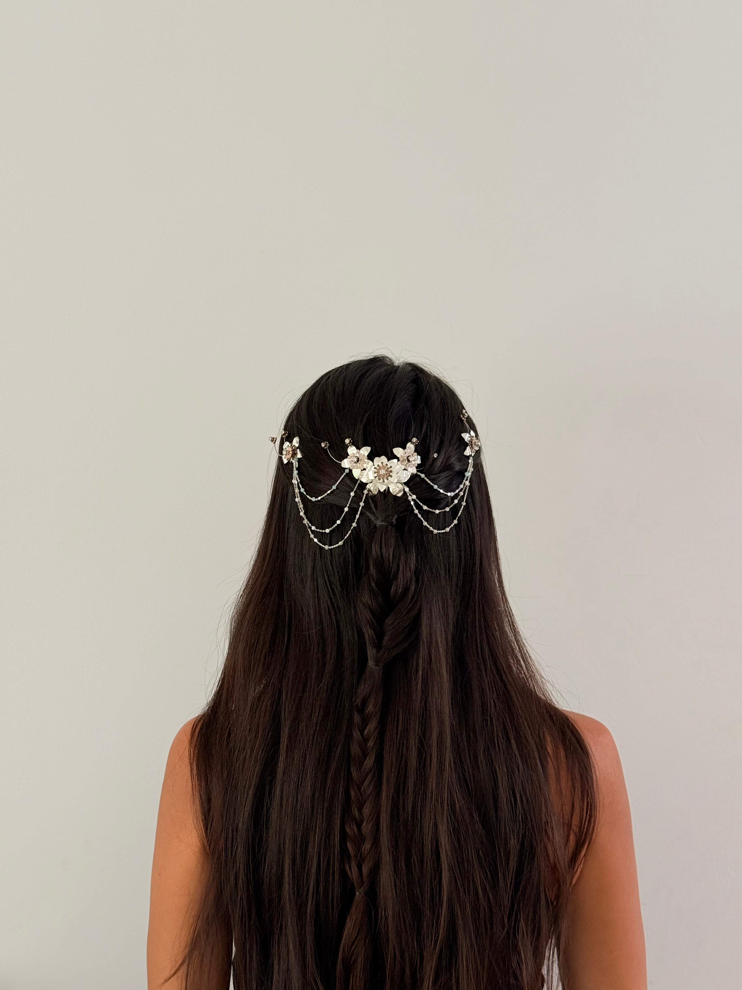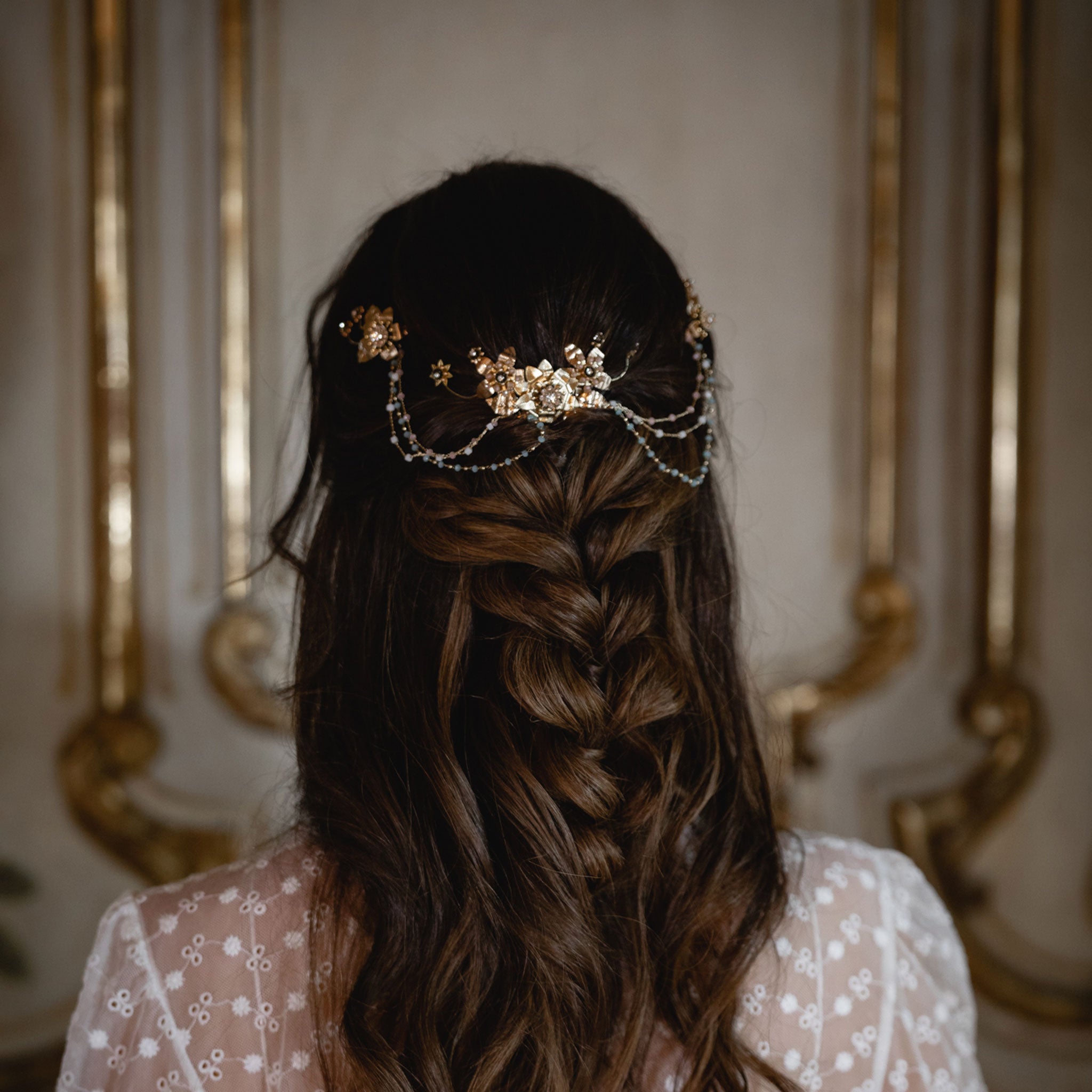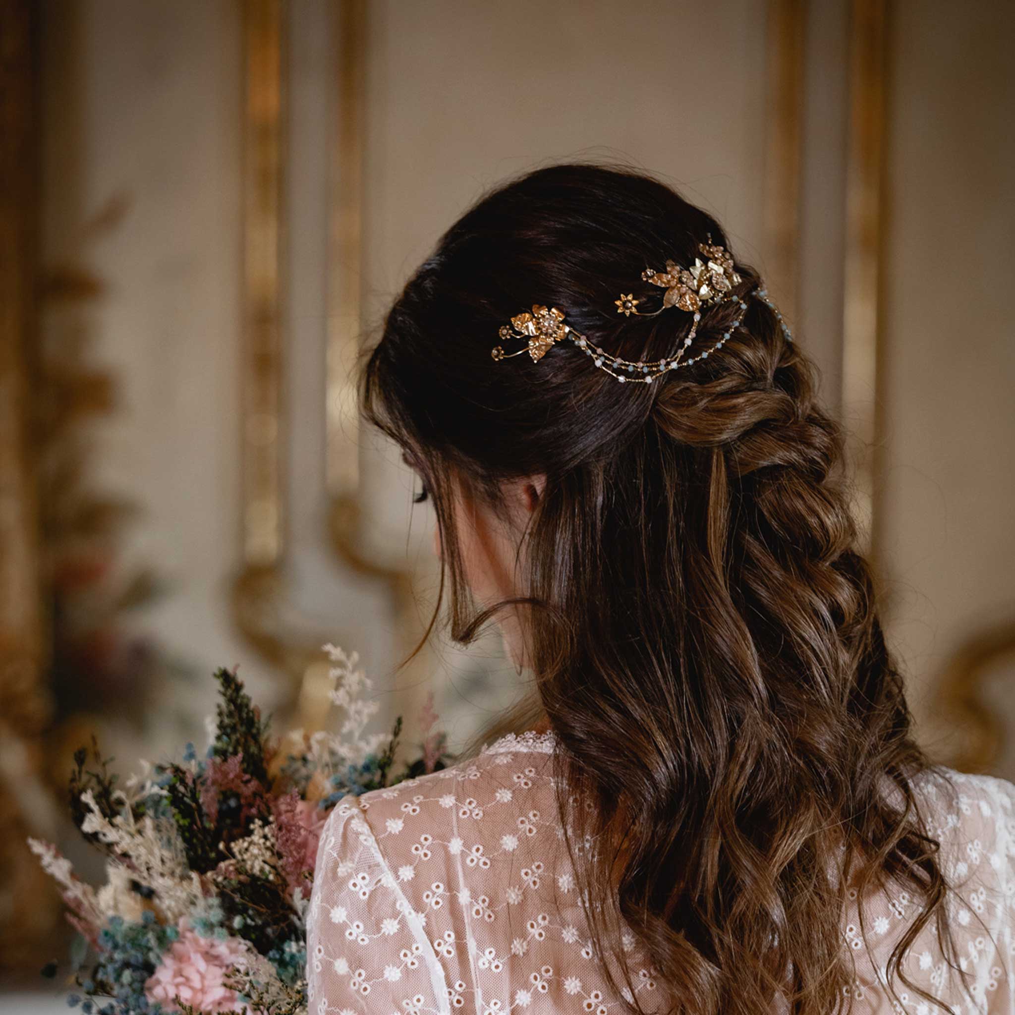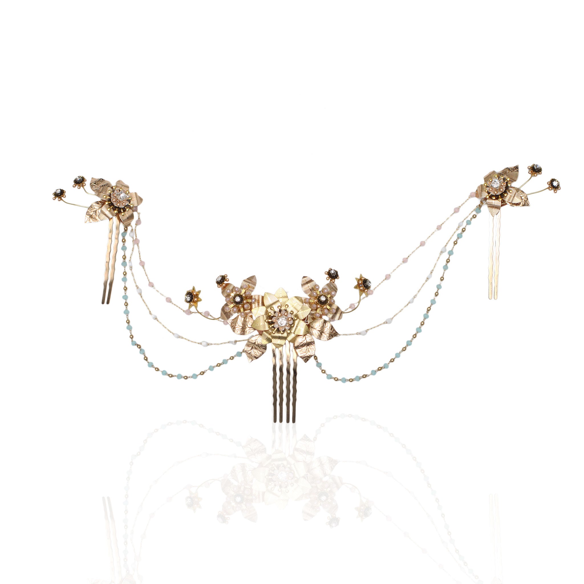 Peineta joya de inspiración floral elaborada con piezas doradas y plateadas y pistilos, rematadas con detalles de perlas.