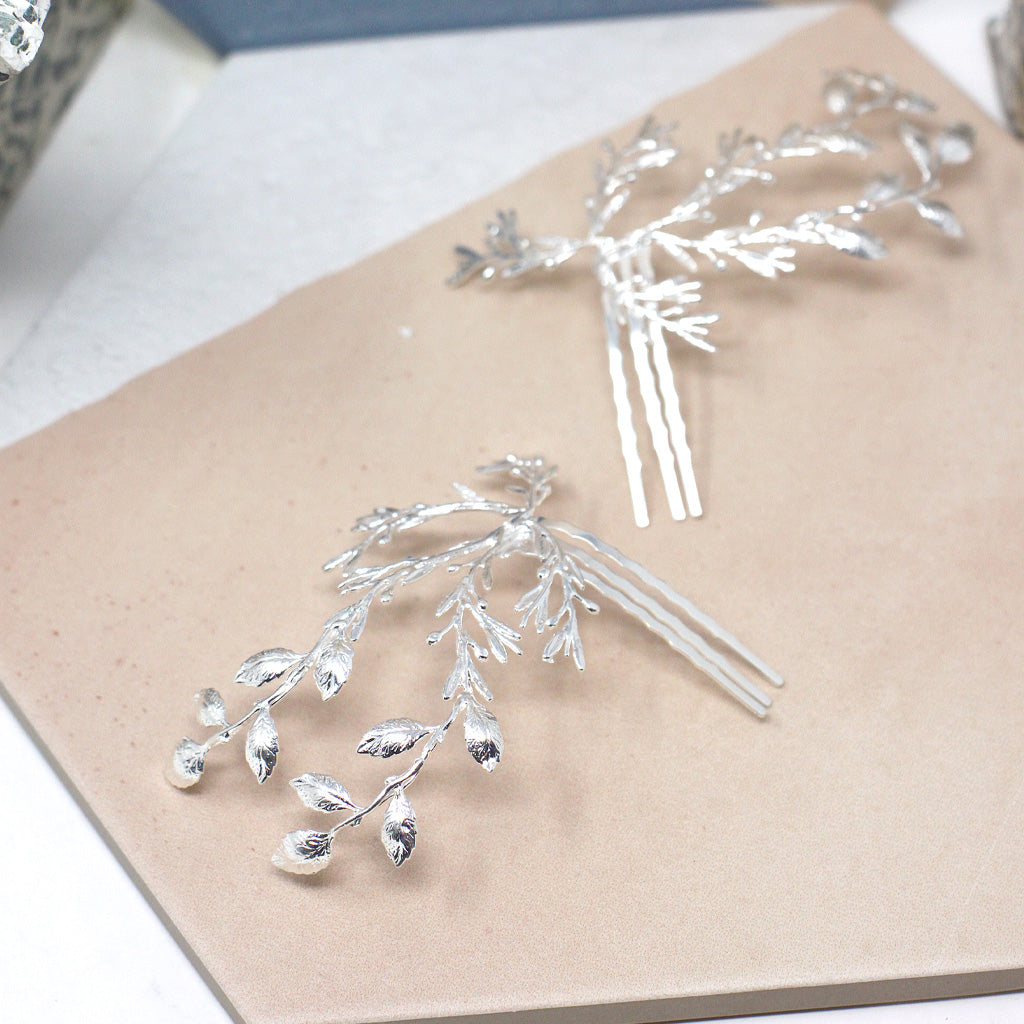 Peineta joya realizada a mano en nuestro atelier con piezas únicas diseñadas por nosotras mismas en latón con un baño de plata de ley en un taller artesano de Cordoba.