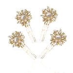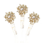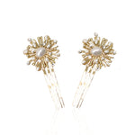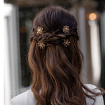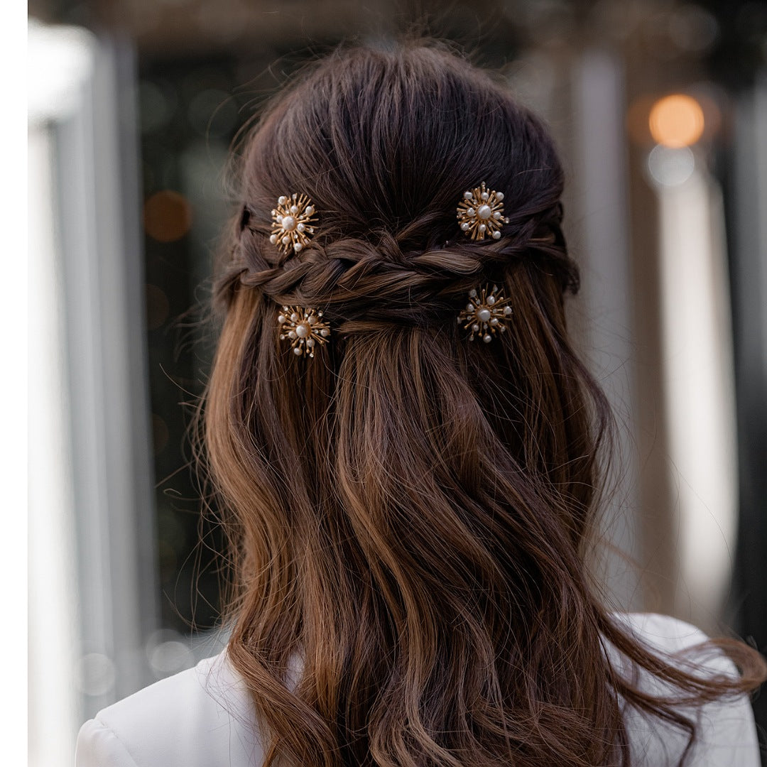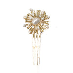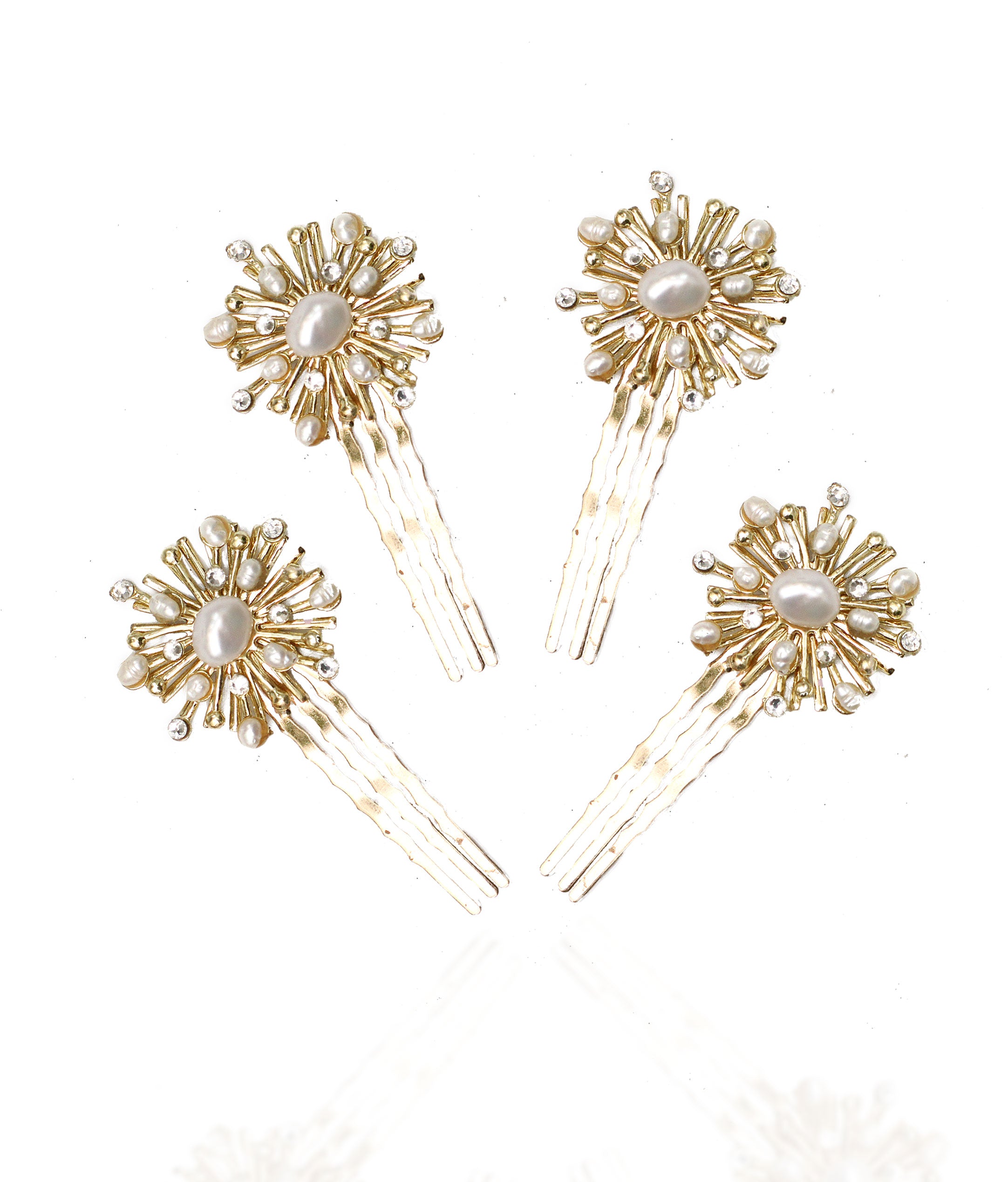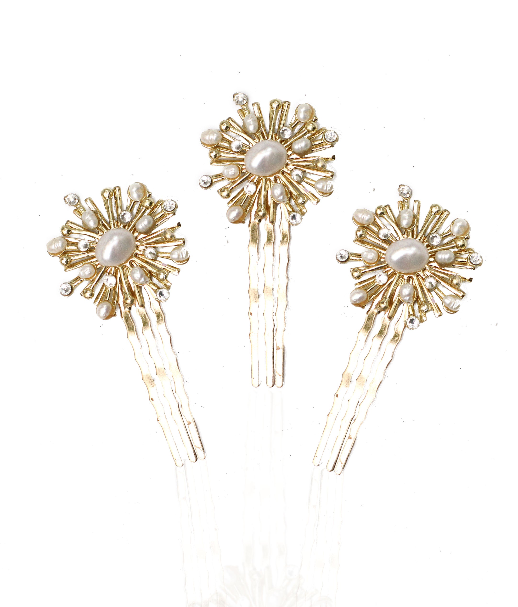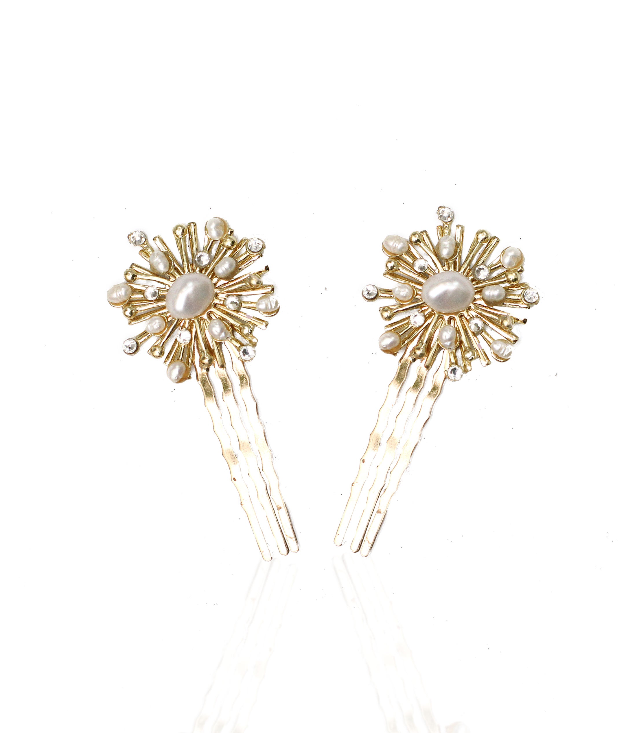 Peinas doradas decoradas con perlas de rio y tanto en su parte central como alrededor además de detalles de brillos. Pieza realizada a mano.