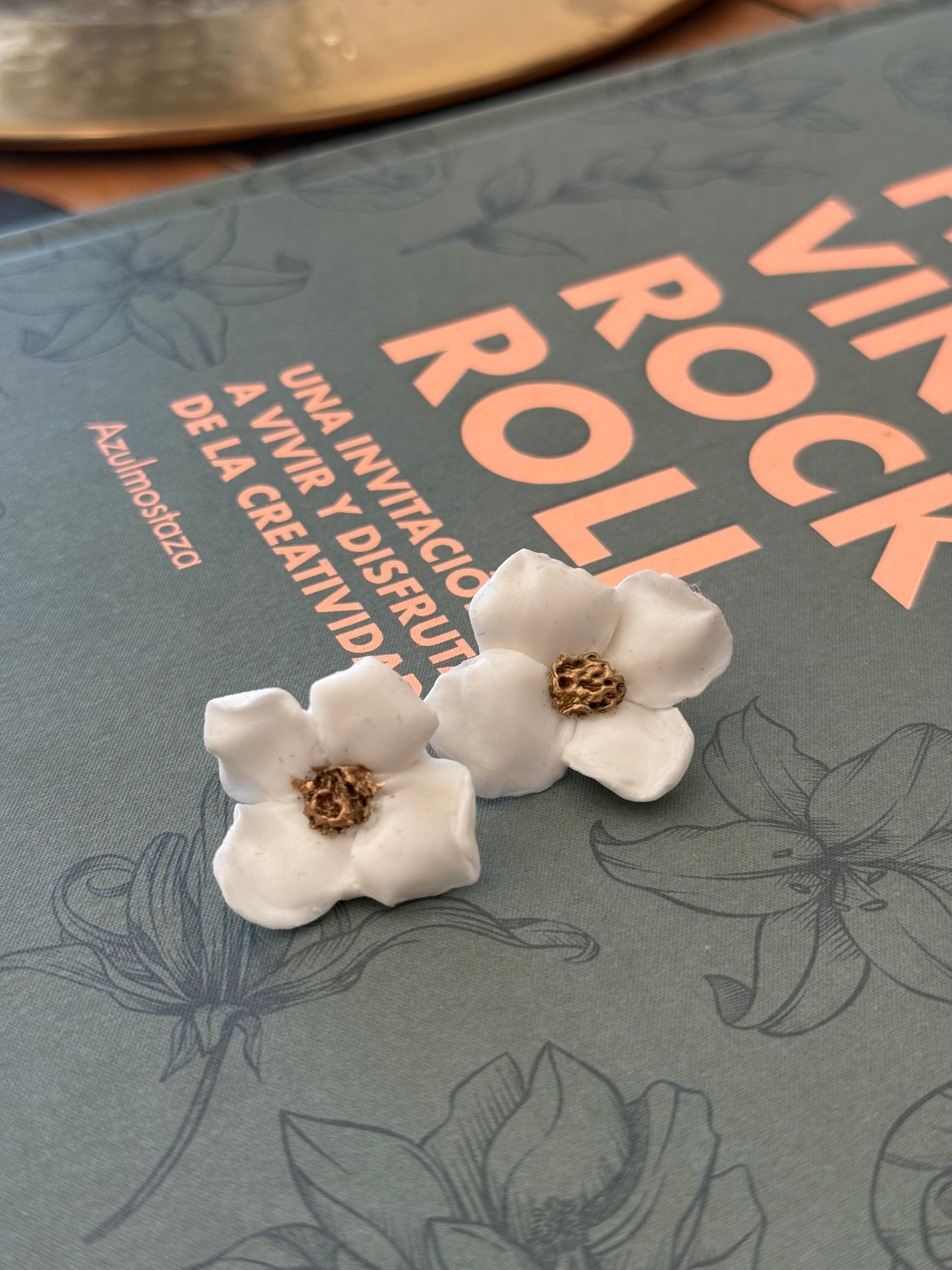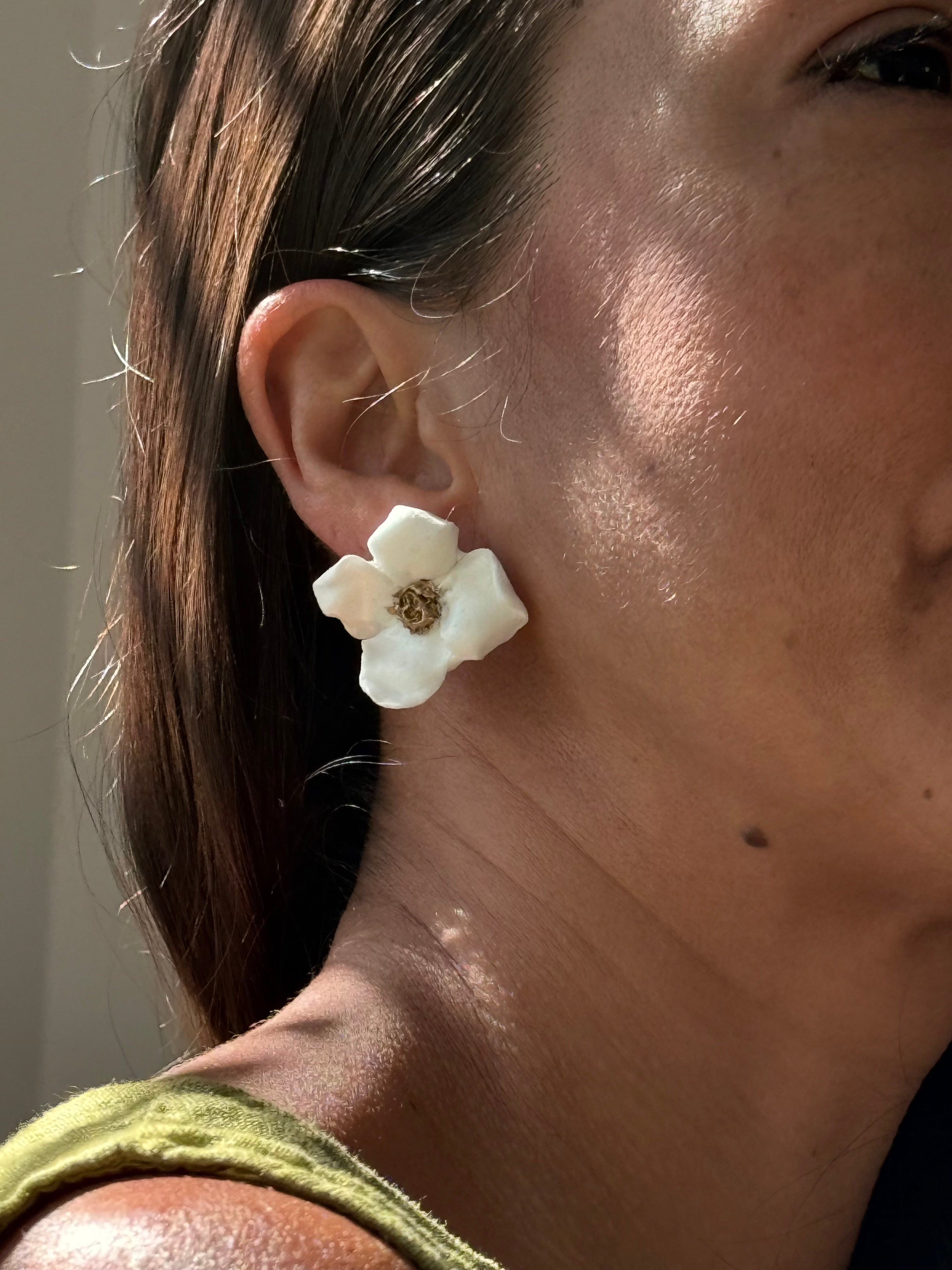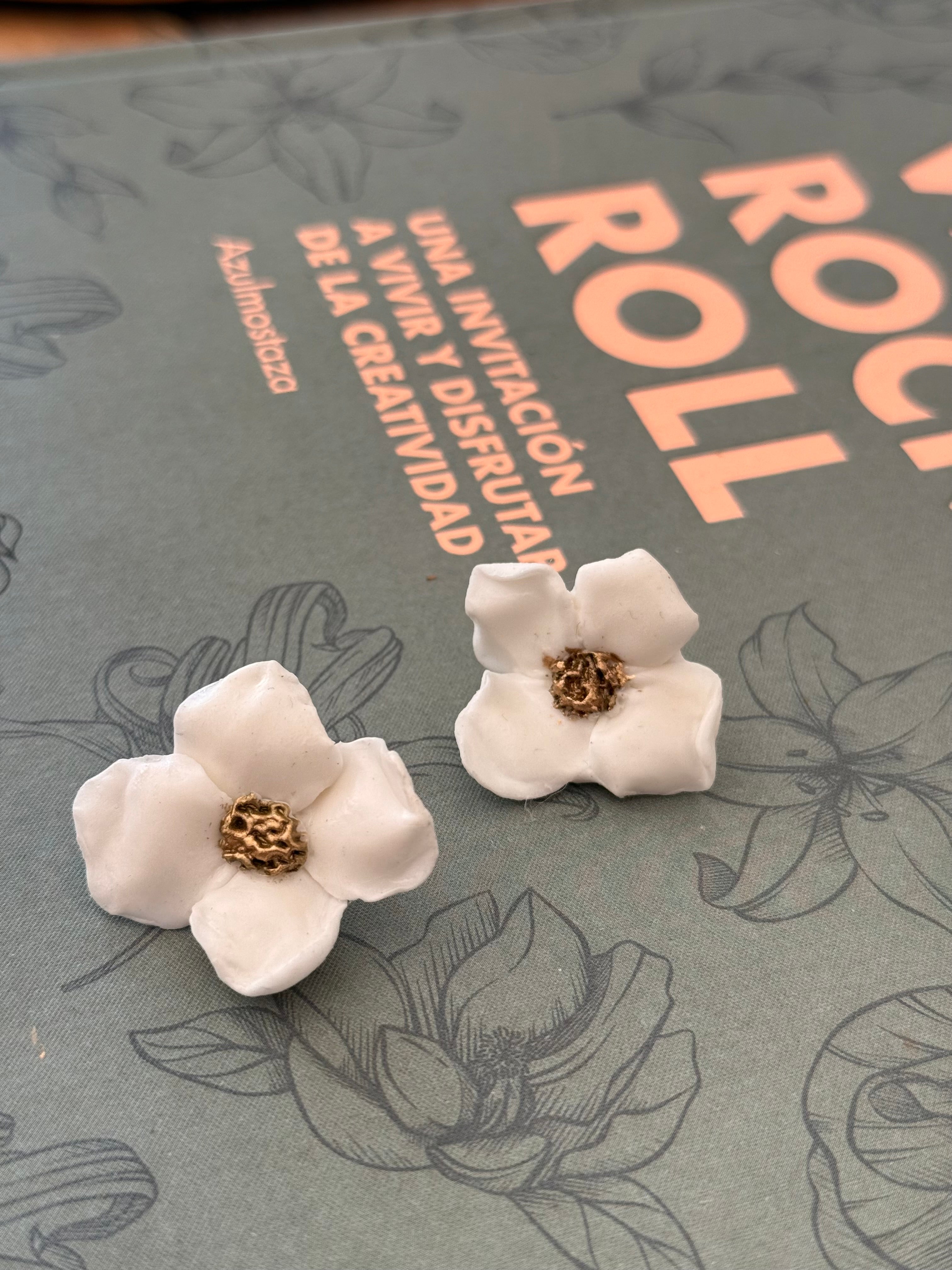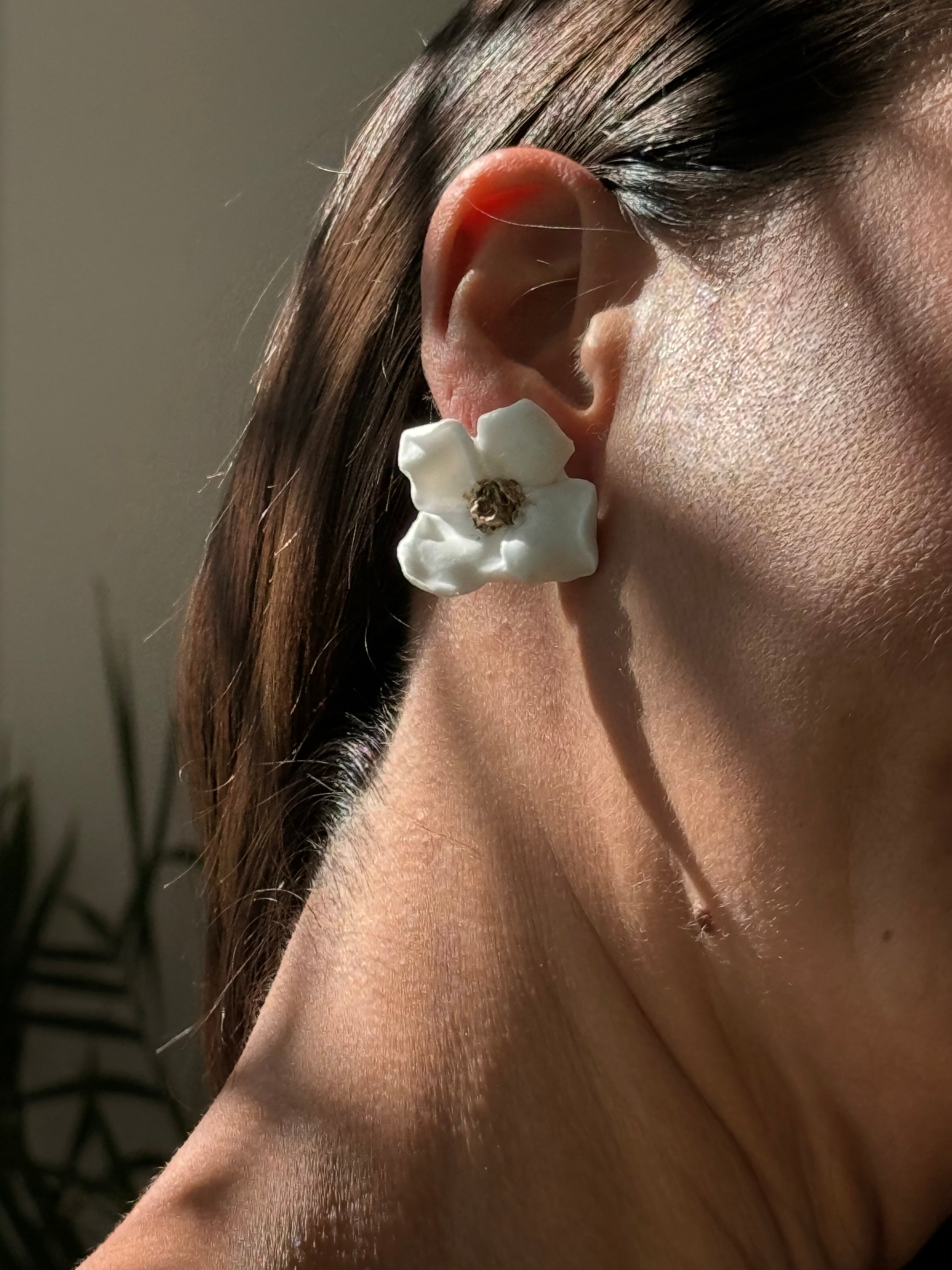 Amina es un pendiente tipo botón formado por una flor modeladas a mano en porcelana fría. Cada flor blanca está delicadamente rematada con toques dorados que aportan calidez, luz y una sutil sofisticación al rostro.