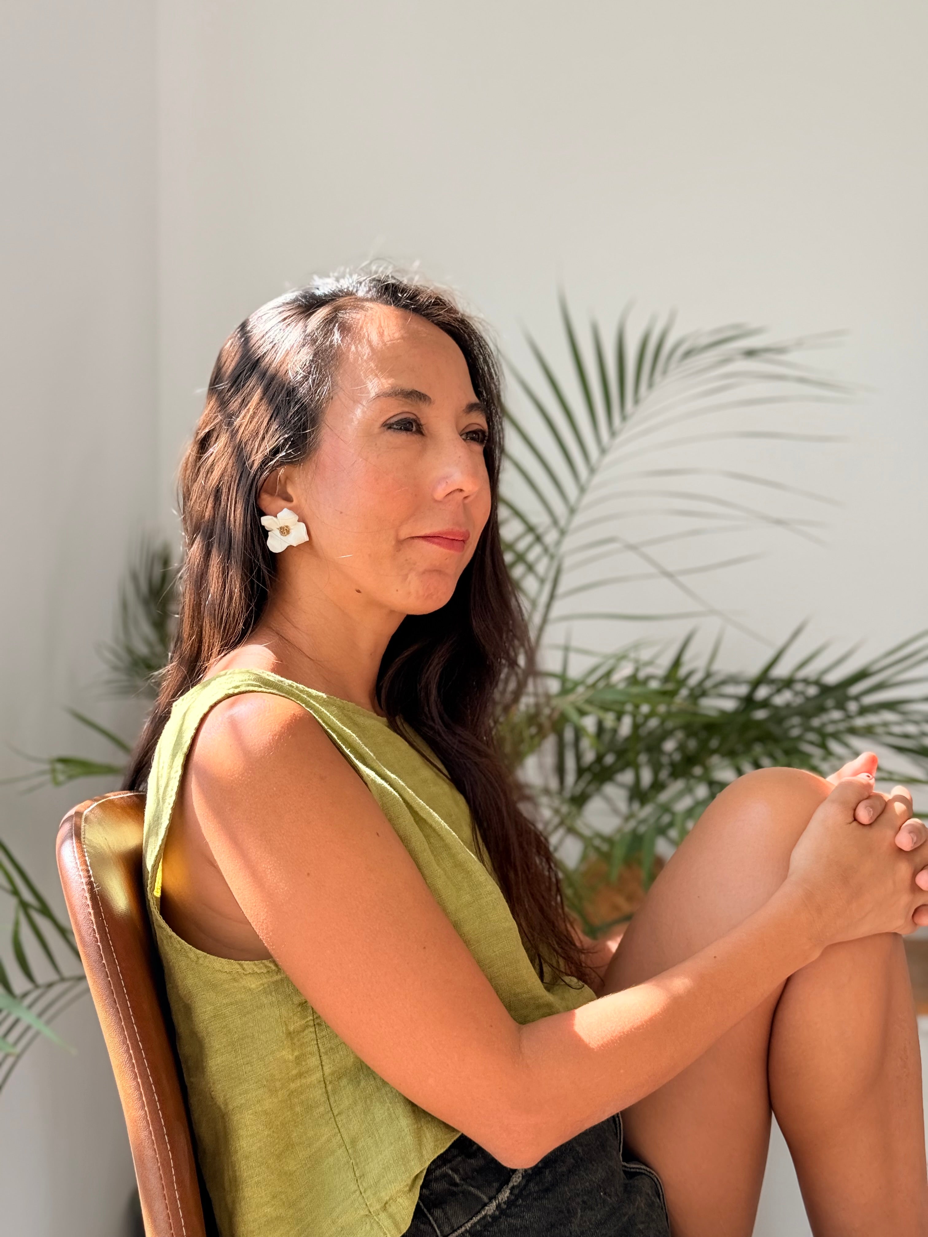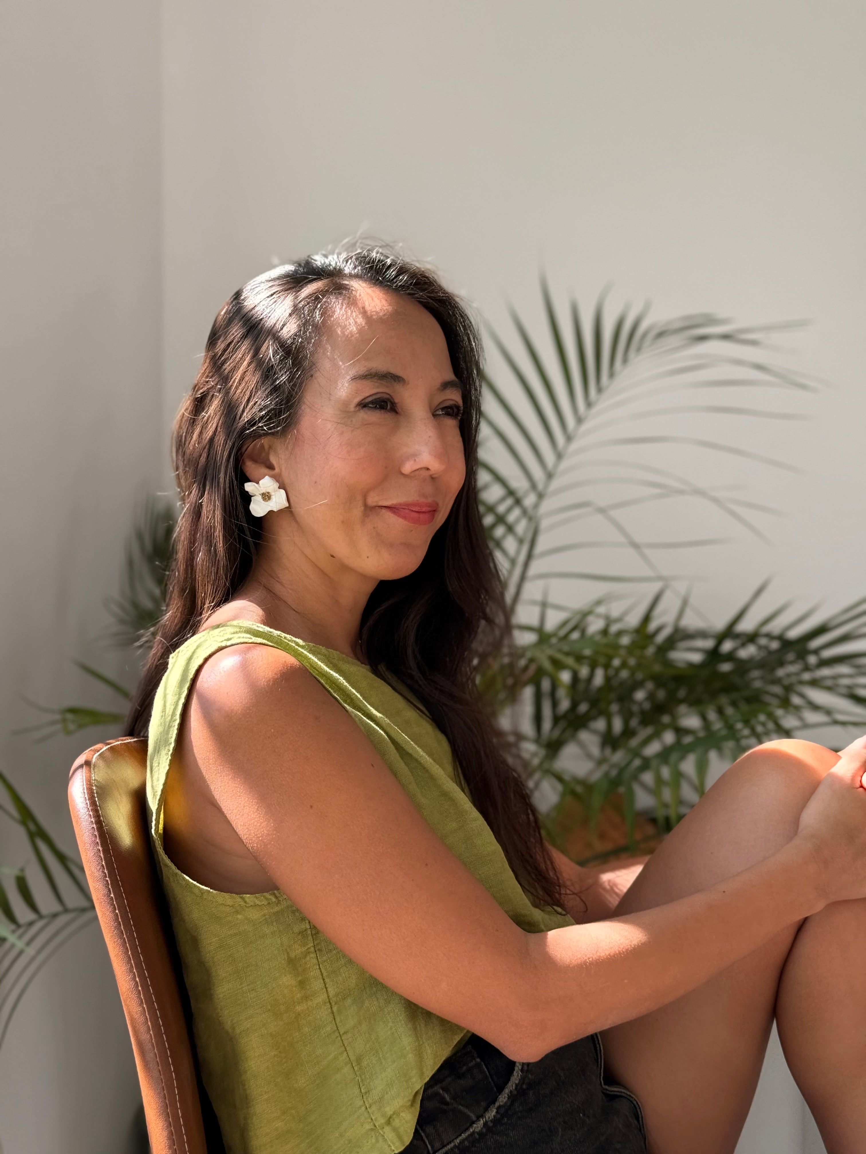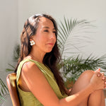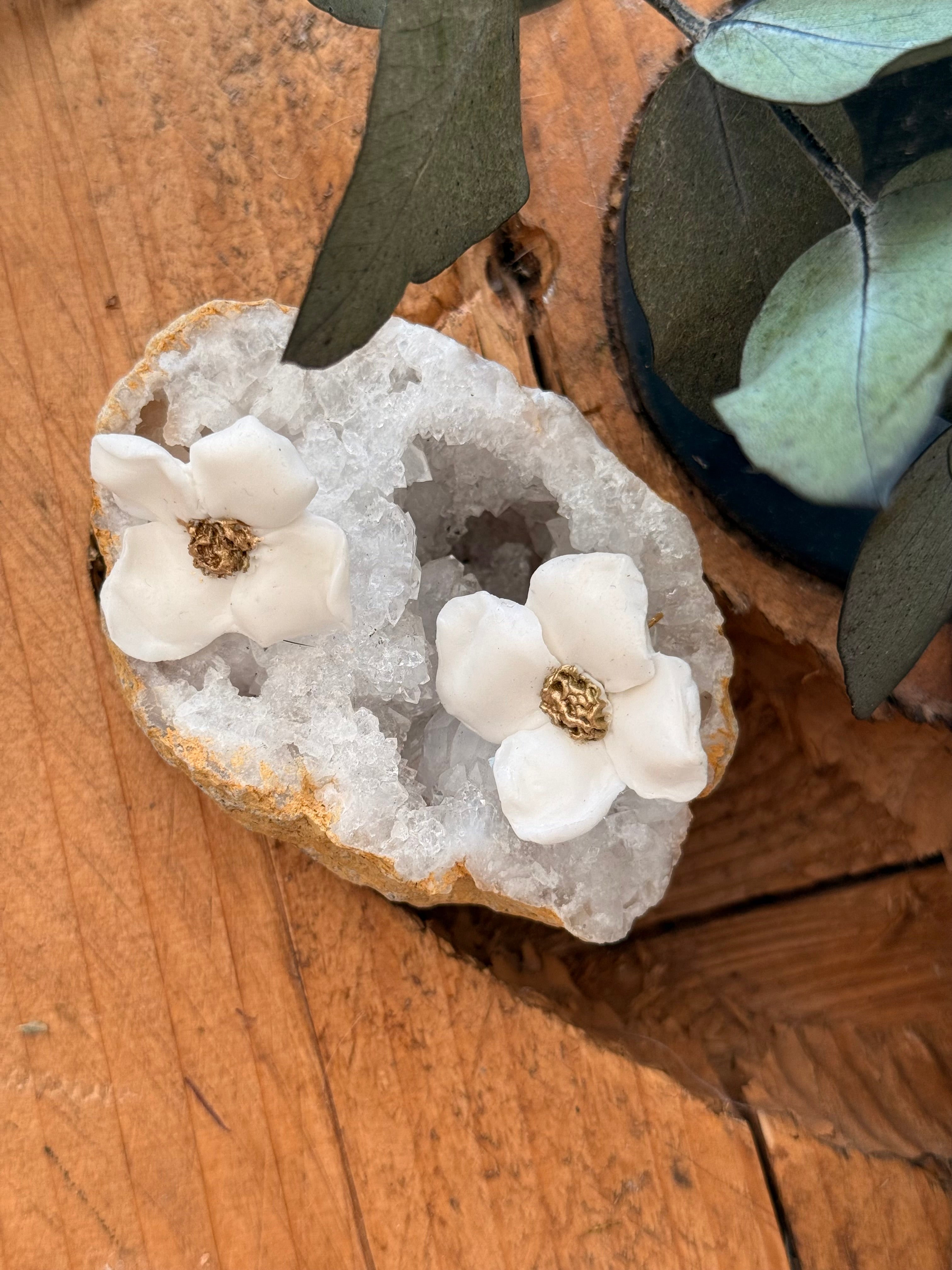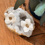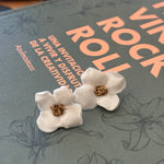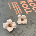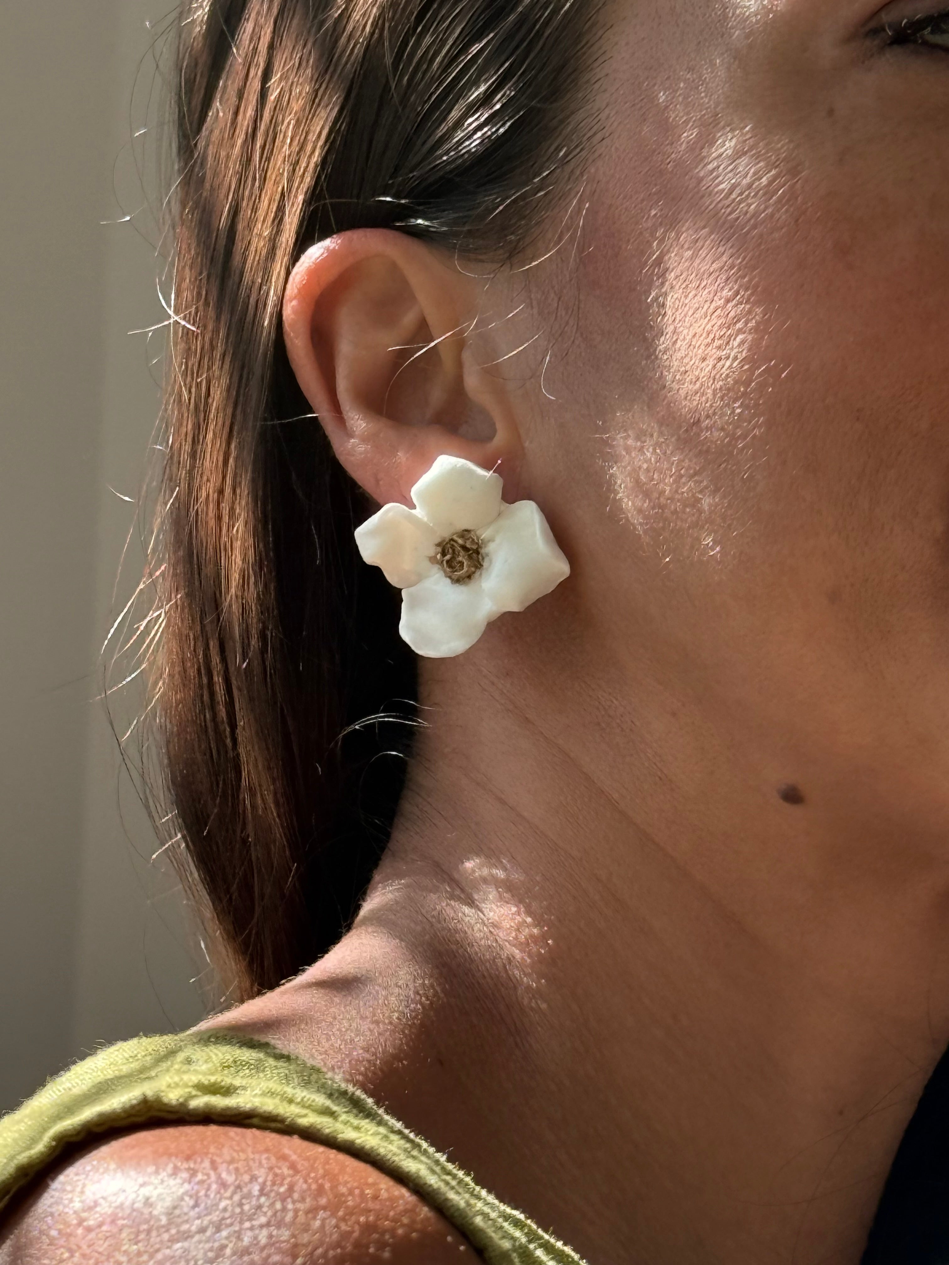 Amina es un pendiente tipo botón formado por una flor modeladas a mano en porcelana fría. Cada flor blanca está delicadamente rematada con toques dorados que aportan calidez, luz y una sutil sofisticación al rostro.