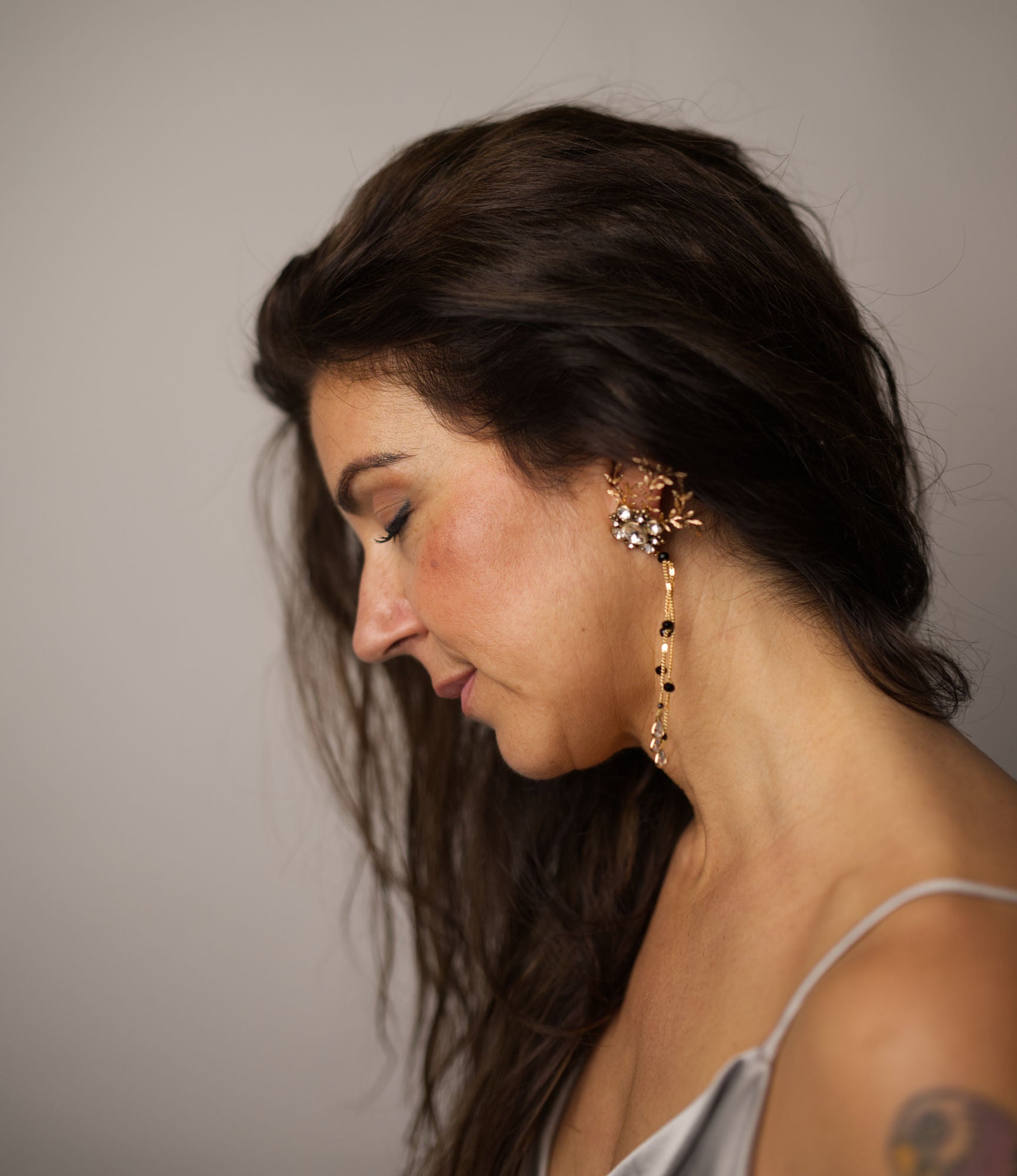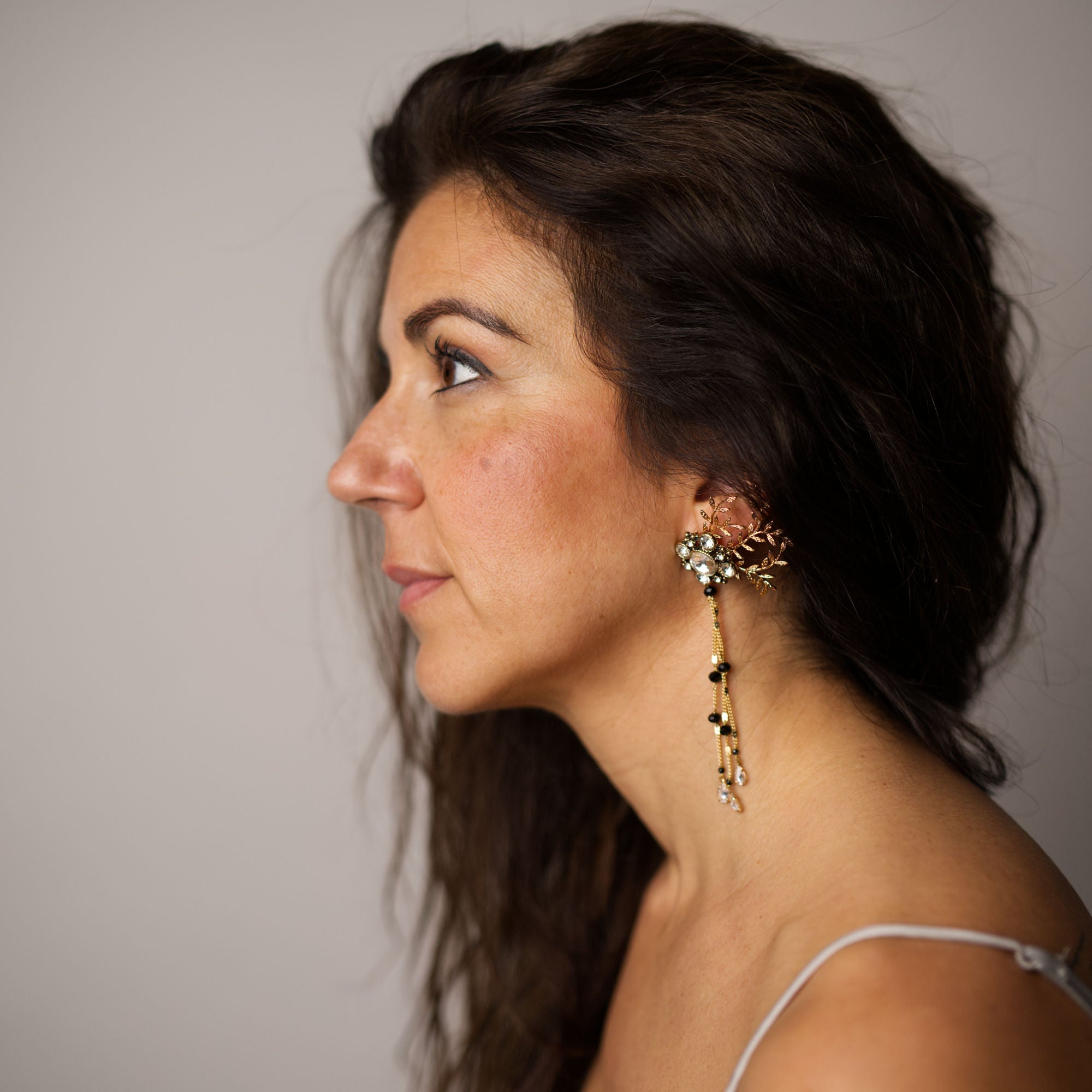 El diseño parte de un rosetón principal de estilo vintage, decorado con cristales, que actúa como pieza central. Desde él nacen ramas delicadas con movimiento, aportando ligereza y un gesto orgánico al conjunto. Del rosetón cuelgan finas cadenas con pequeñas cuentas de cristal, rematadas con una lagrimita, creando un efecto sutil, femenino y muy armonioso al moverse.