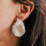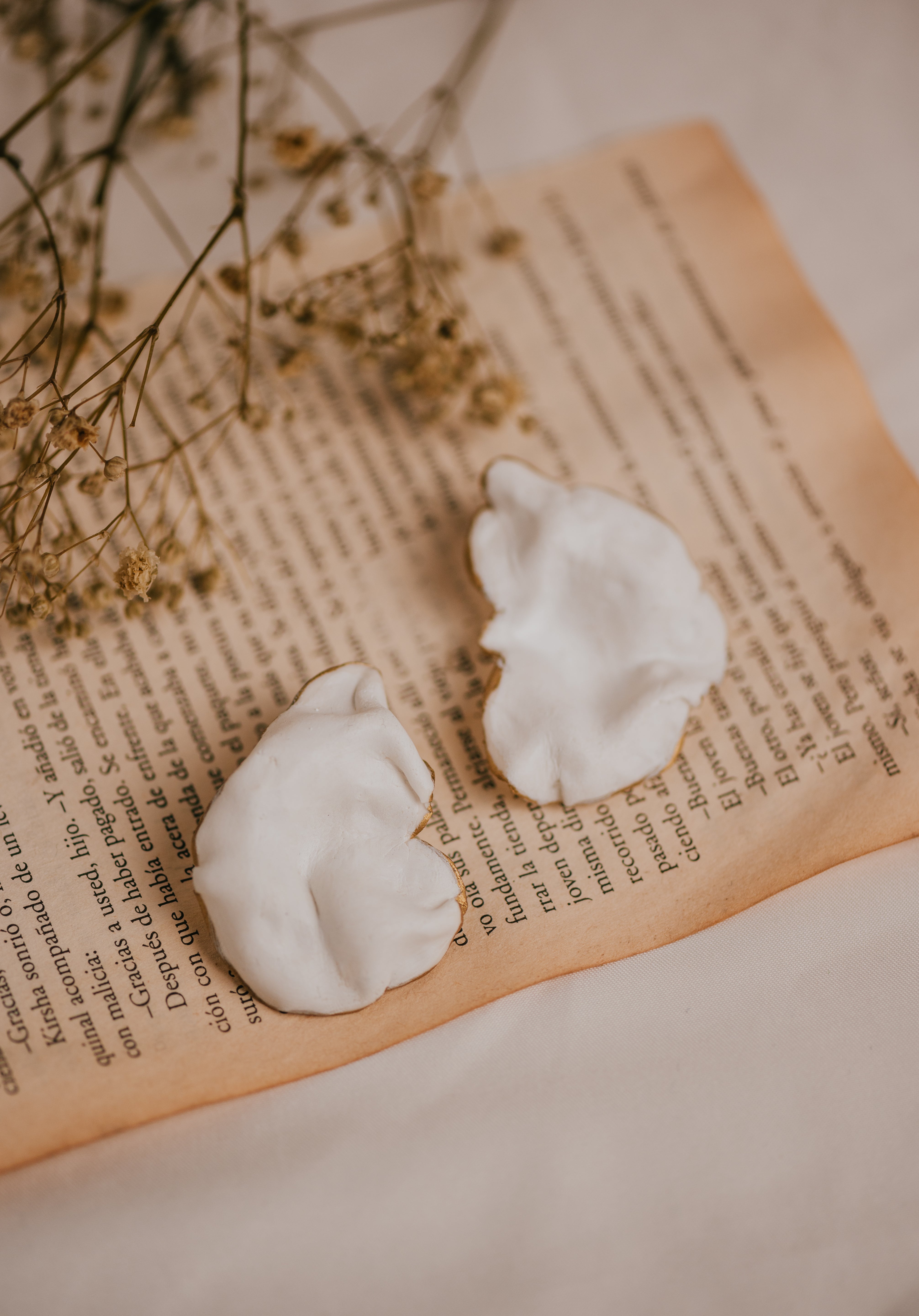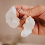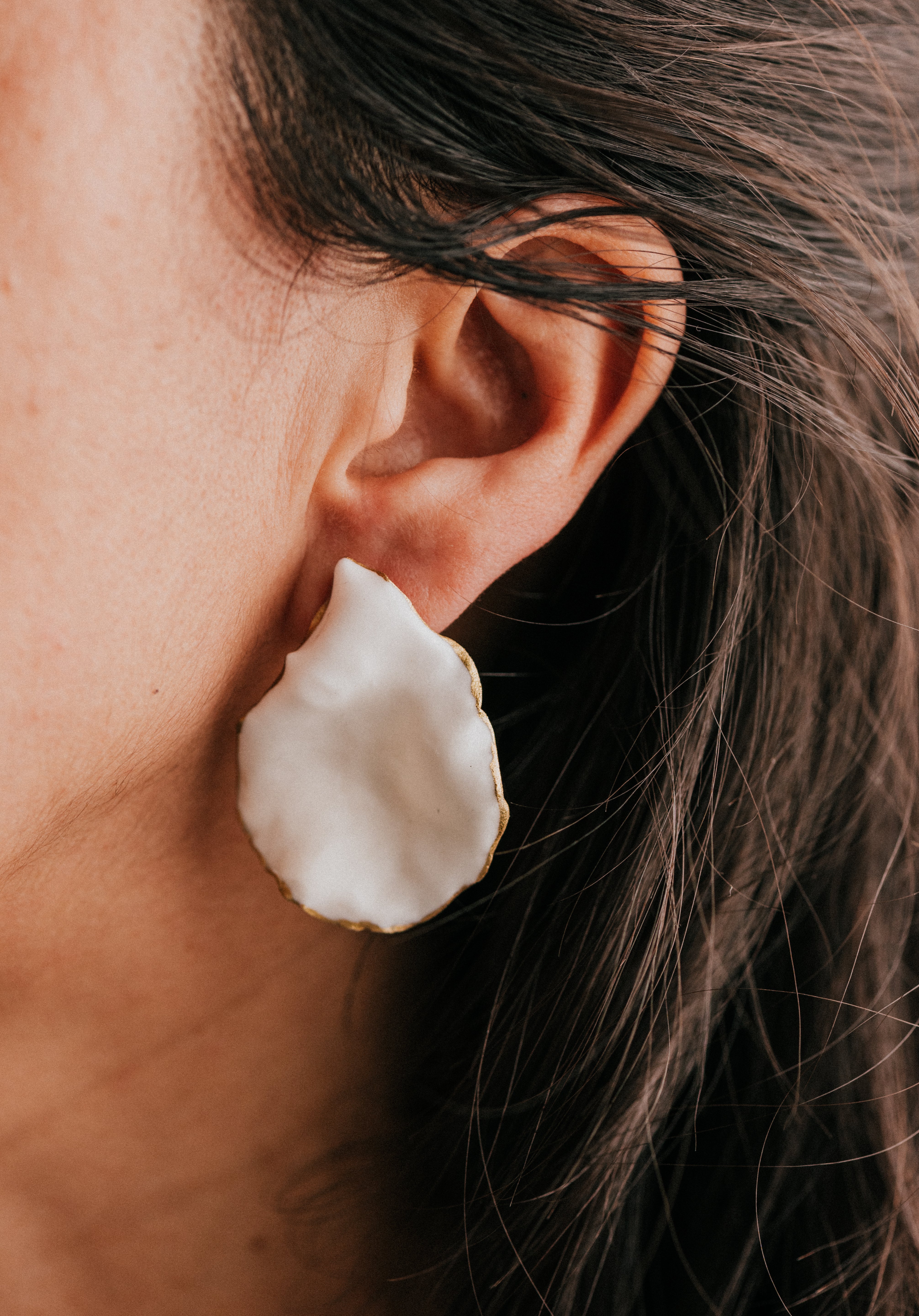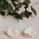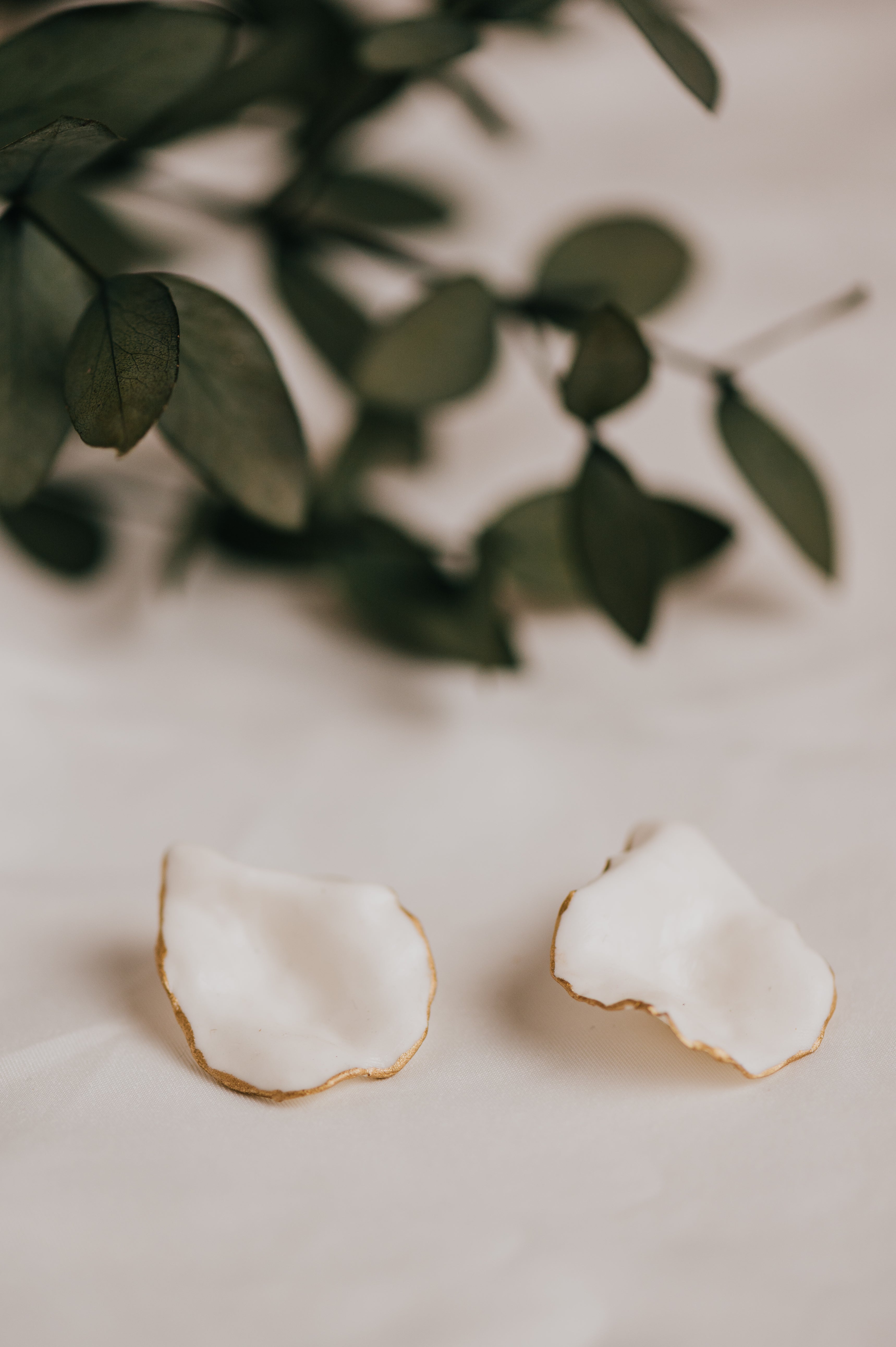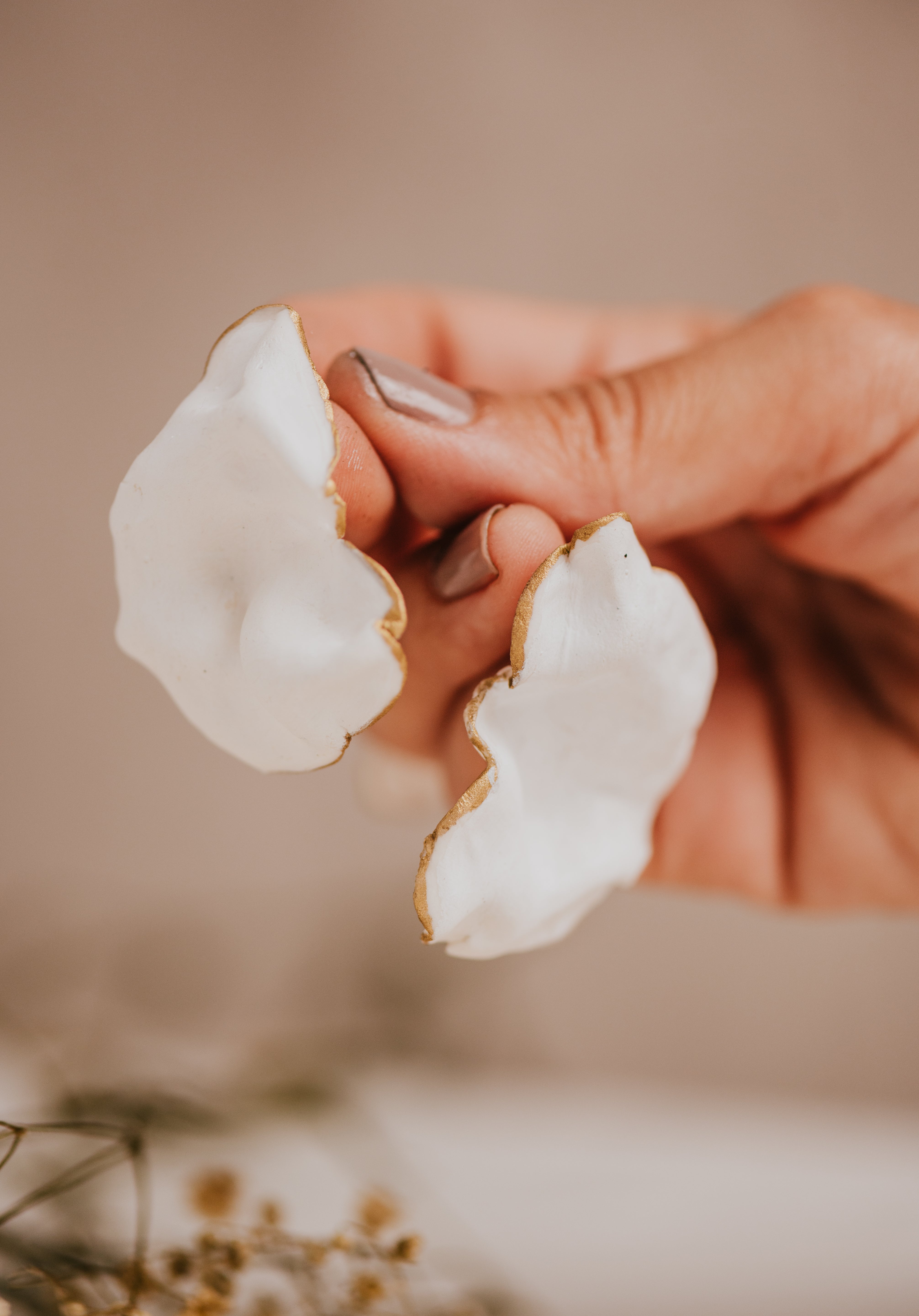 Pendientes hoja blanca con ribete dorado, hechos a mano en porcelana. Diseño orgánico, elegante y cómodo. Ideal para bodas, regalos o diario.