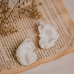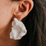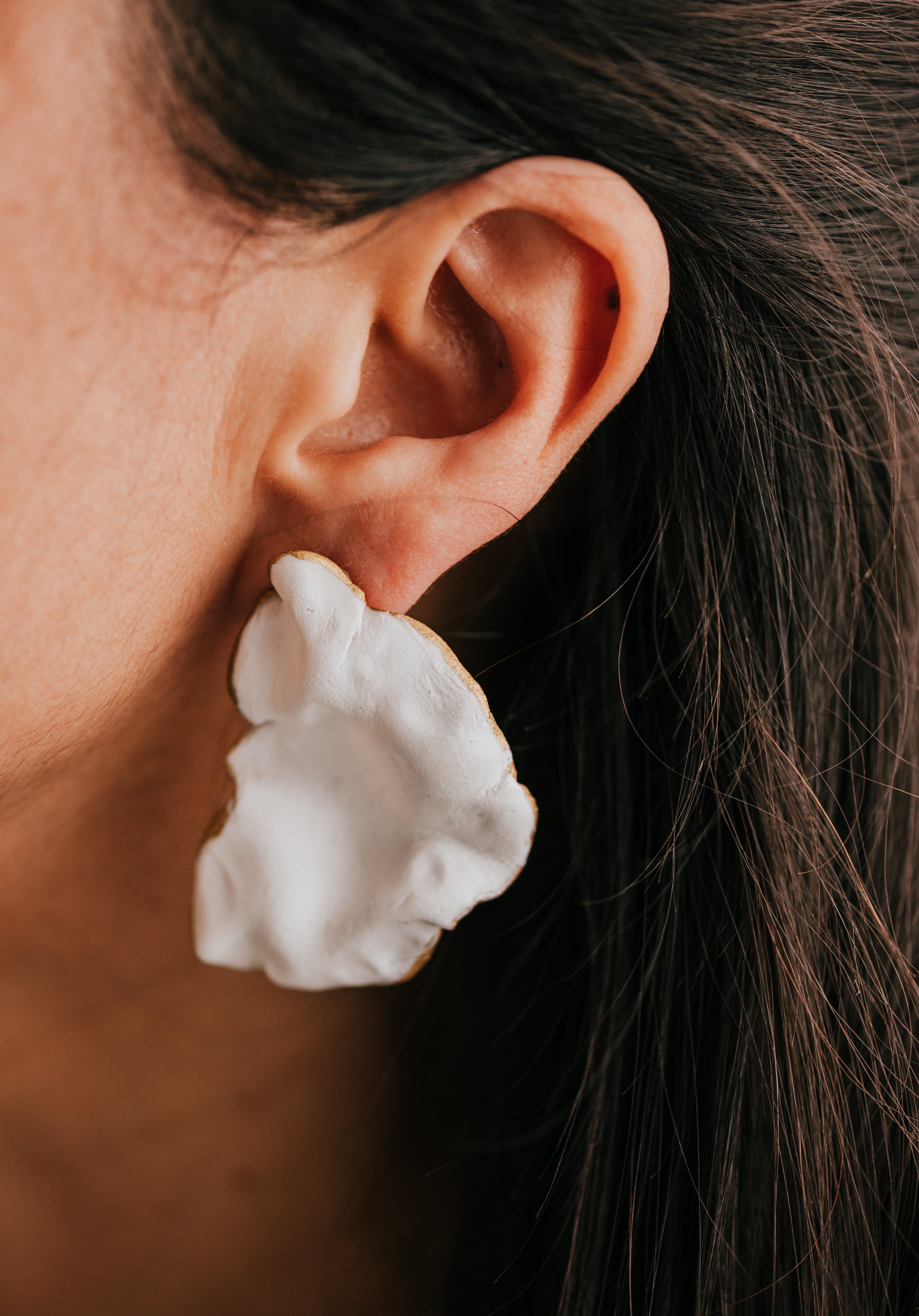 Azahara es un pendiente moldeado a mano en porcelana fría con forma de hoja estilizada. Su silueta orgánica, que recorre el lóbulo como una lágrima de la naturaleza, está esmaltada en blanco con un delicado ribete dorado que realza su forma y añade luz al rostro.