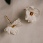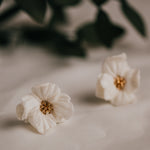 Pendientes flor blanca en porcelana con centro dorado. Elegantes, con volumen sutil y hechos a mano. Ideal para bodas, eventos o diario.