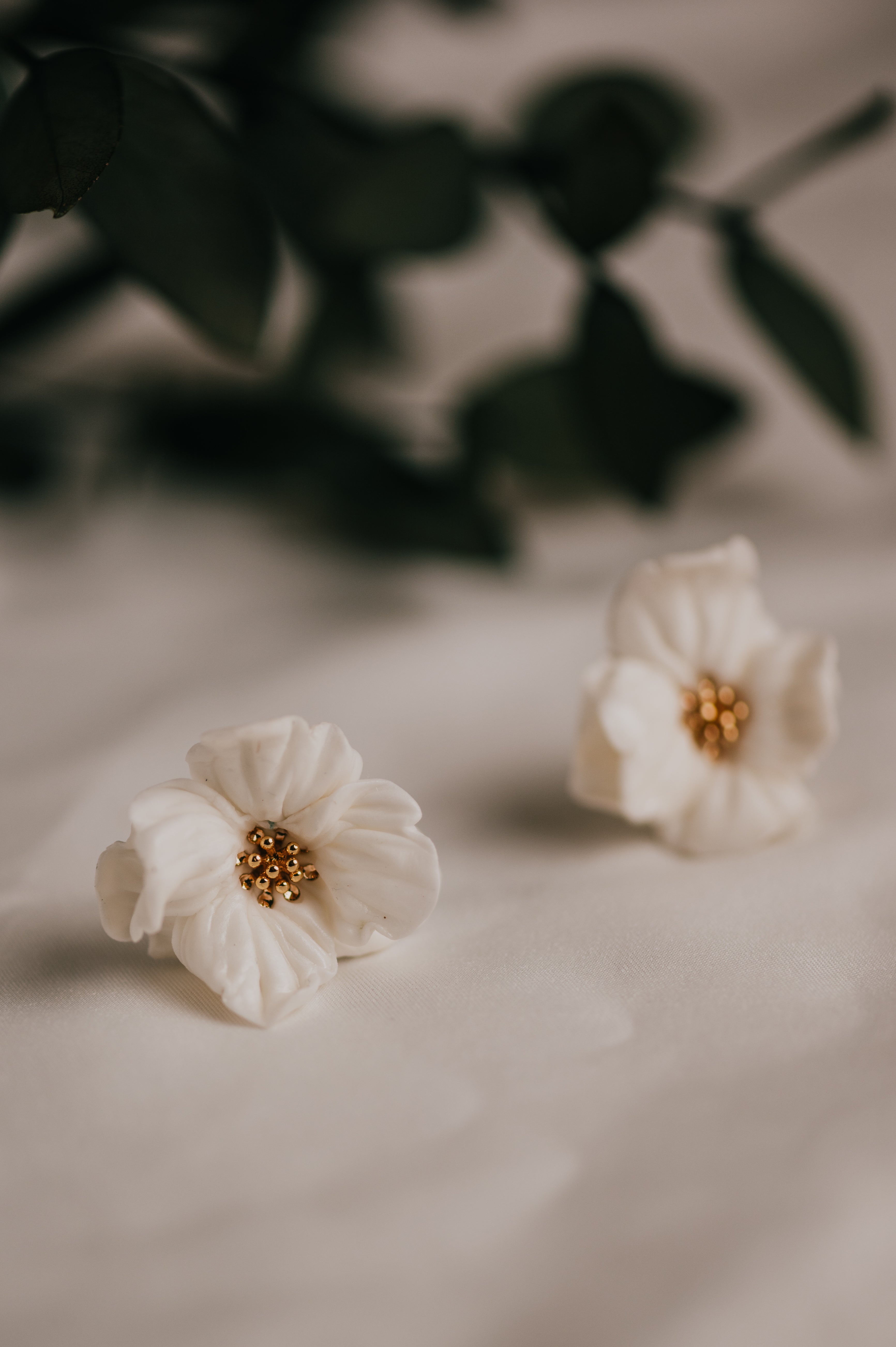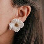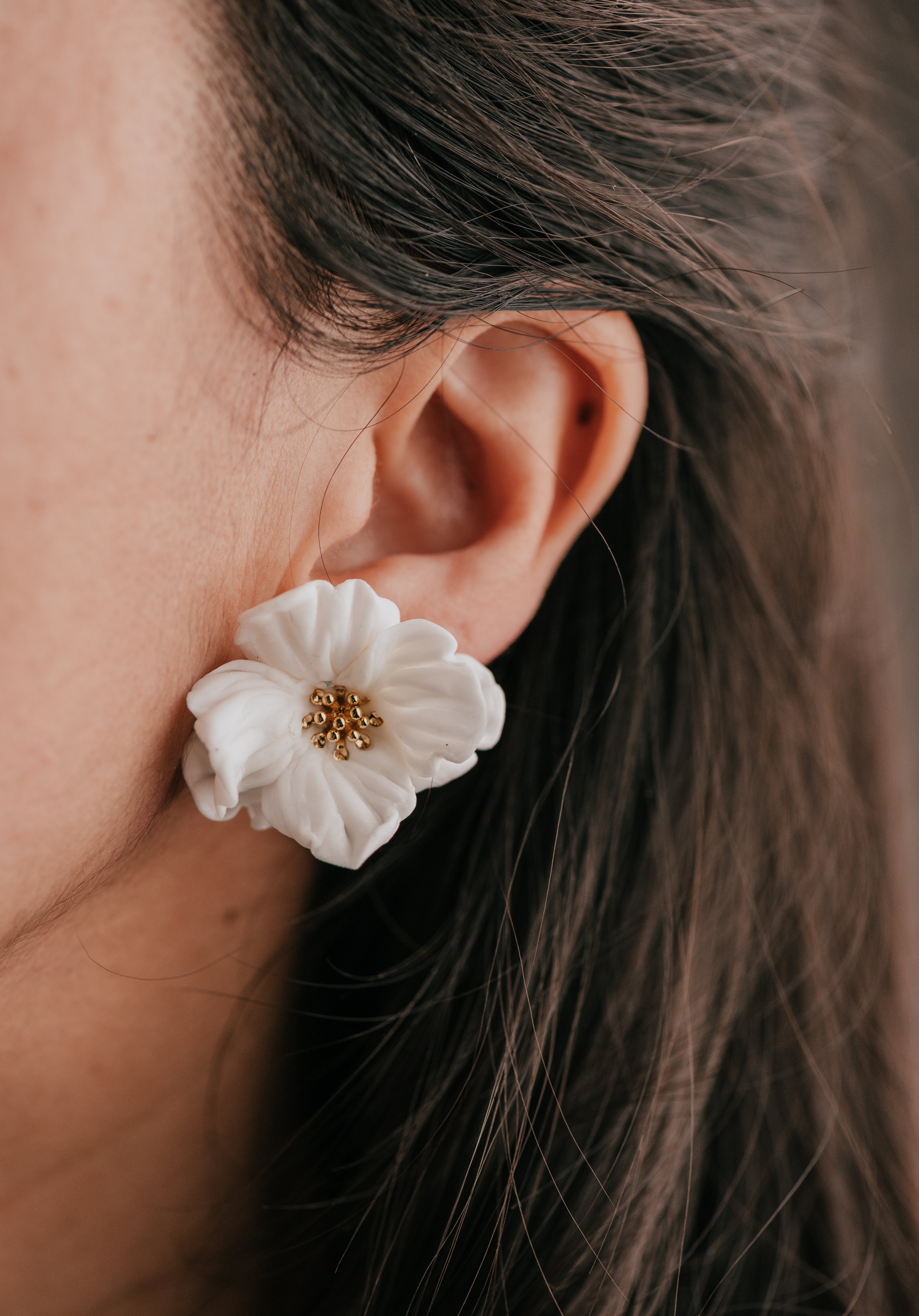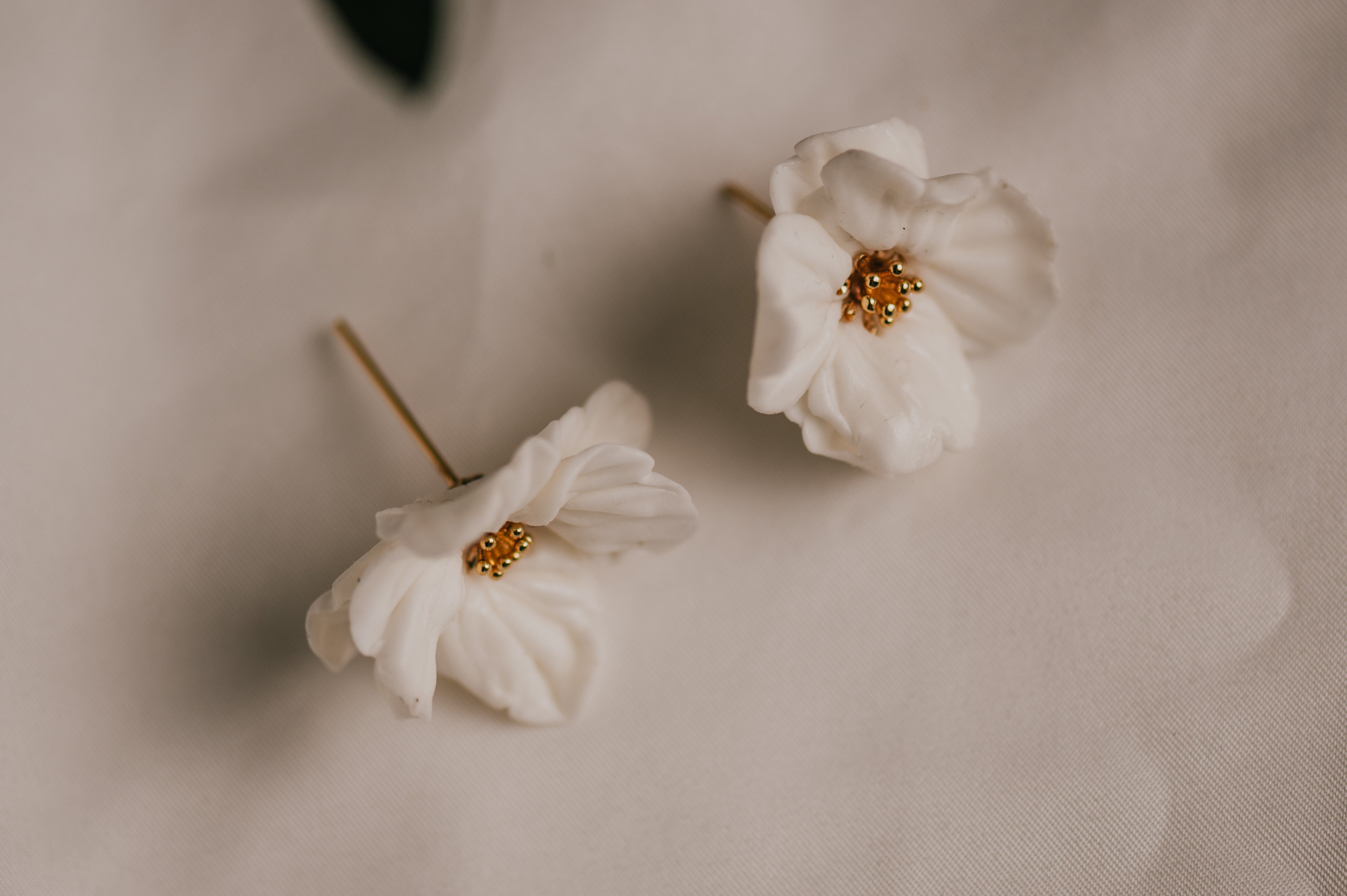 Basia es un pendiente tipo botón que representa una flor modelada a mano en porcelana fría, con pétalos blancos y sutil volumen. En el centro, un pistilo joya en tono dorado aporta luz, contraste y un toque sofisticado que realza el diseño floral.