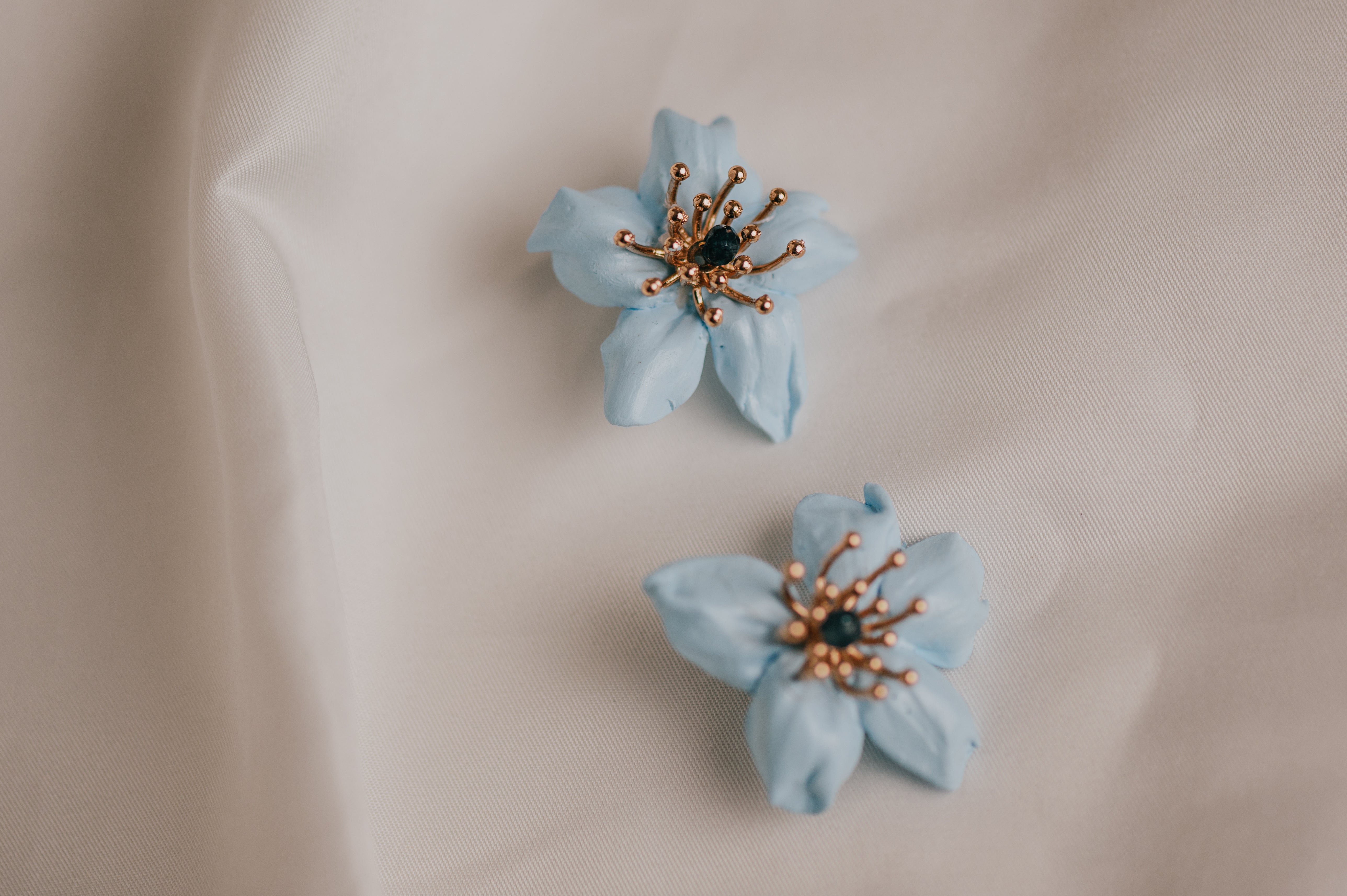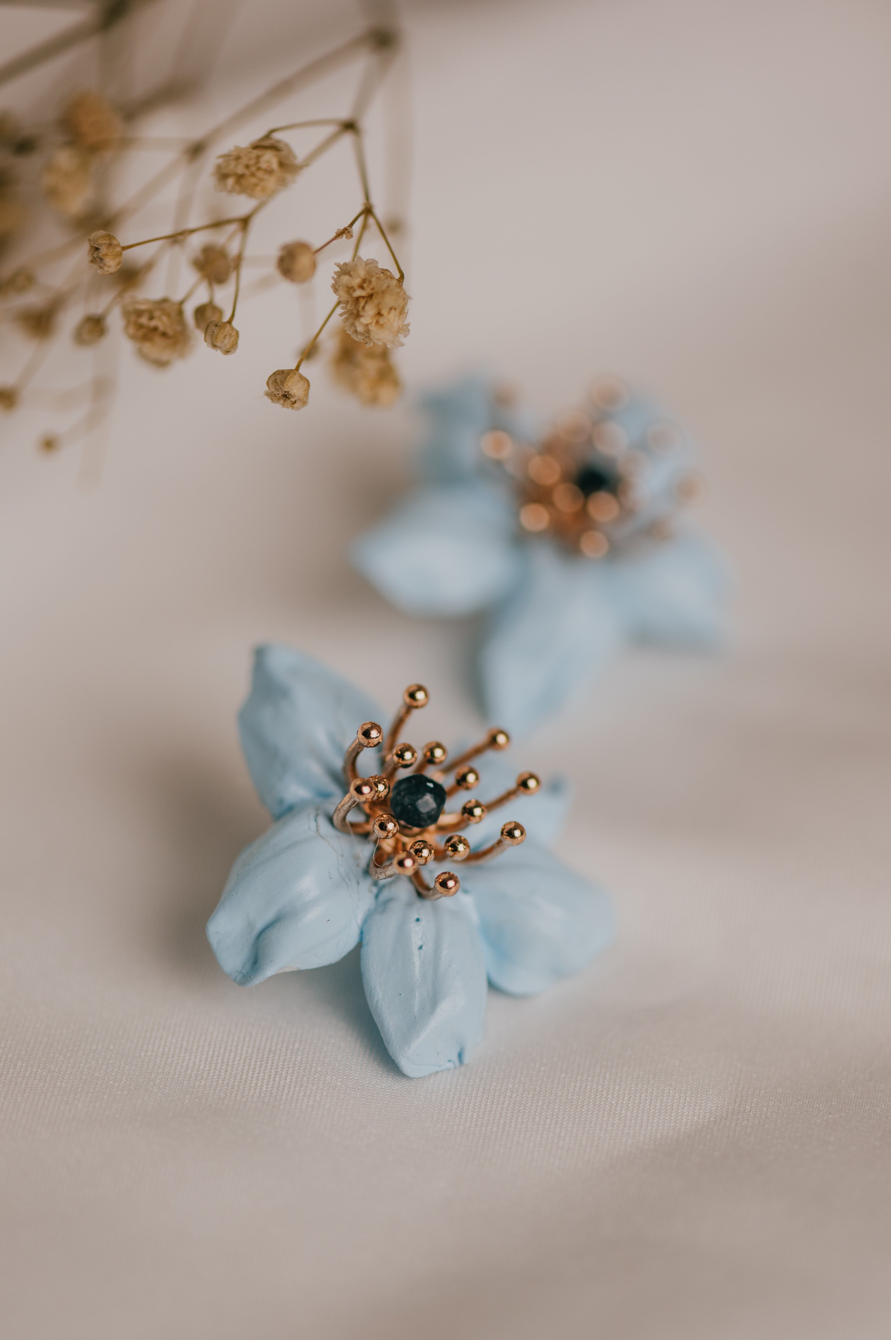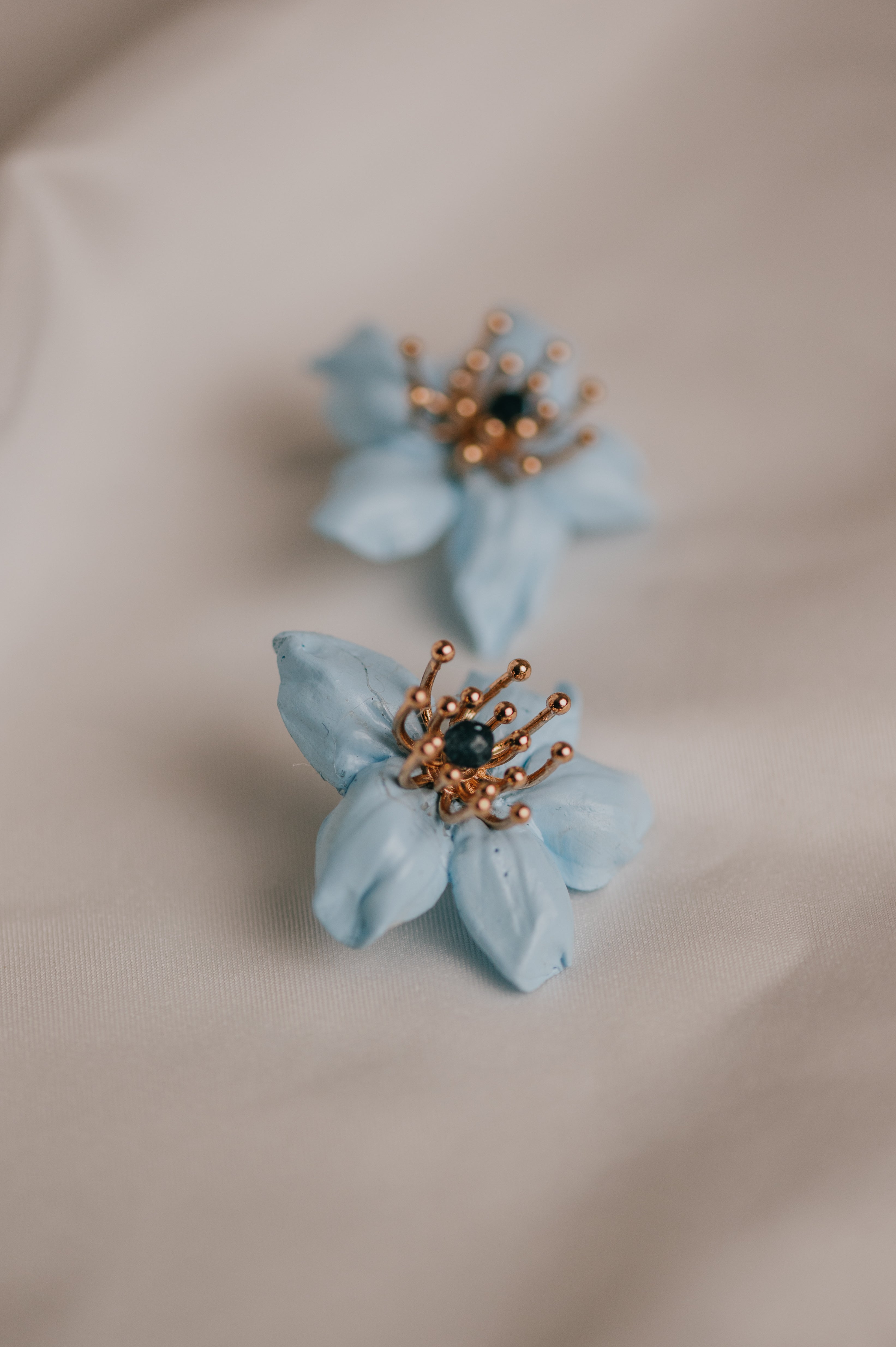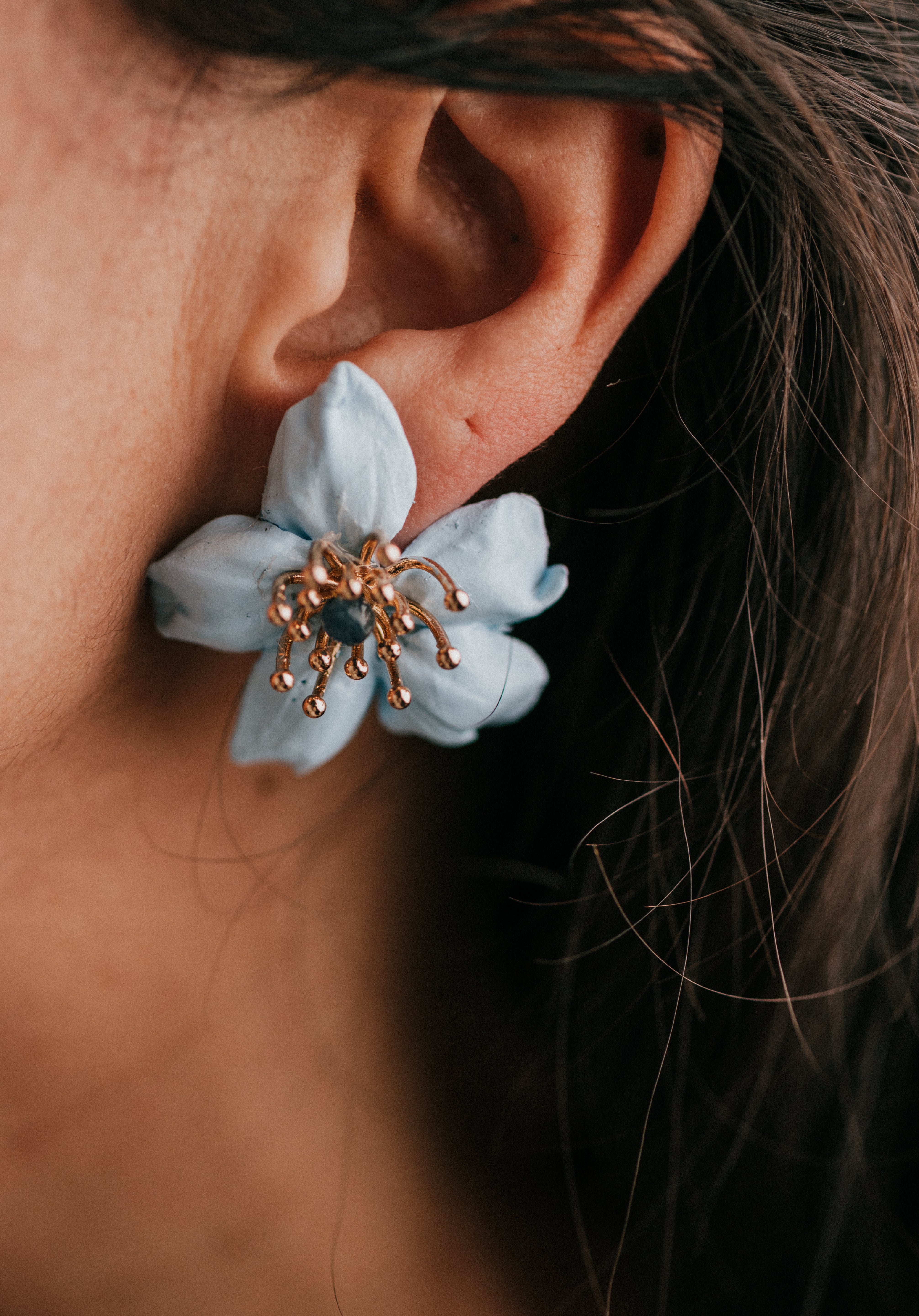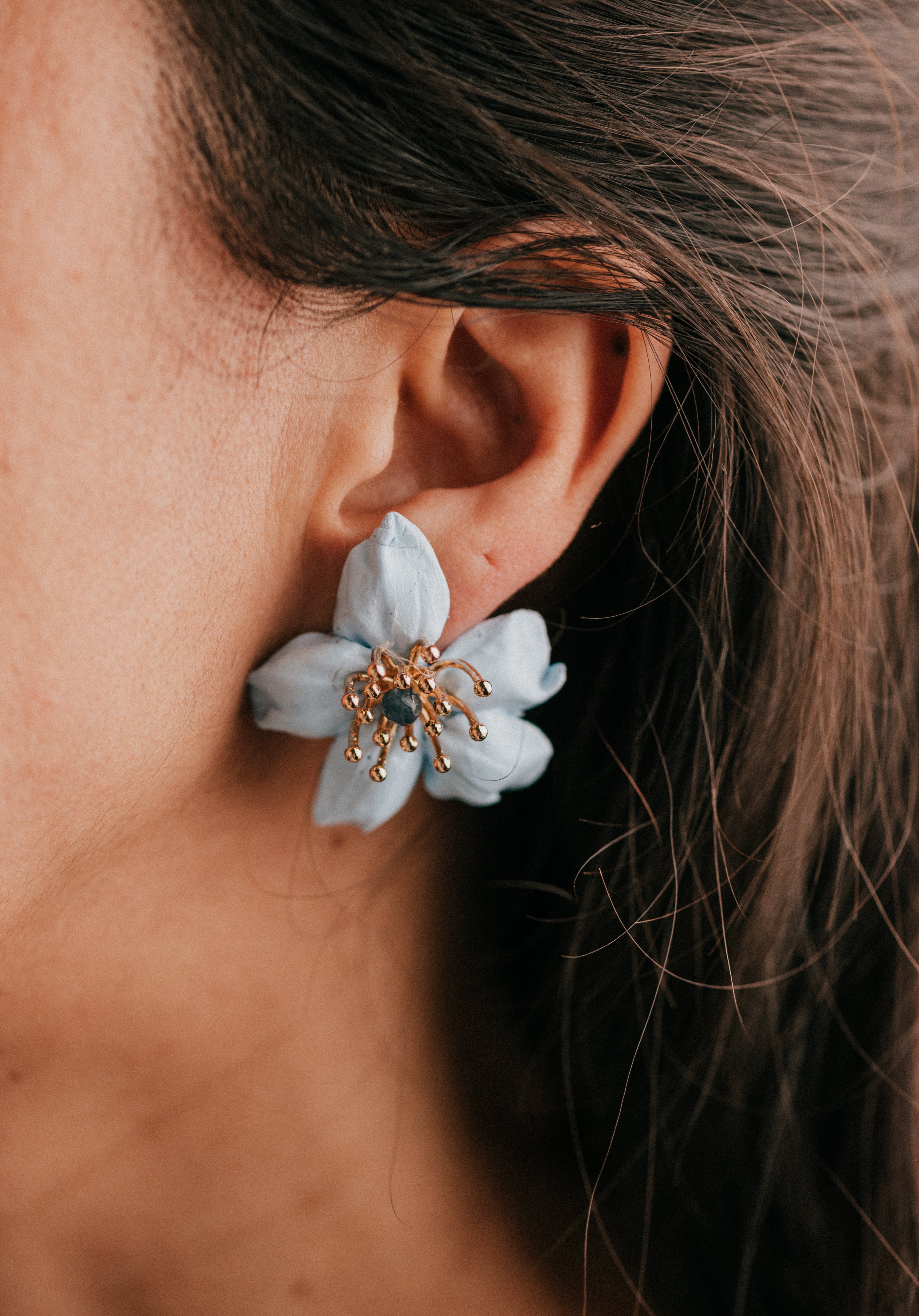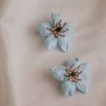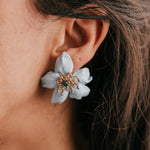 Casilda es un pendiente tipo botón elaborado en porcelana fría, moldeado y tintado a mano en nuestro taller, pieza a pieza, con mimo y tradición. Su forma de flor de pétalos suaves en tono celeste evoca la frescura de una mañana de Corpus en Granada, mientras su centro con pistilos dorados y cristal azul aporta luz y sofisticación al rostro.