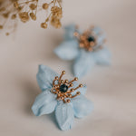 Pendientes florales hechos a mano. Casilda combina porcelana celeste, pistilos dorados y cristal azul. Elegancia artesanal para cada ocasión.