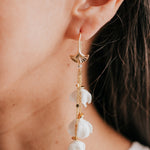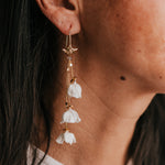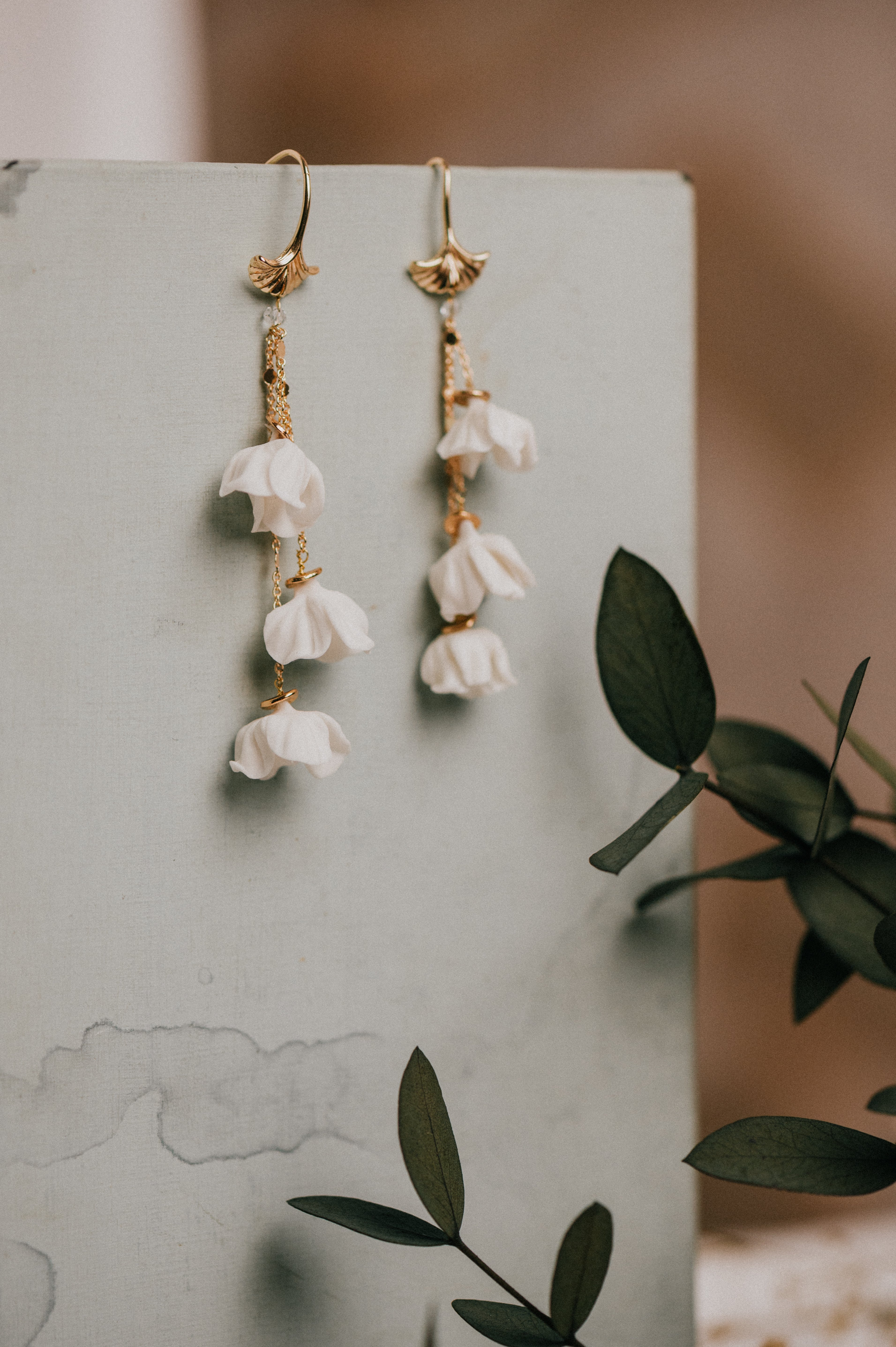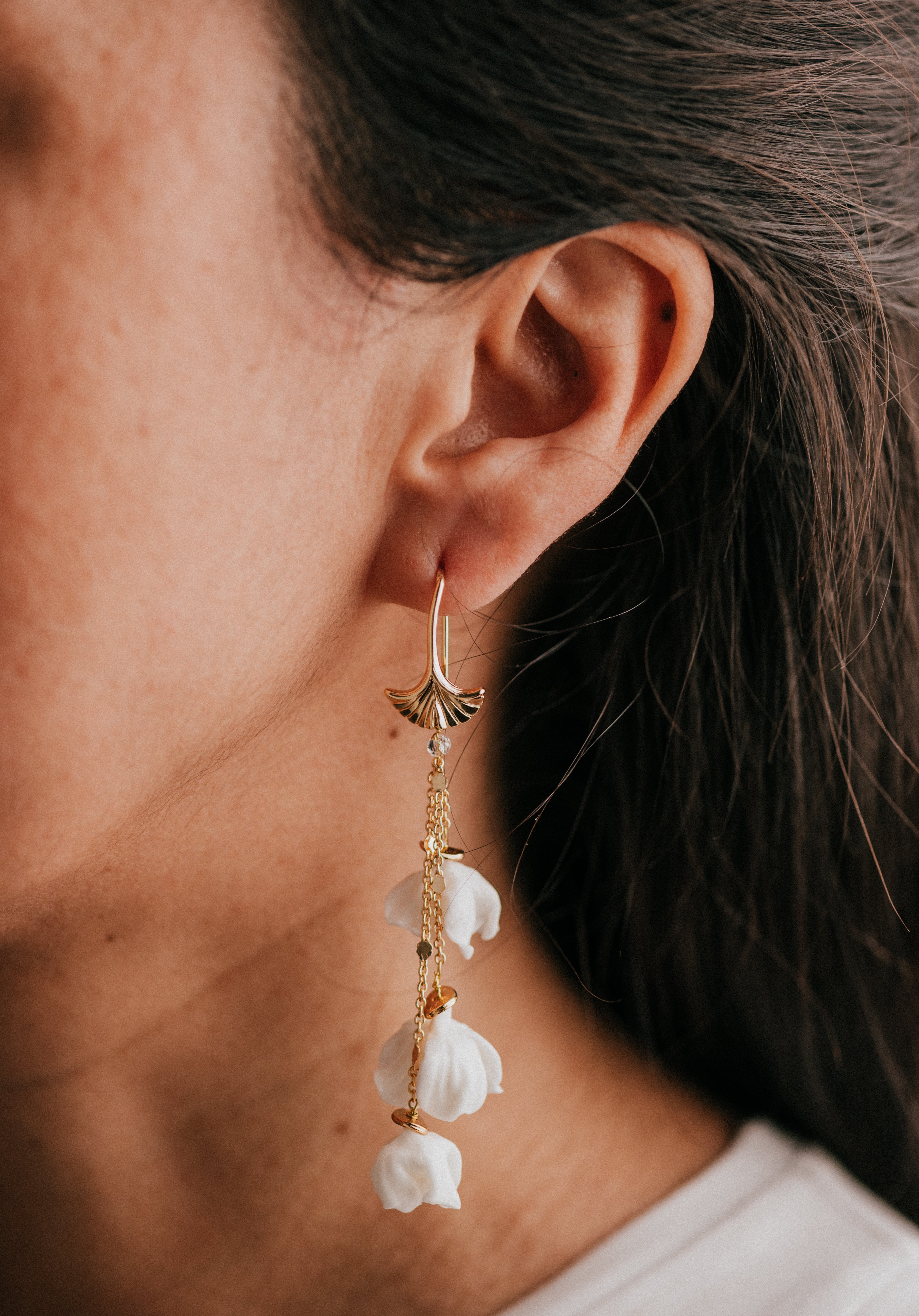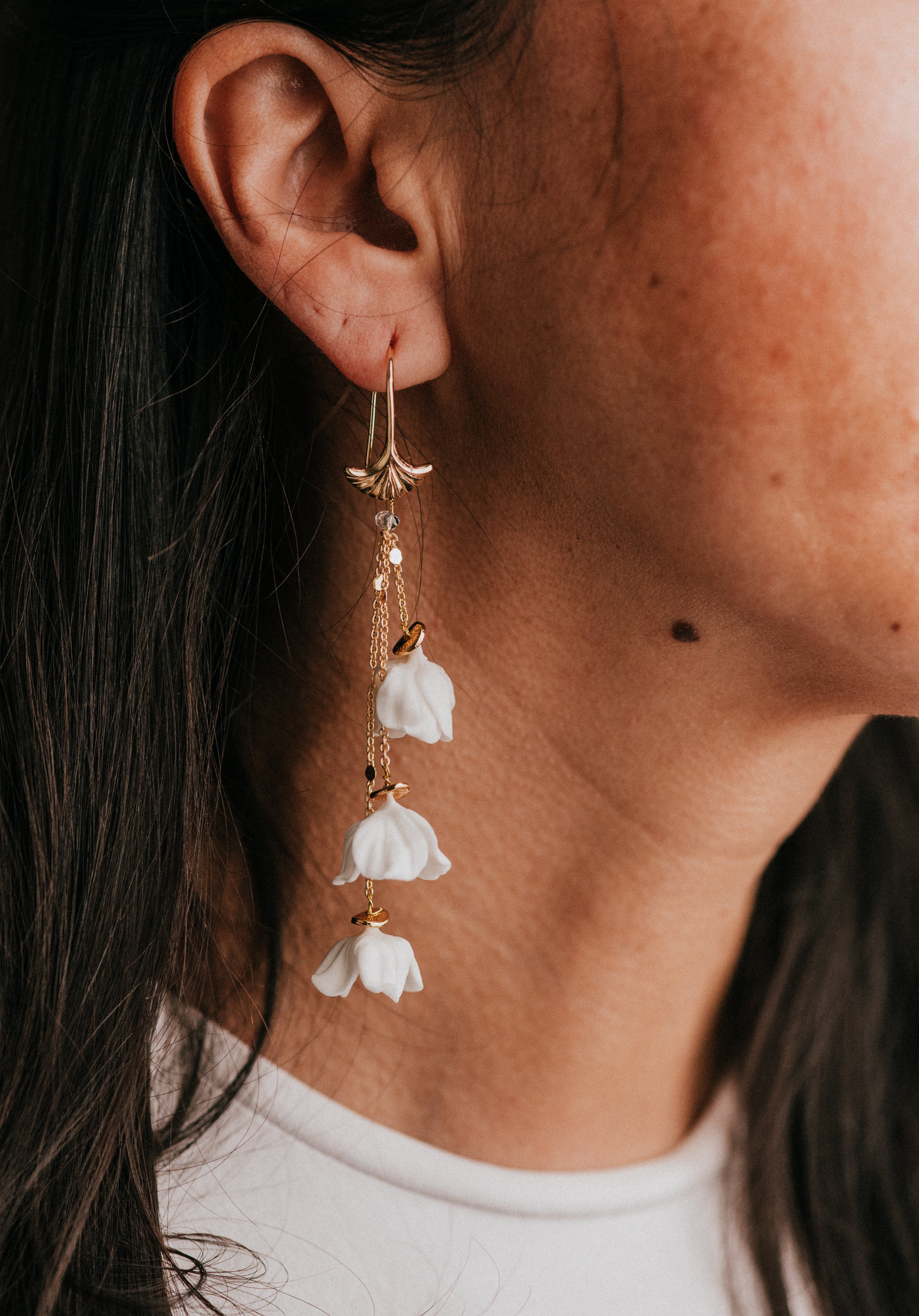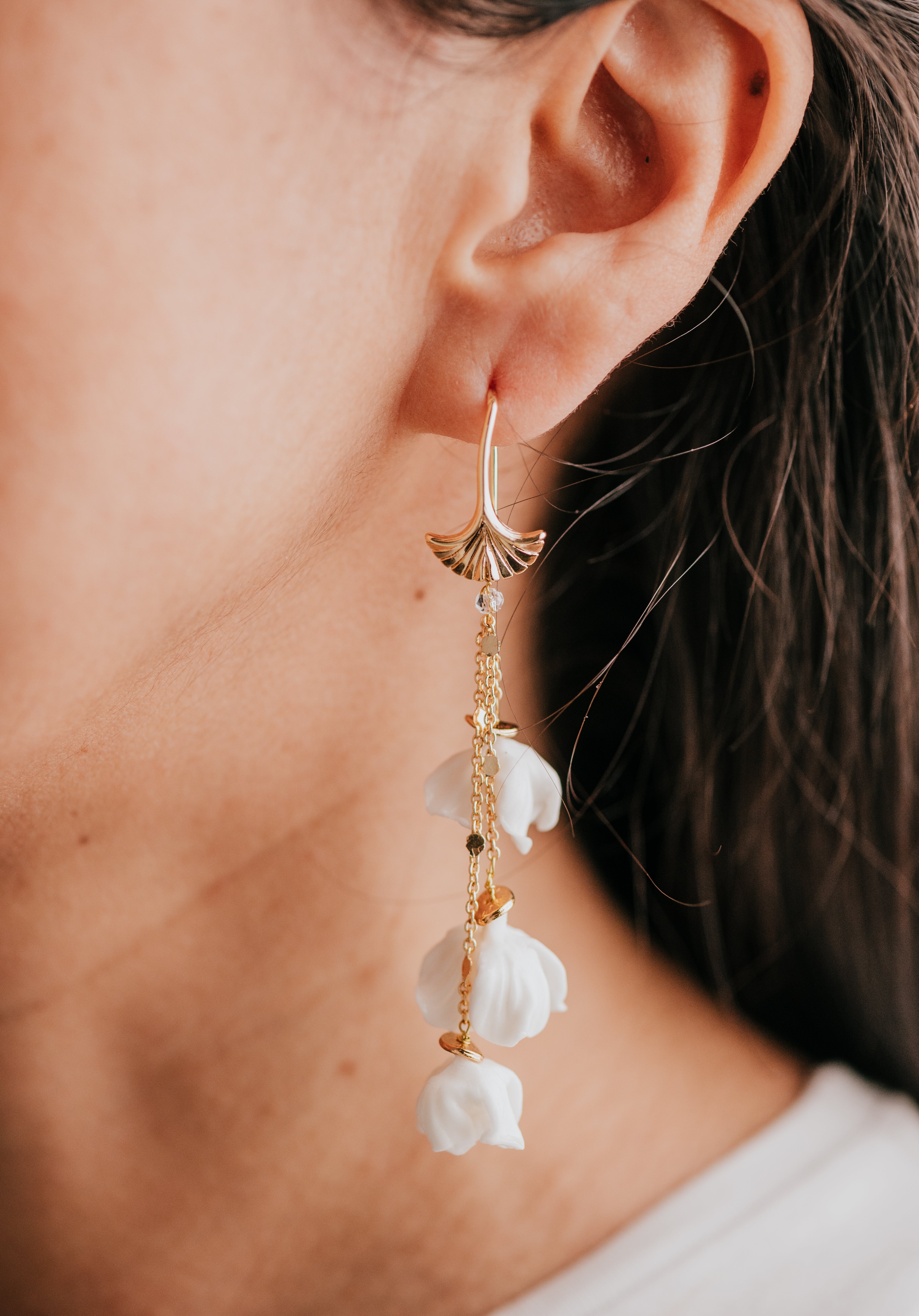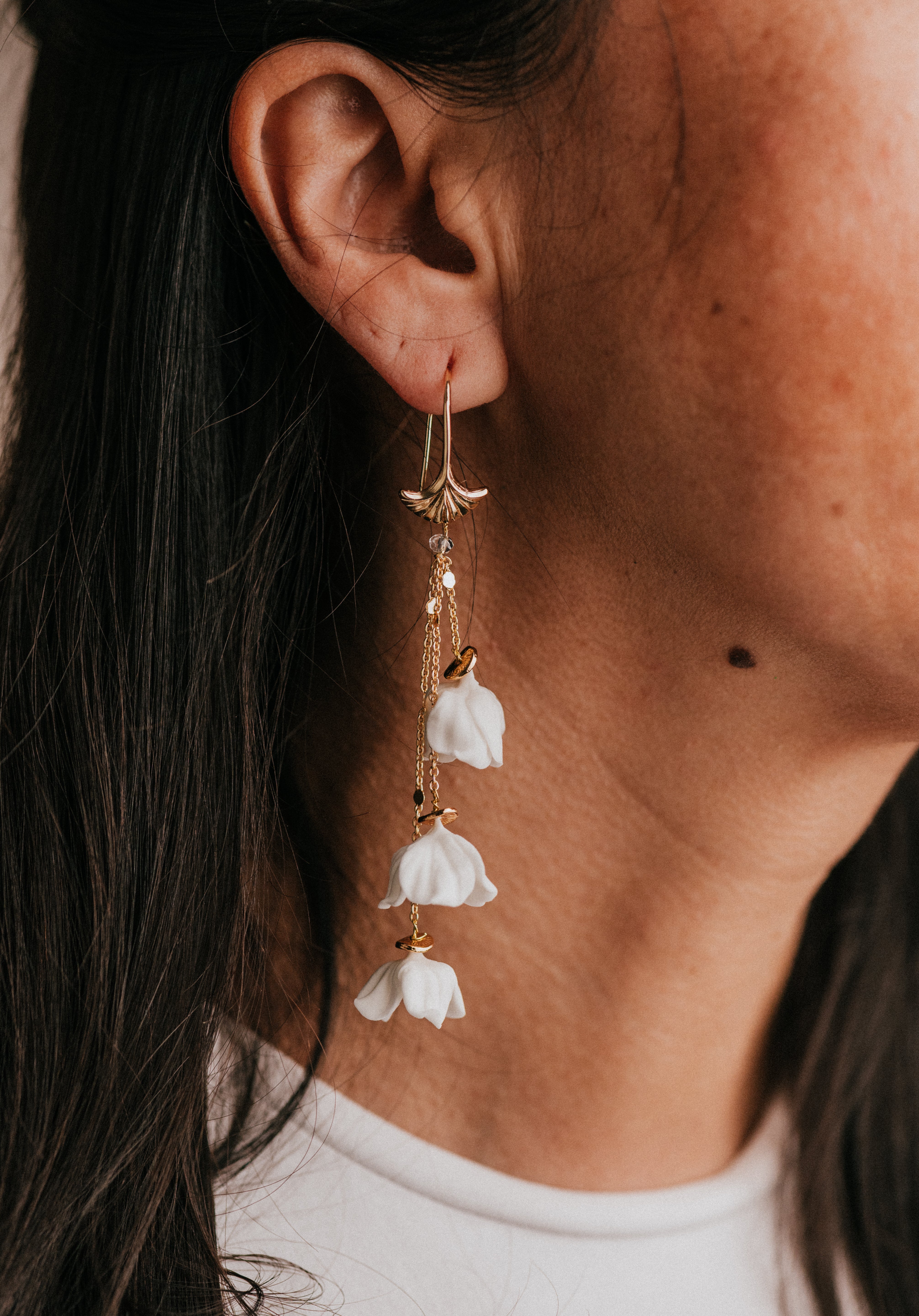 Pendientes colgantes con abanico joya, cadenas doradas y flores de porcelana en forma de capullo. Una joya artesanal con movimiento y elegancia.