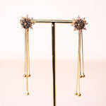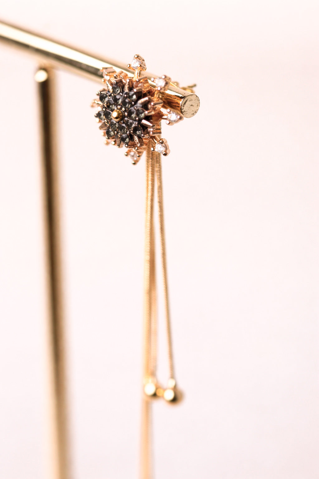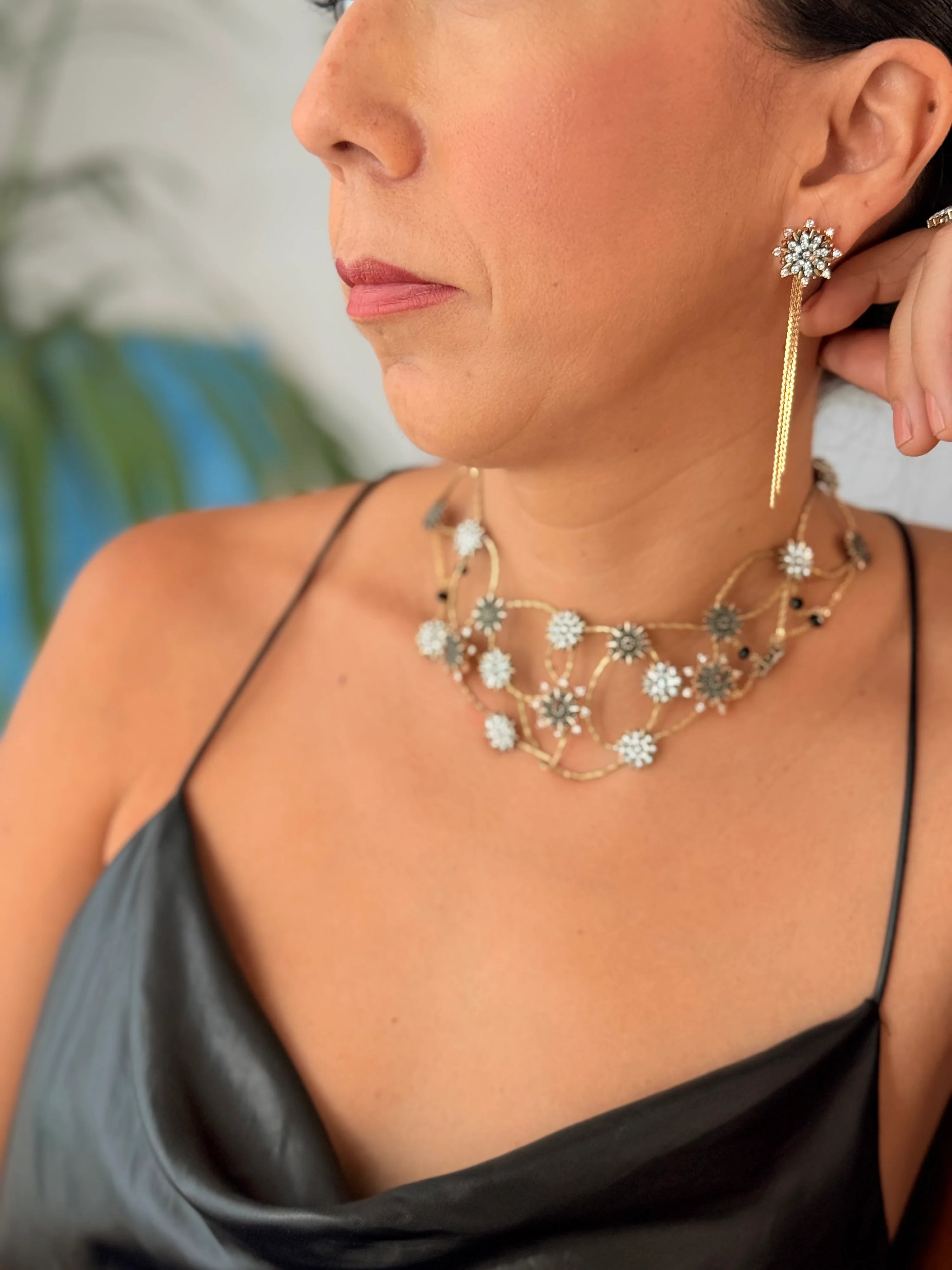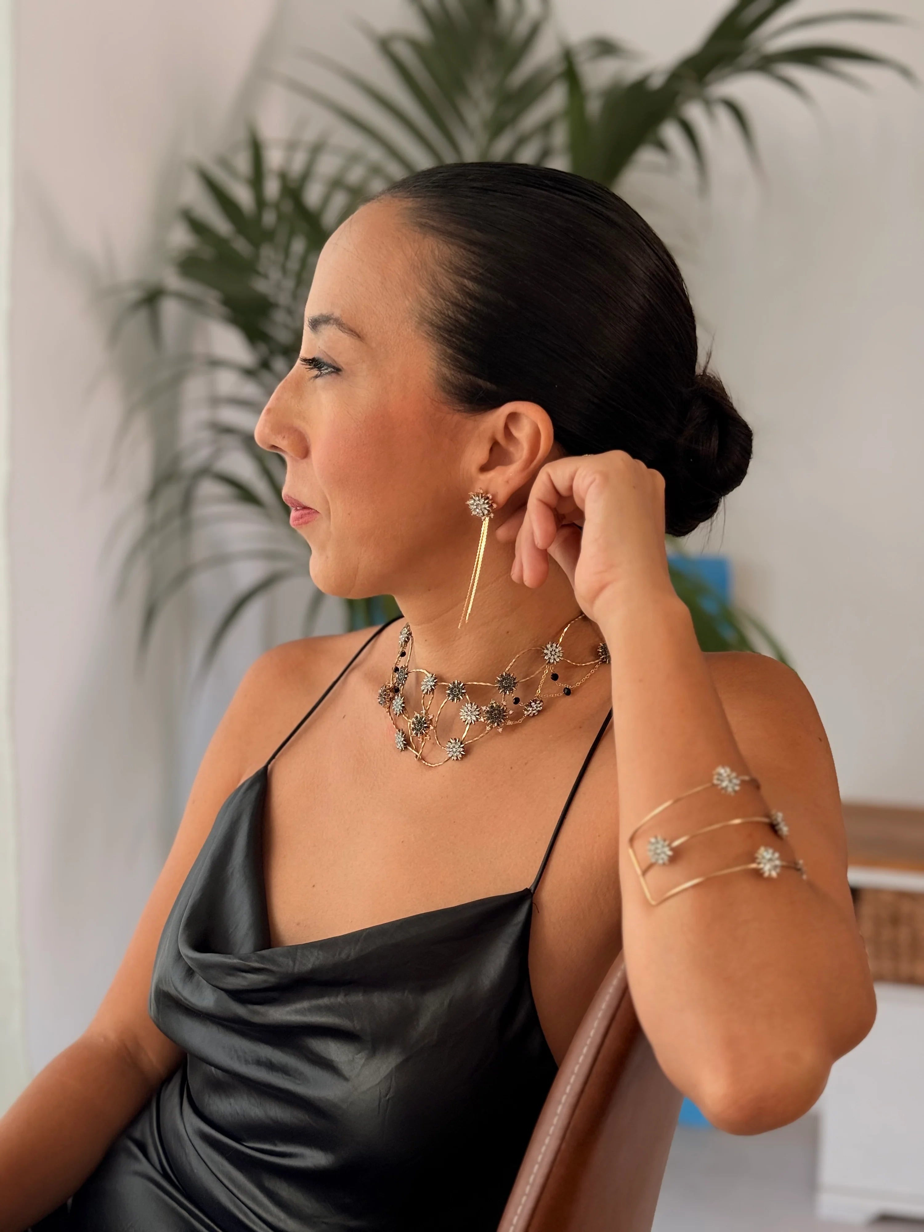 El diseño parte de un rosetón tipo estrella, que actúa como punto central, del que cuelgan finas cadenas rematadas en pequeñas bolitas doradas. Un conjunto ligero y equilibrado, con un brillo suave que acompaña el gesto natural del movimiento.