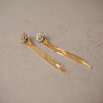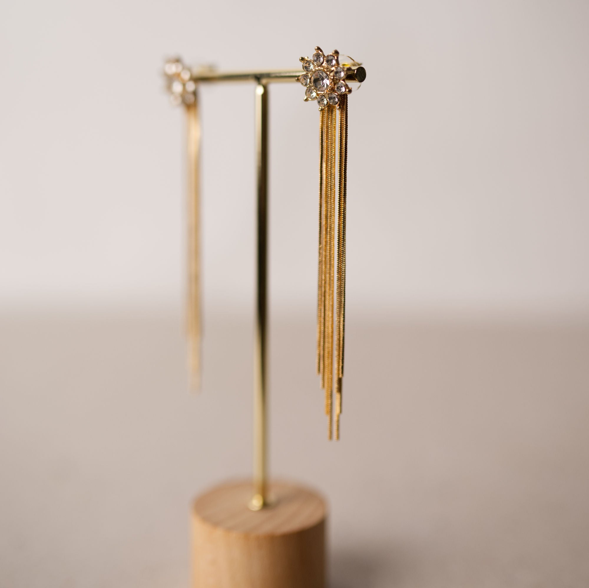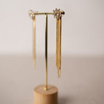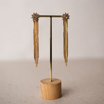 Estos pendientes en dorado achampanado destacan por su brillo suave y elegante. El diseño comienza con un rosetón de cristales, del que caen varias cadenas largas que aportan movimiento sin recargar.