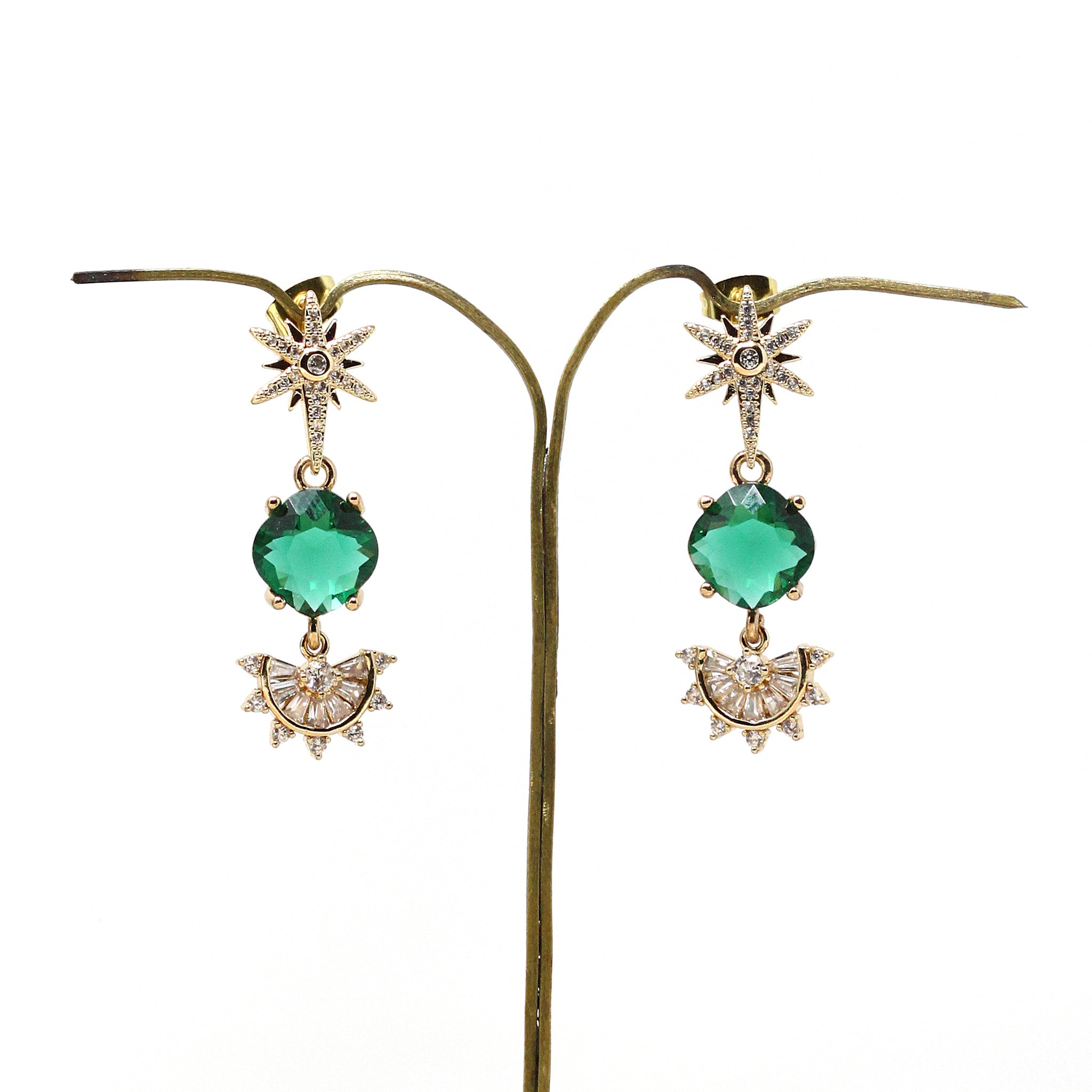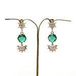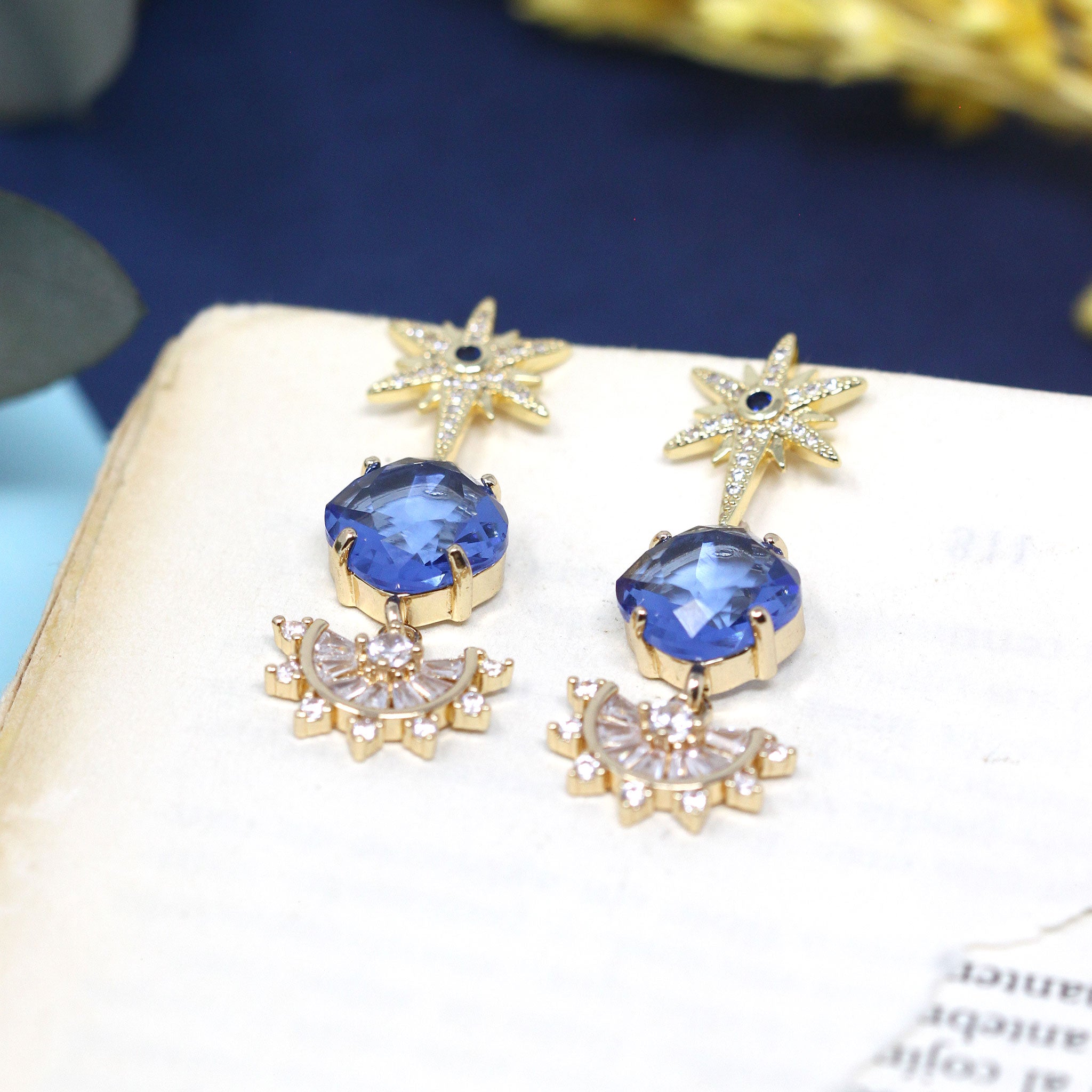 Esta maravilla de pendientes tienen en la parte superior una estrella polar con centro de color zafiro, y un rosetón de brillantitos en la parte inferior, estos pendientes son la elección perfecta para resaltar tu belleza con un toque de sofisticación y encanto. Brilla con estilo en tu día especial llevando la magia de las estrellas contigo.
