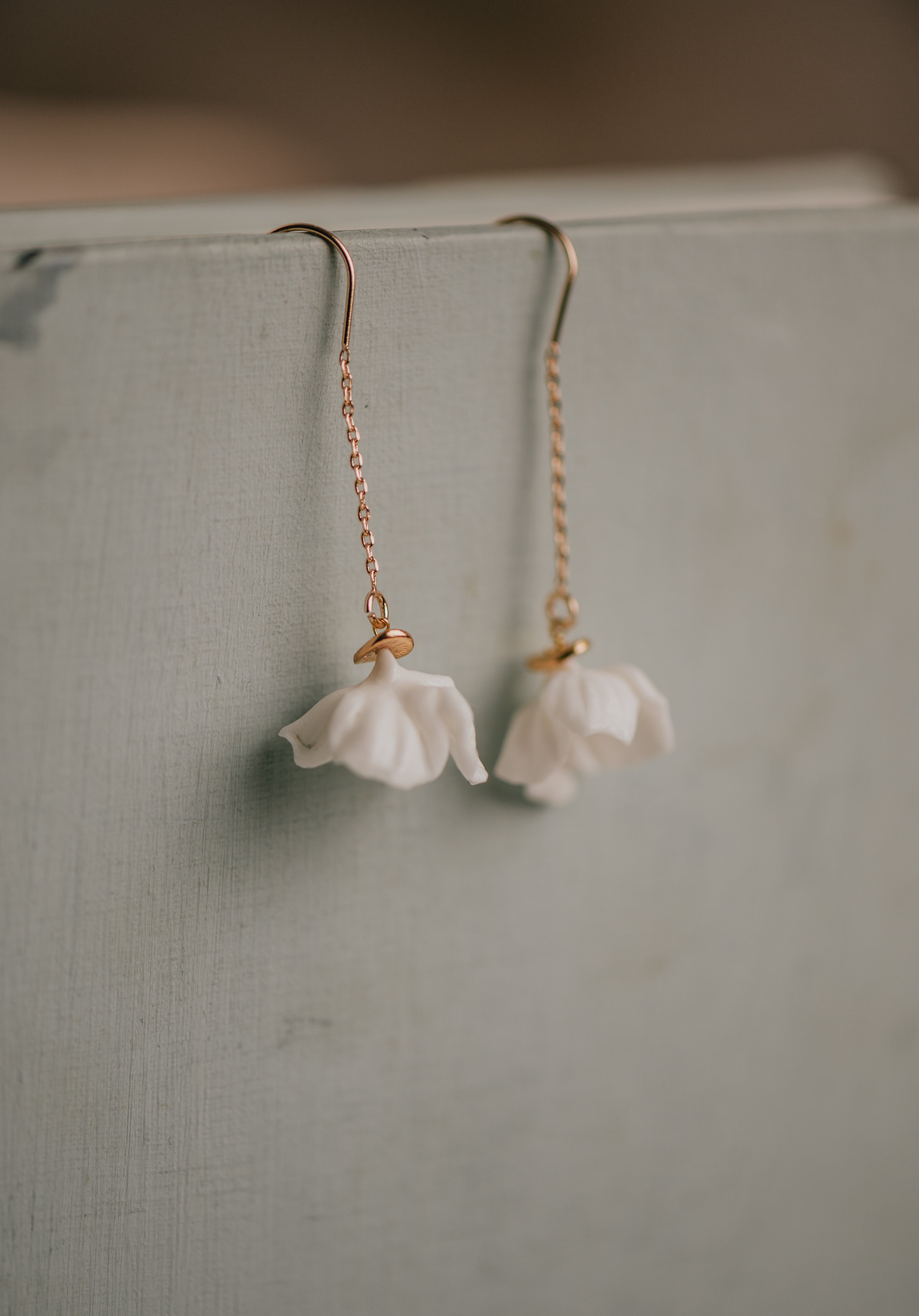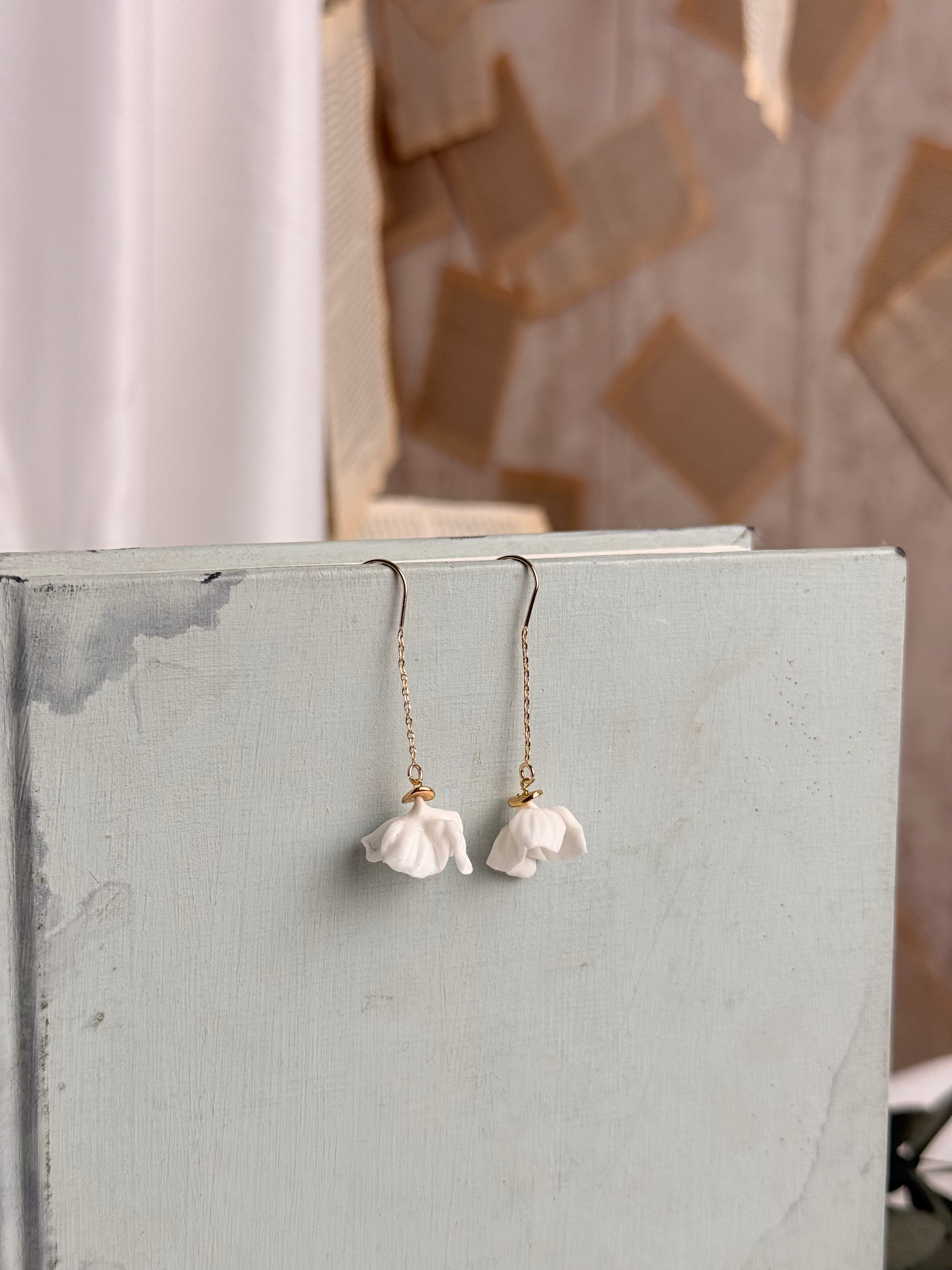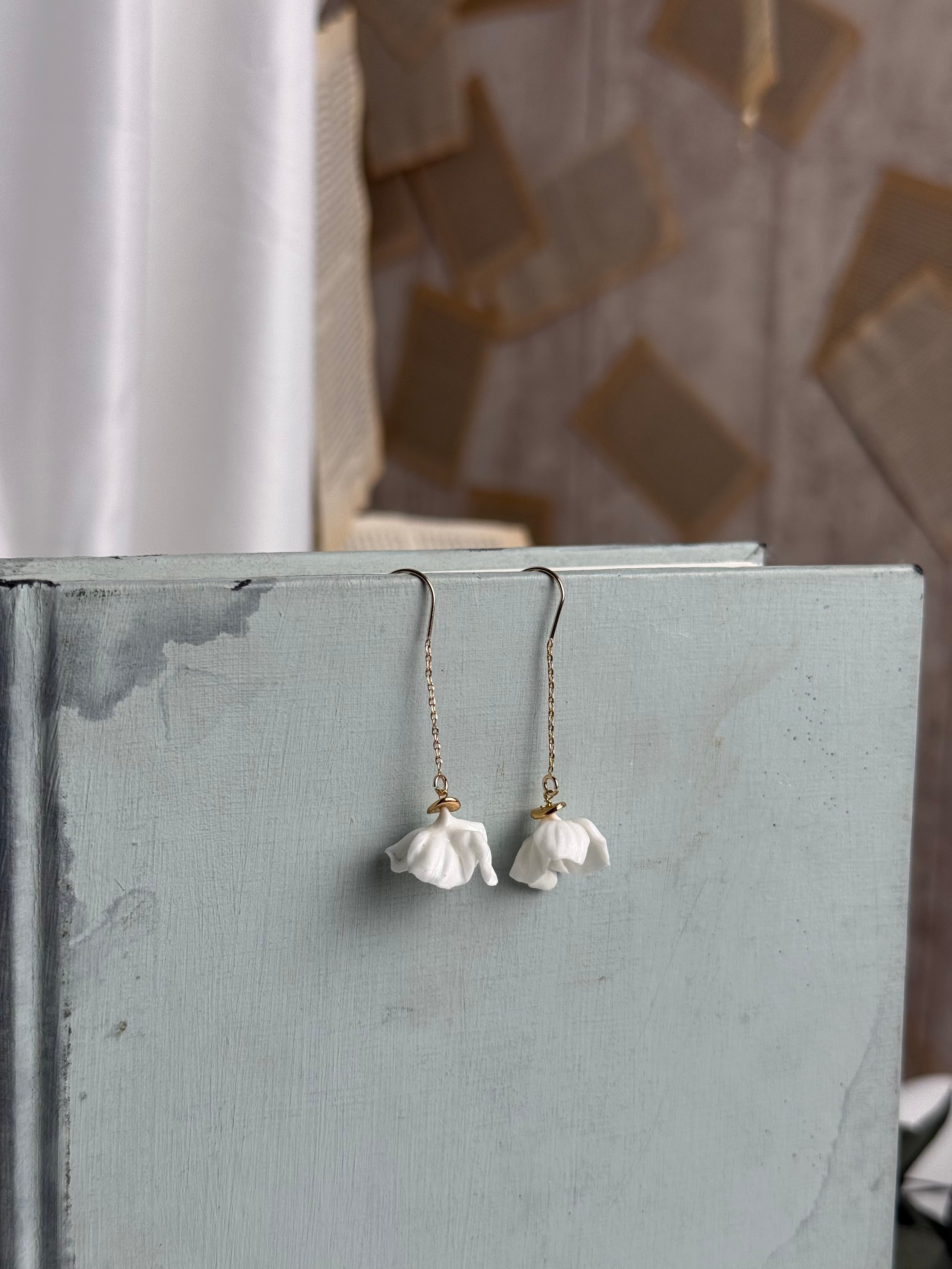 Pendientes largos con cadena dorada y capullo floral en porcelana blanca con pistilo de cristal. Elegantes, ligeros y hechos a mano.