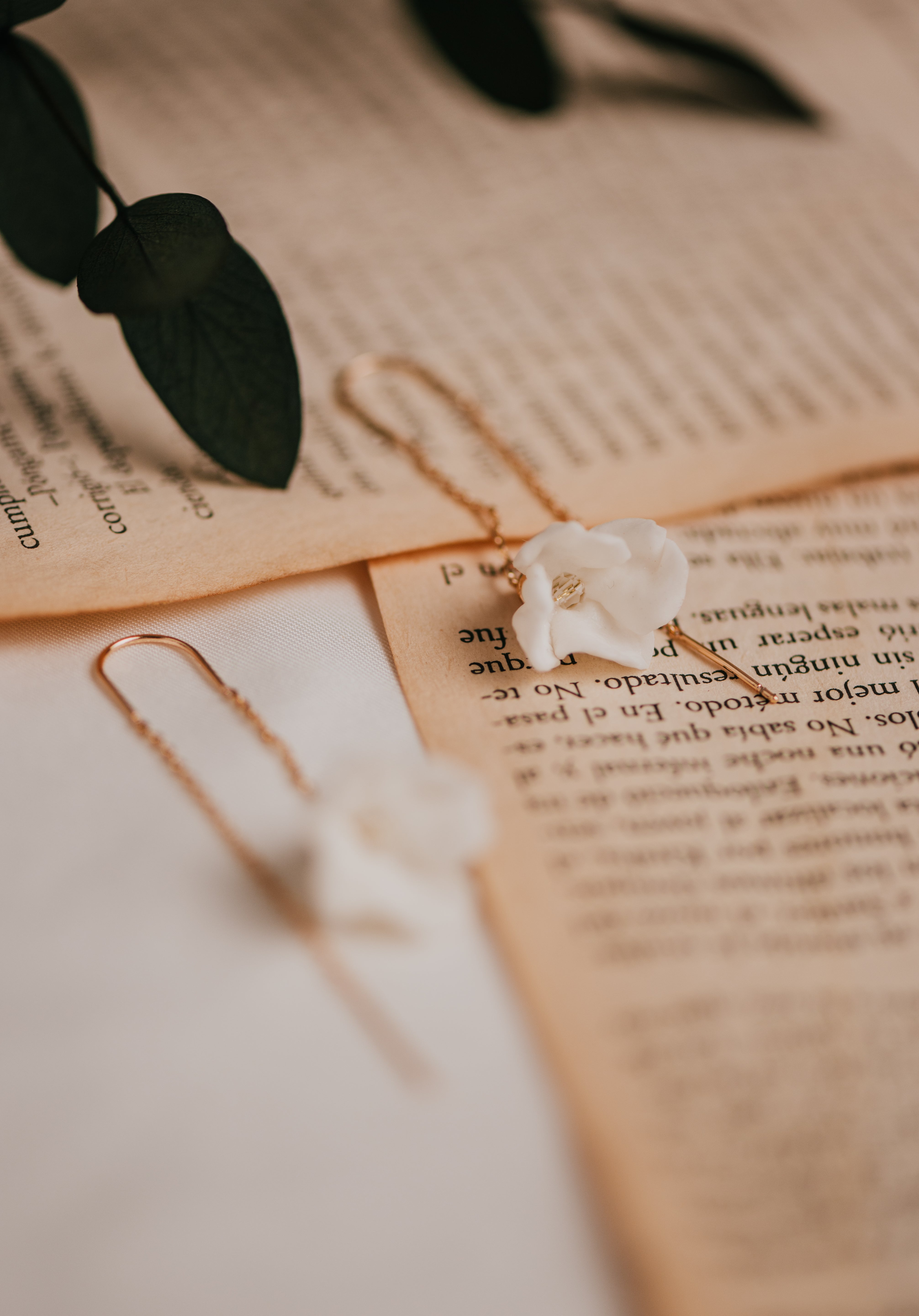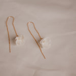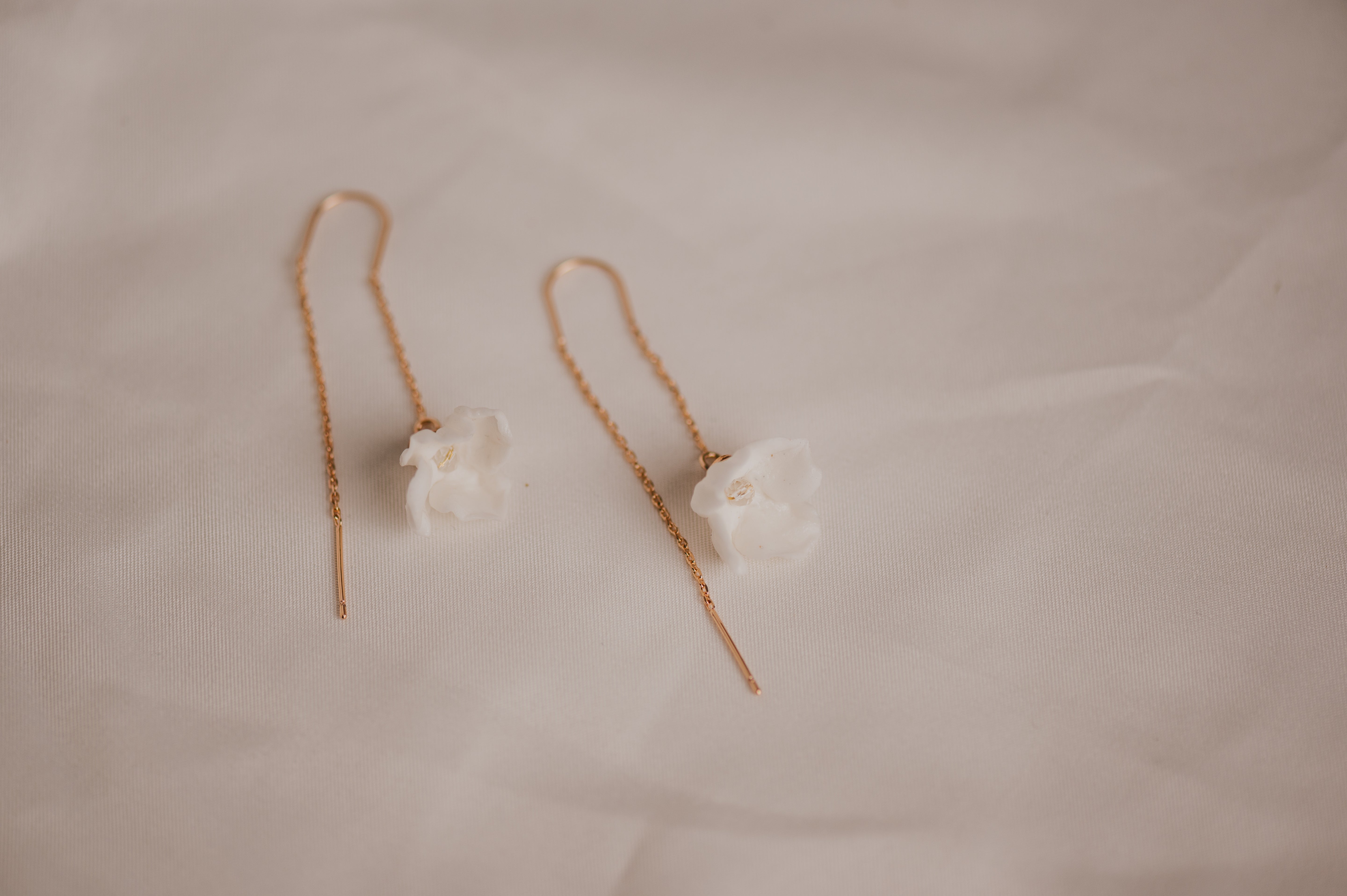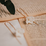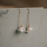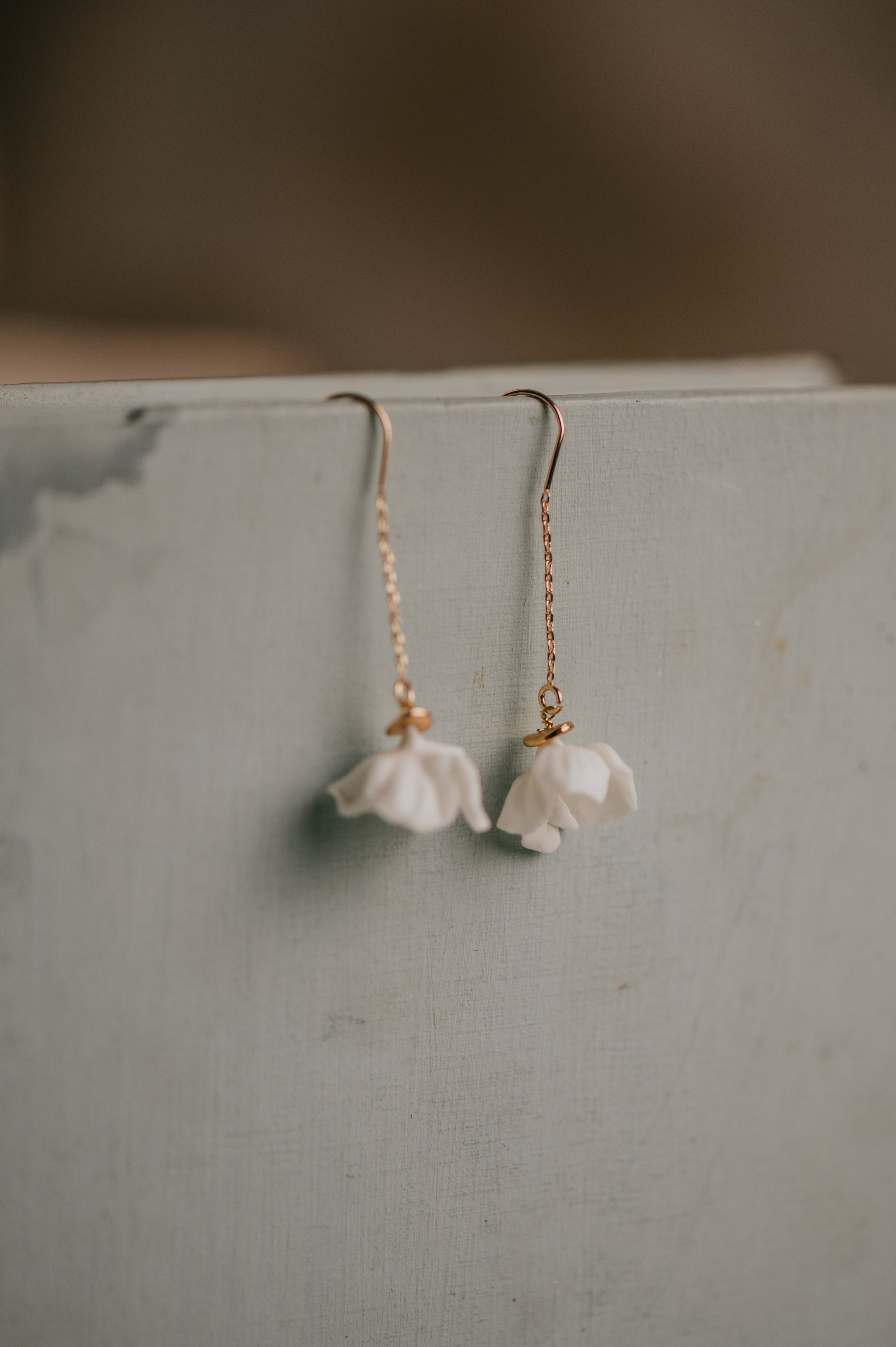 Pendientes largos con cadena dorada y capullo floral en porcelana blanca con pistilo de cristal. Elegantes, ligeros y hechos a mano.