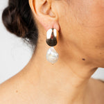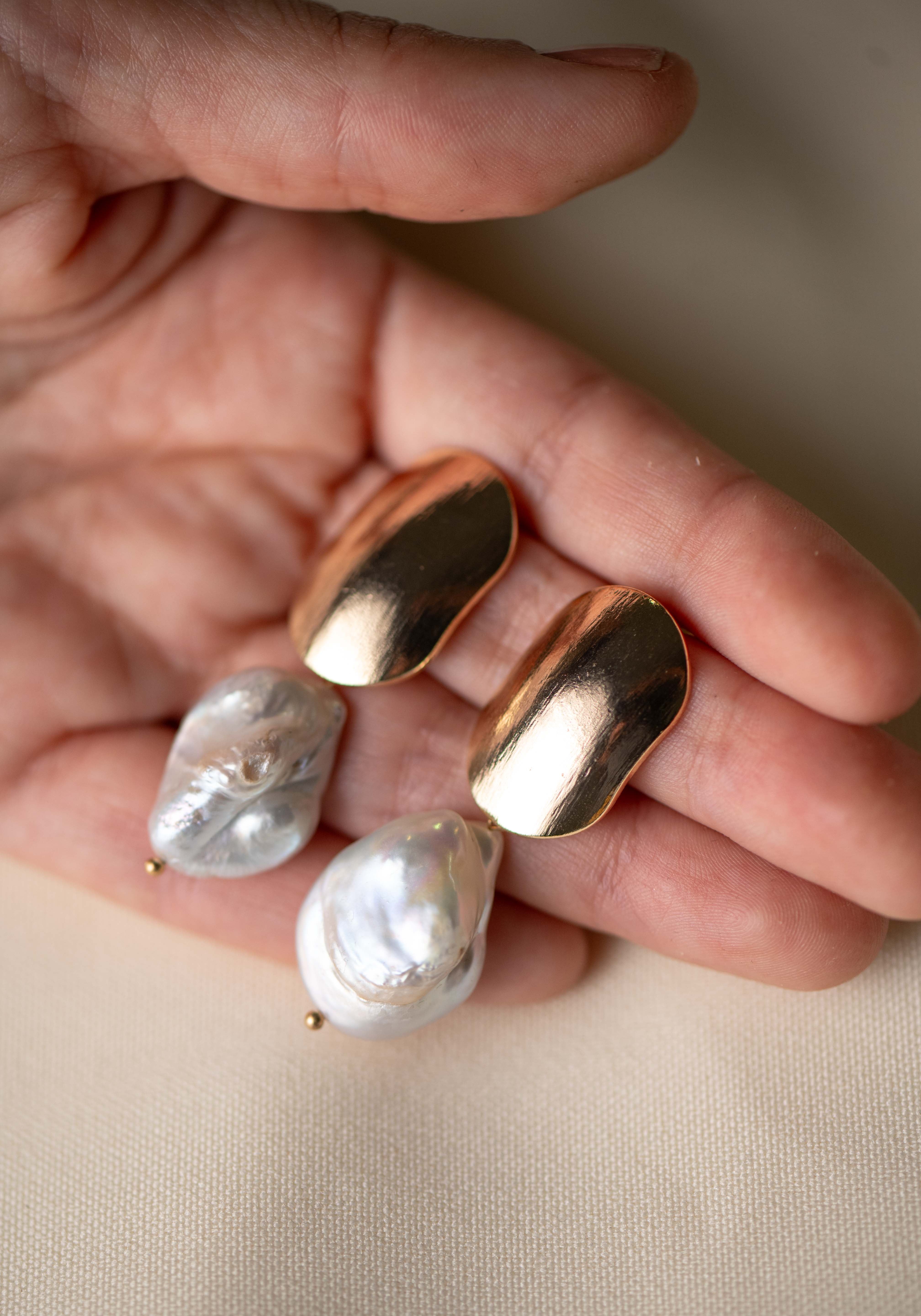 Descubre la elegancia atemporal de nuestros pendientes largos con perla de río barroca, una joya única que combina sofisticación y estilo contemporáneo. Hechos a mano con dedicación, estos pendientes presentan una pieza dorada que descansa suavemente sobre el lóbulo, aportando un brillo cálido y sutil que realza cualquier look.