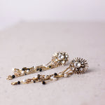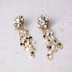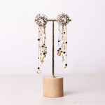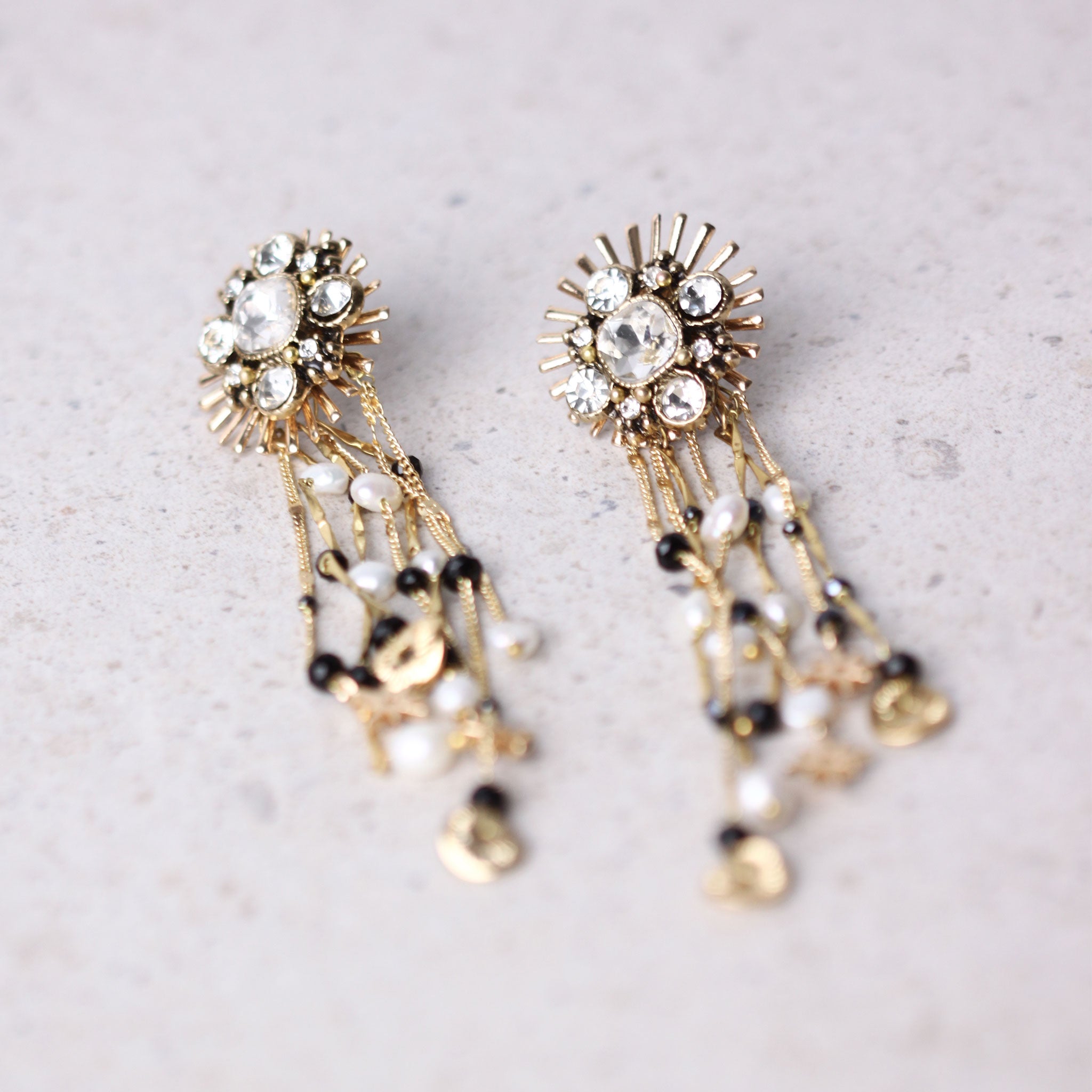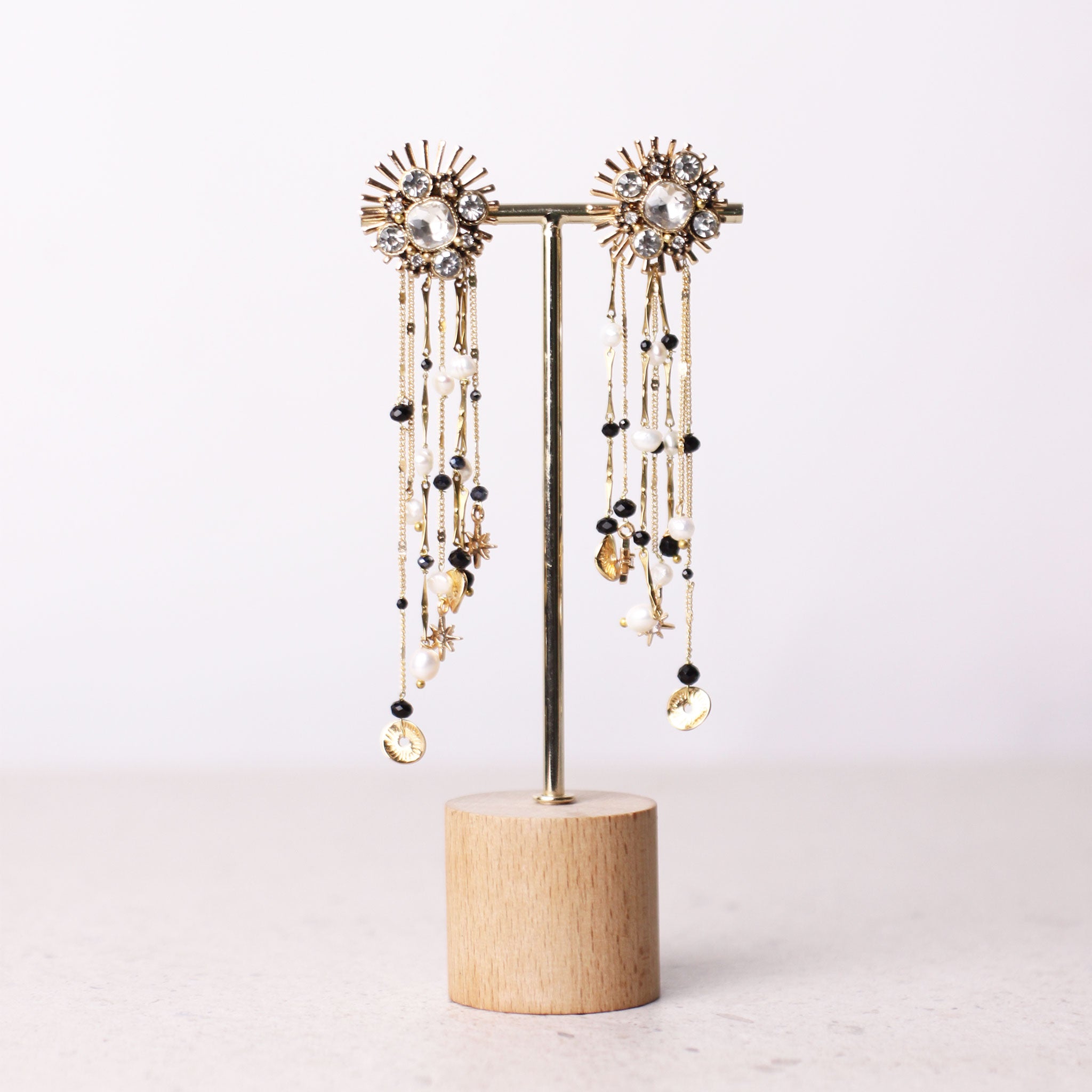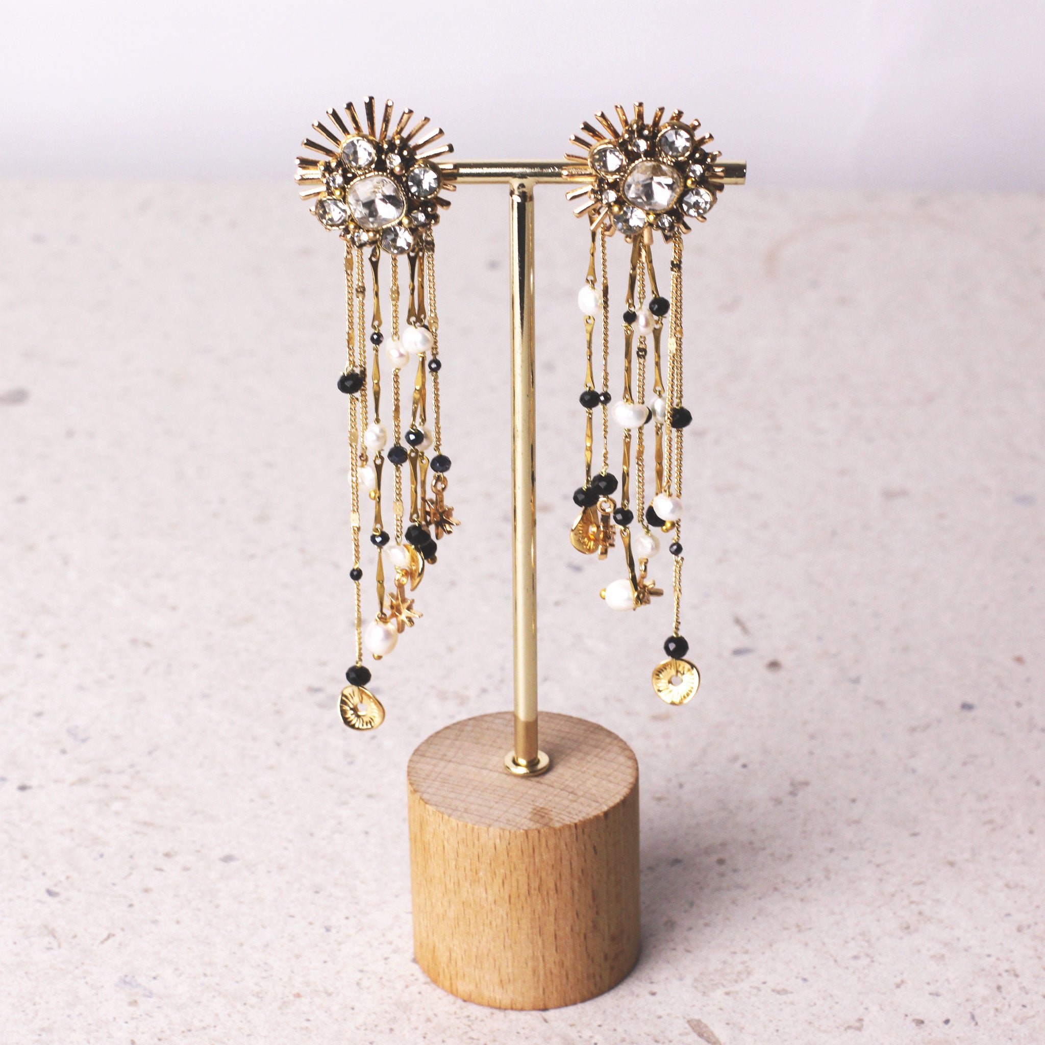 Están compuestos por una base dorada con forma de sol, decorada con pequeños cristales, de la que caen varias cadenas finas en acabado dorado, combinadas con perlas naturales, piedras de ónix y pequeños detalles simbólicos que aportan ritmo y delicadeza al conjunto.