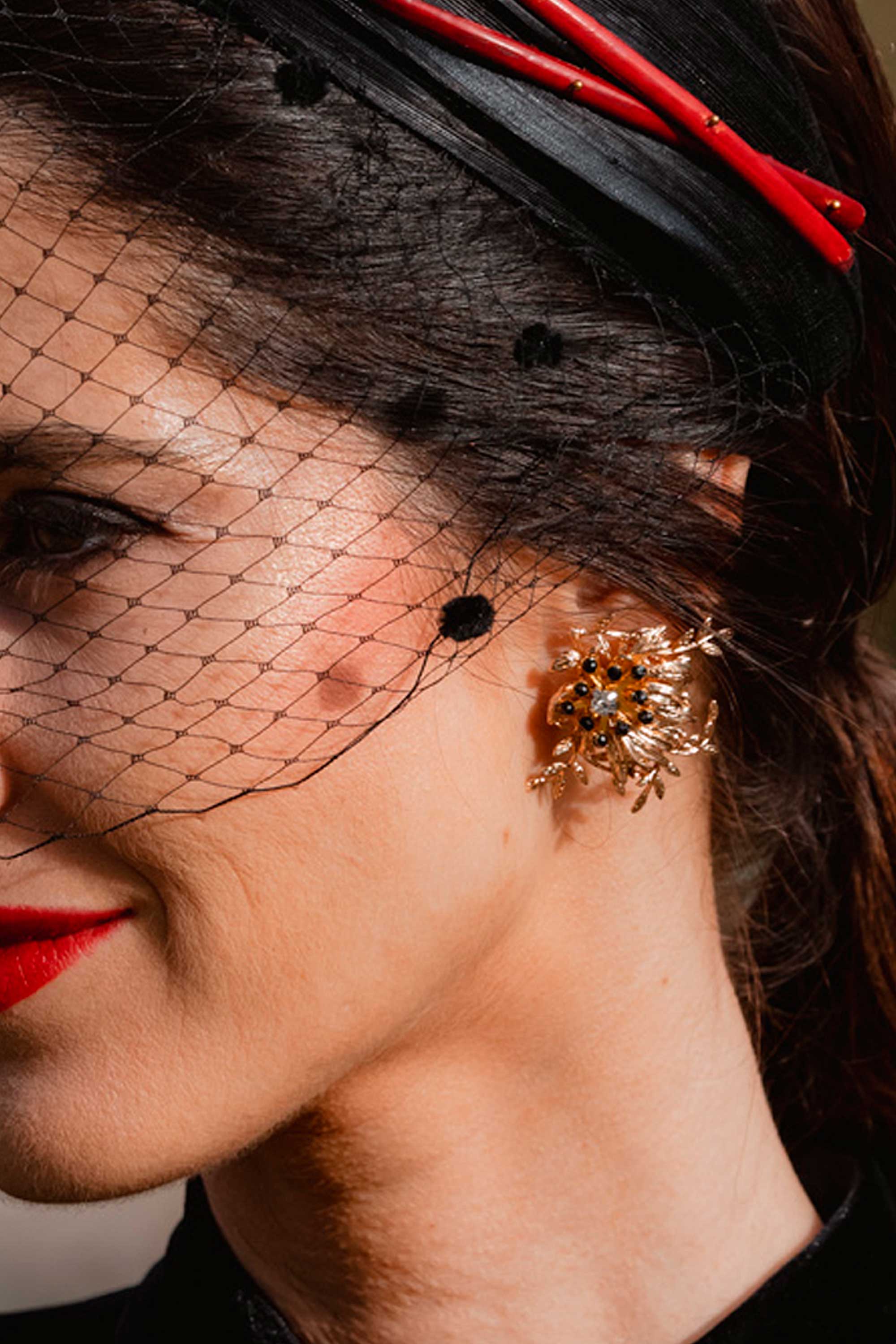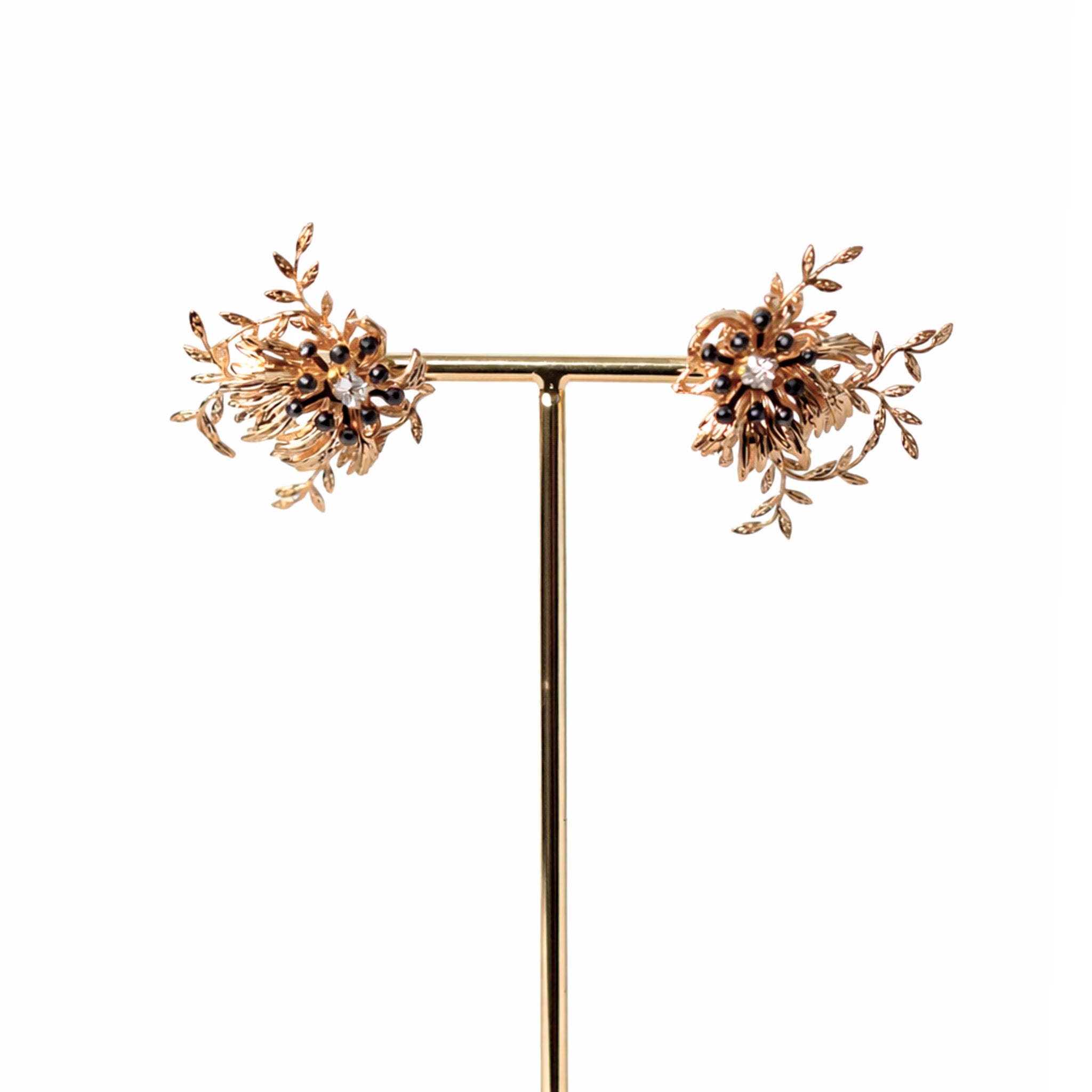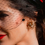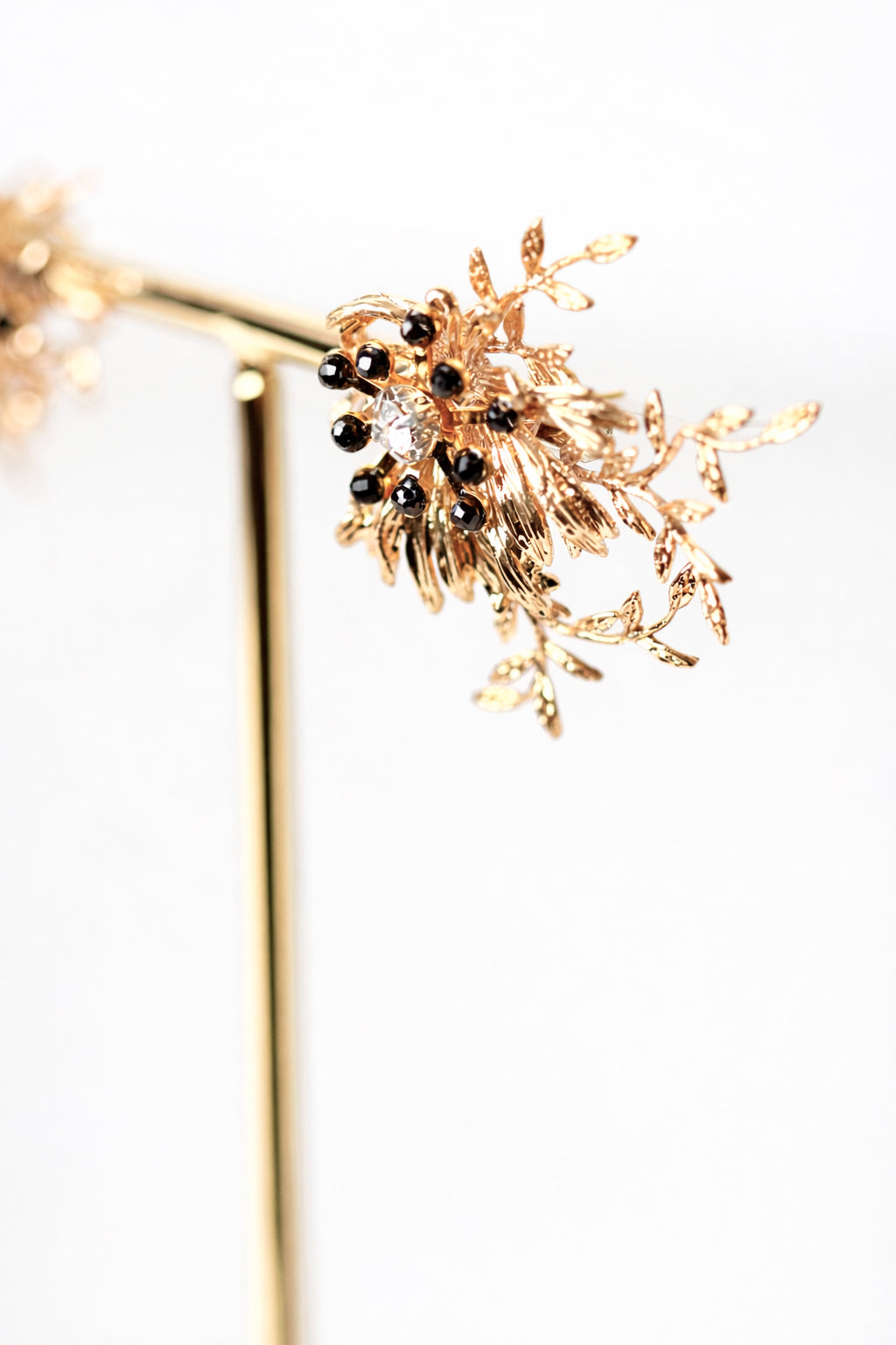 Su diseño presenta un brillo central rodeado de cuentas de cristal negras, formando una composición de estilo orgánico y floral, muy cuidada y armoniosa.