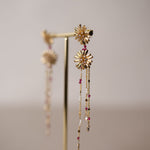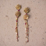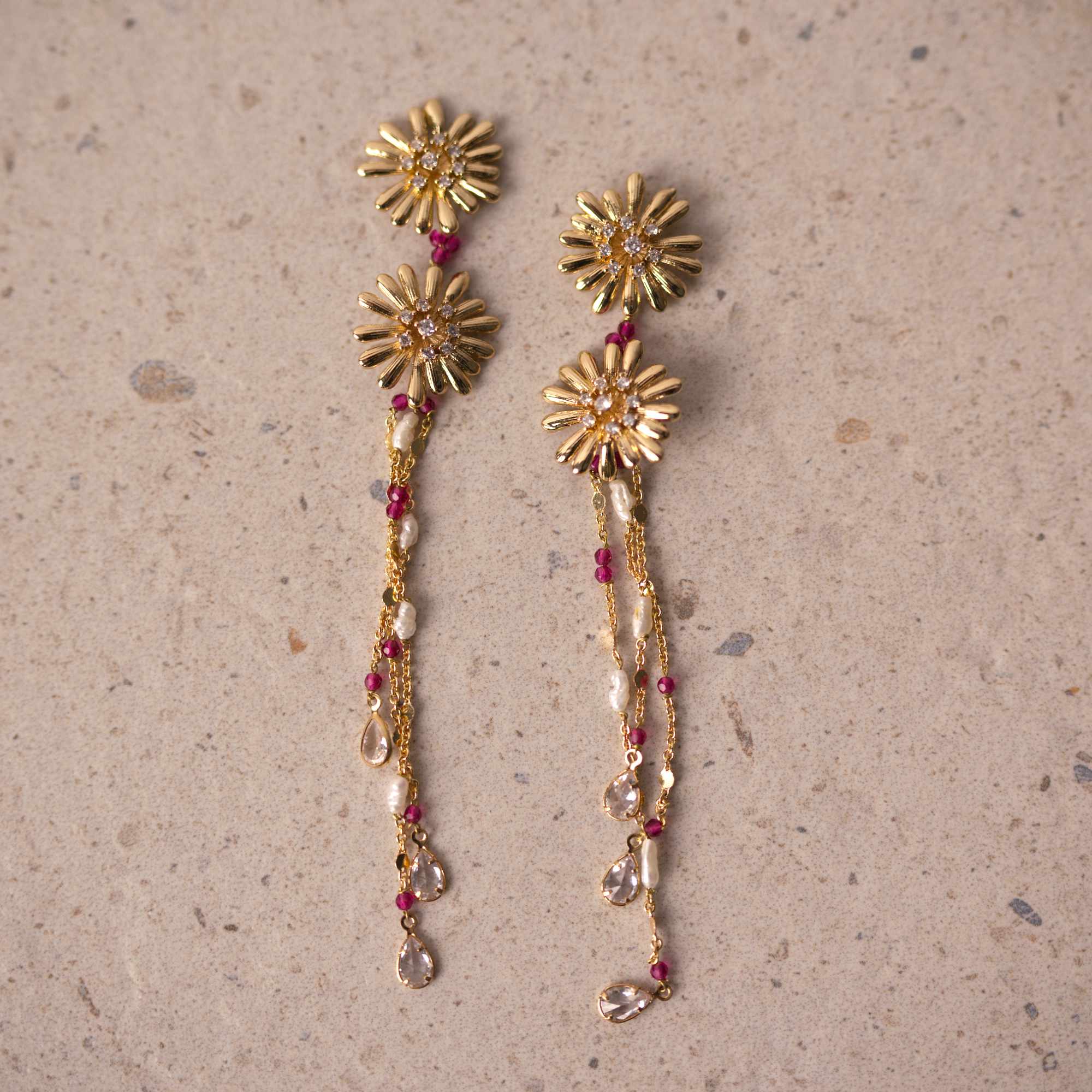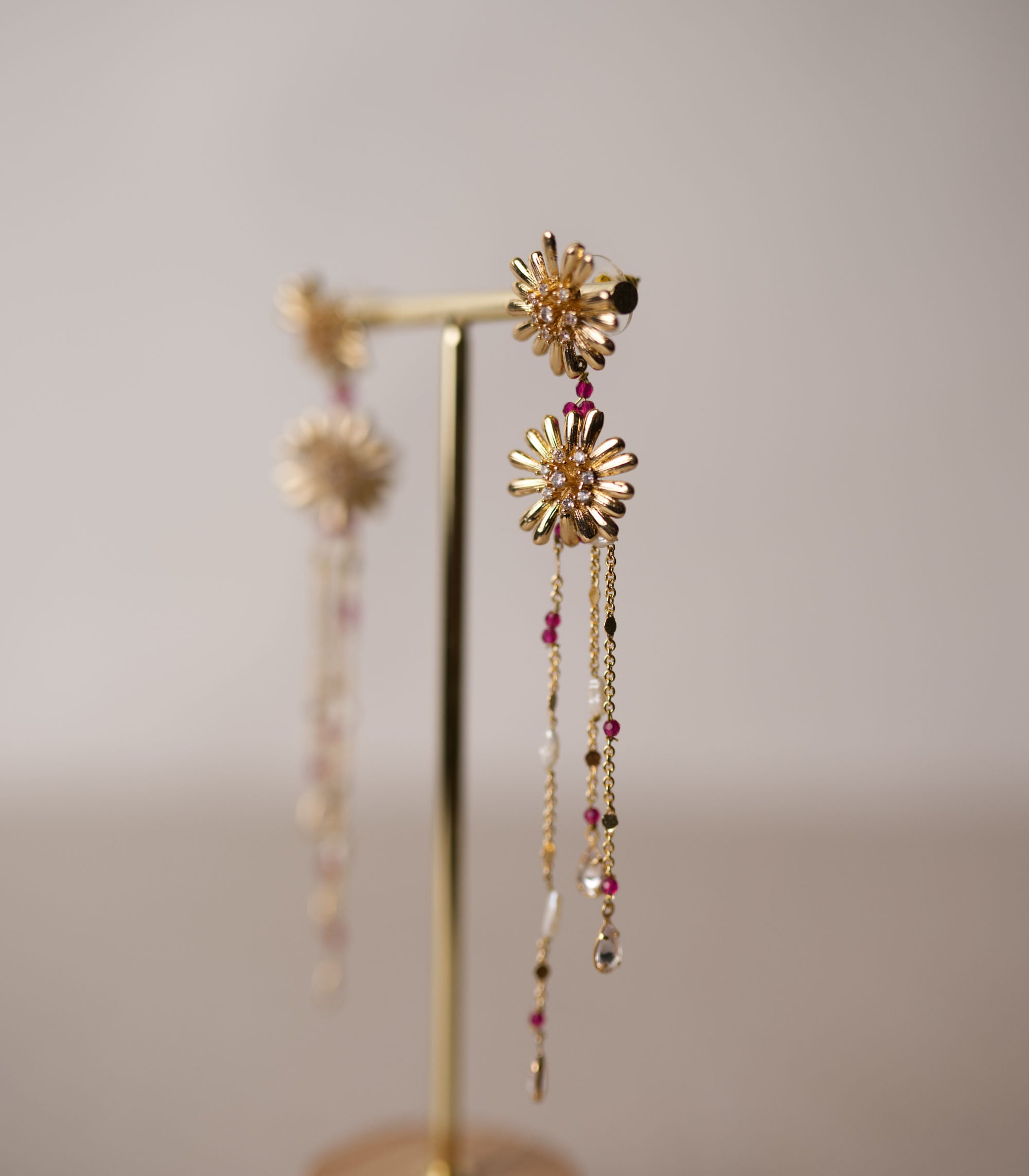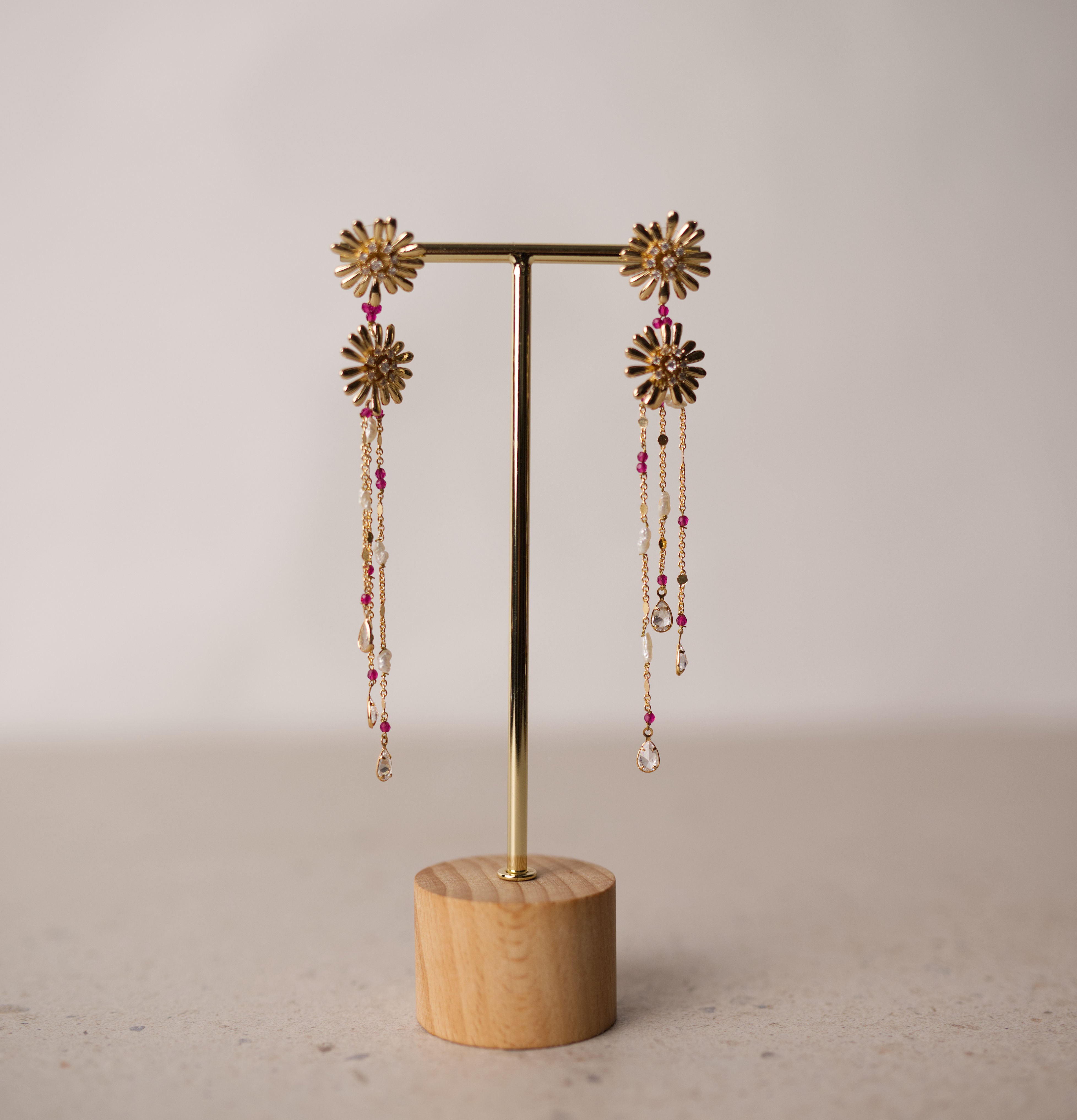 Están realizados a mano en nuestro taller con materiales nobles. Su diseño floral dorado se acompaña de finas cadenas con perlas, pequeños detalles en tono frambuesa y delicadas gotas transparentes que caen suavemente, creando un efecto ligero y muy femenino.