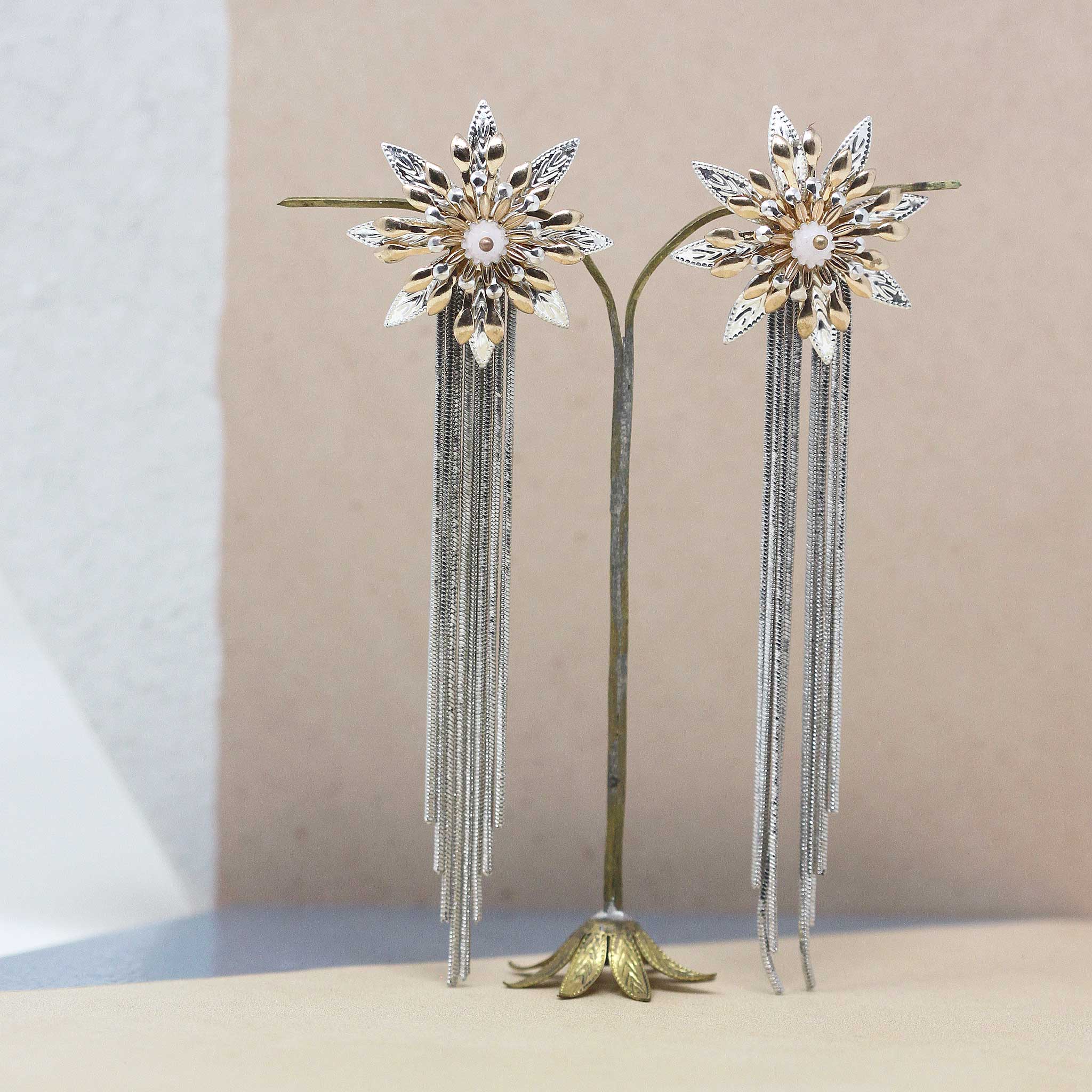 Pendientes largos joya elaborados a mano con detalles en color plata y color oro rosa.