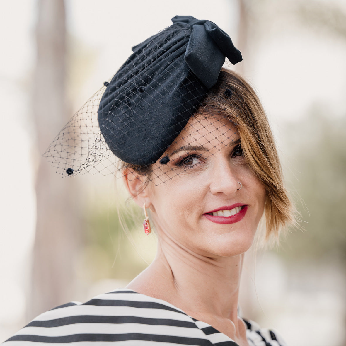Tocado vintage totalmente elaborado a mano, decorado con terciopelo negro creando formas de arrugas y con un lazo que aporta altura al look. Va acompañado de un velo de tul en negro que provoca elegancia y seriedad.