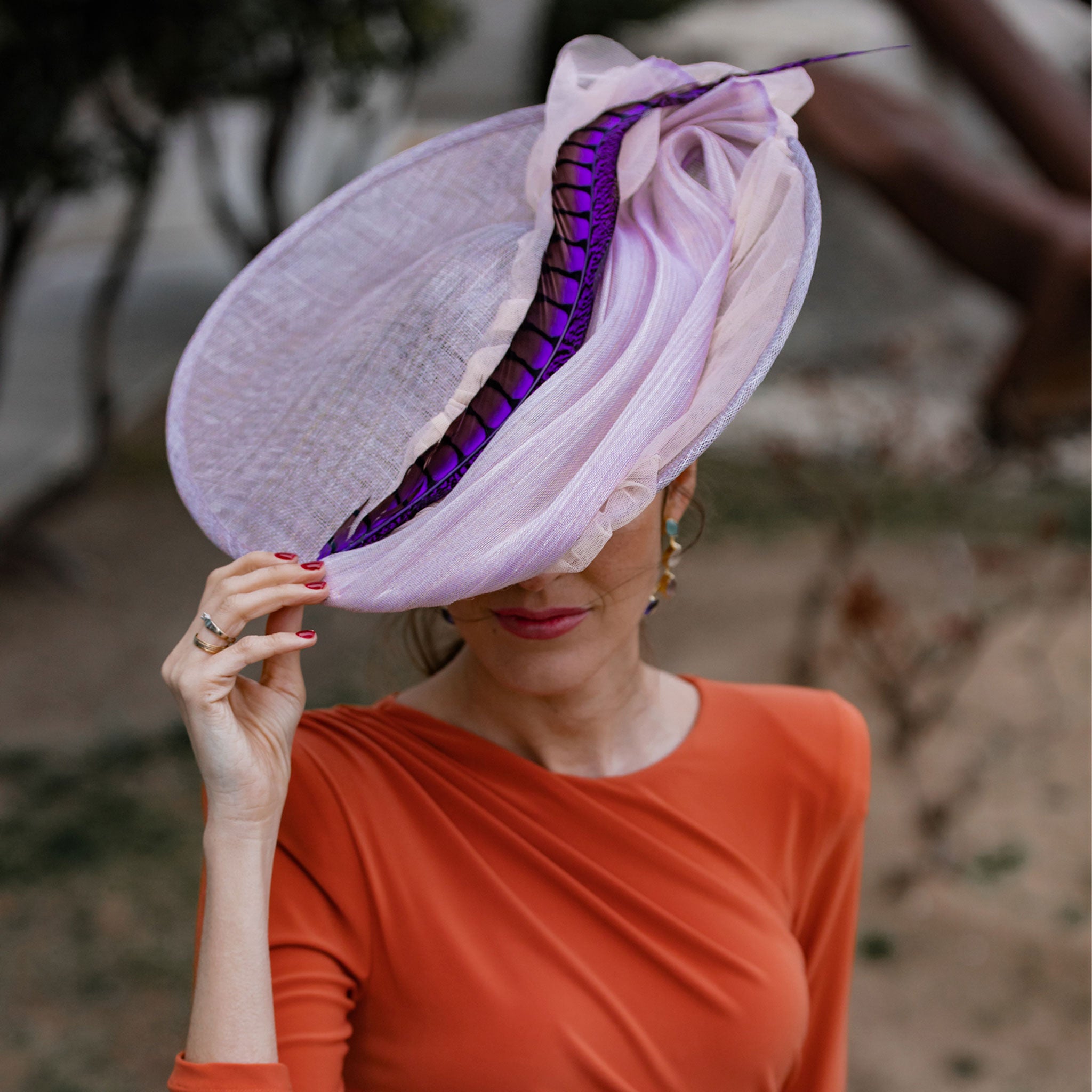 Pamela estilo plato de base malva, con base de diadema en morado. Decorada con sinamy tul y una gran pluma.