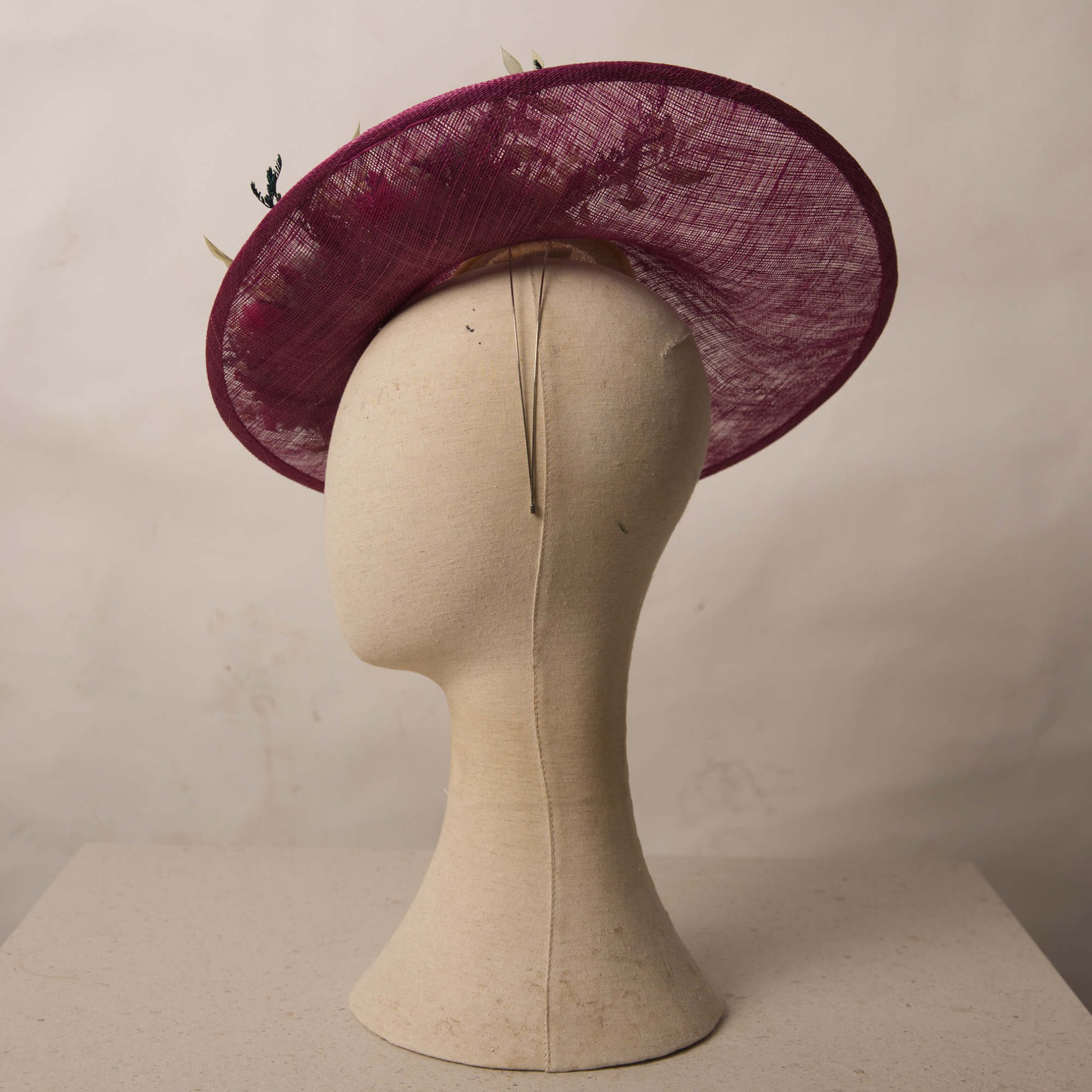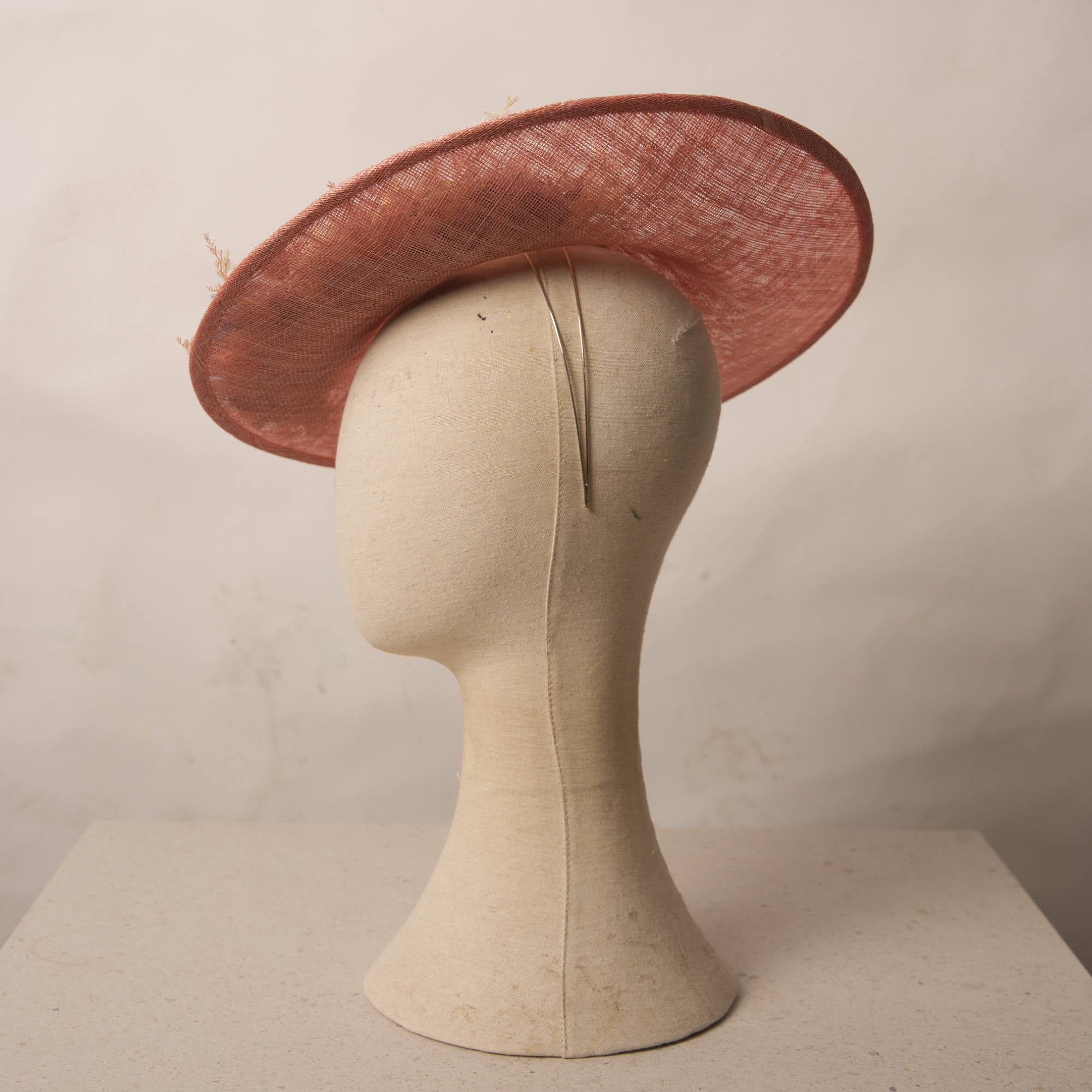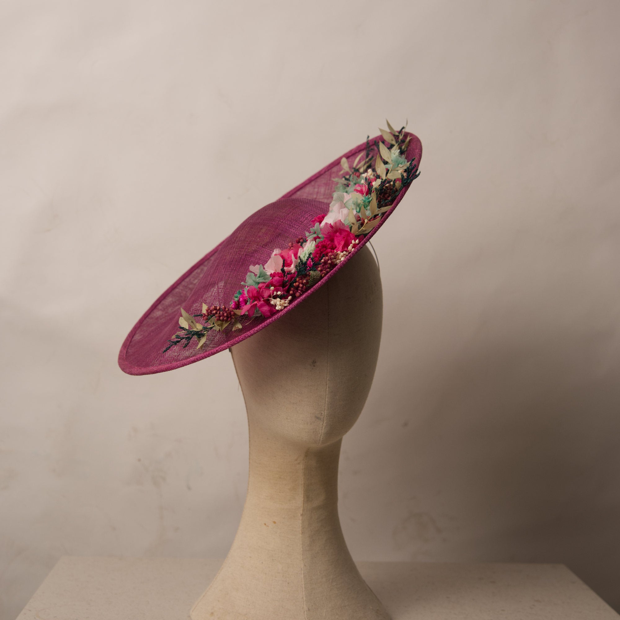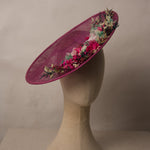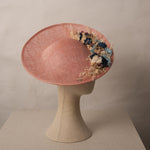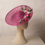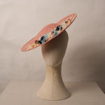 Pamela estilo plato decorada con flores naturales, y seda de Sinamay. Incorpora una diadema metálica para una mayor sujeción y comodidad