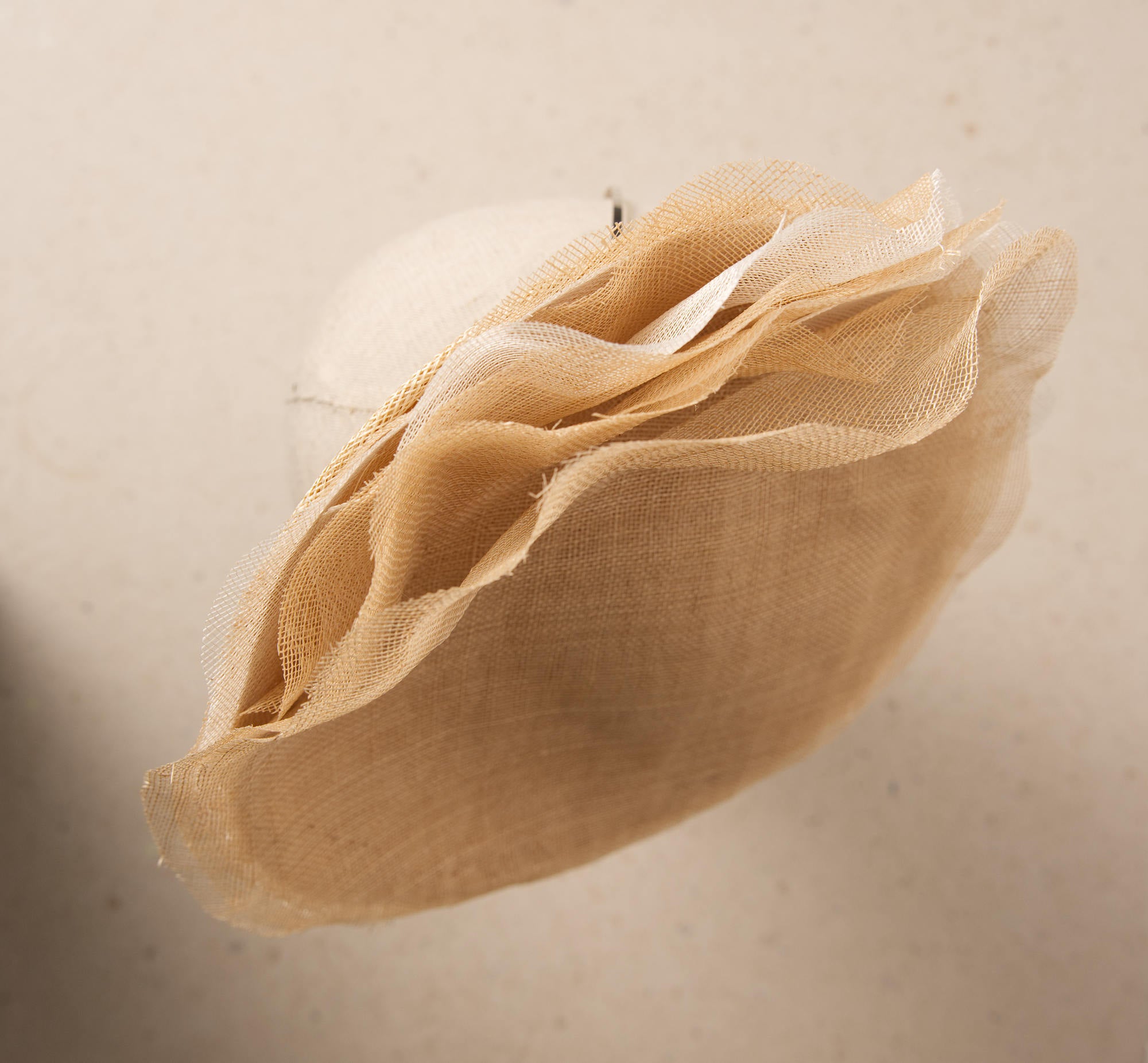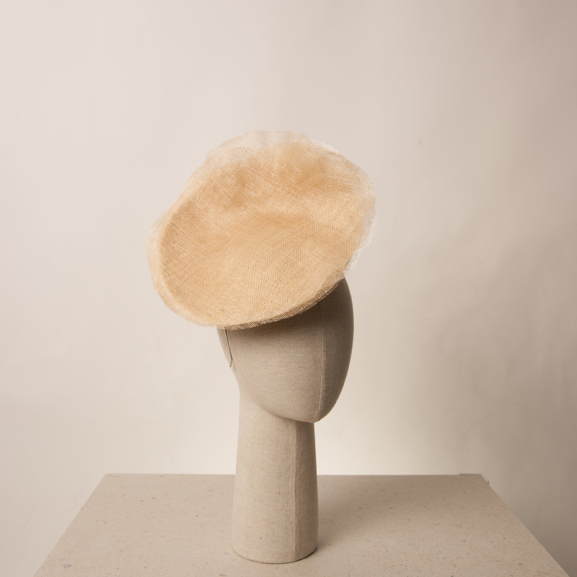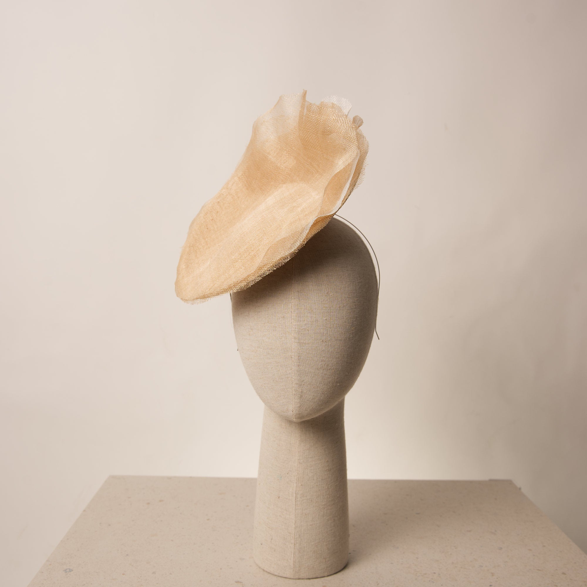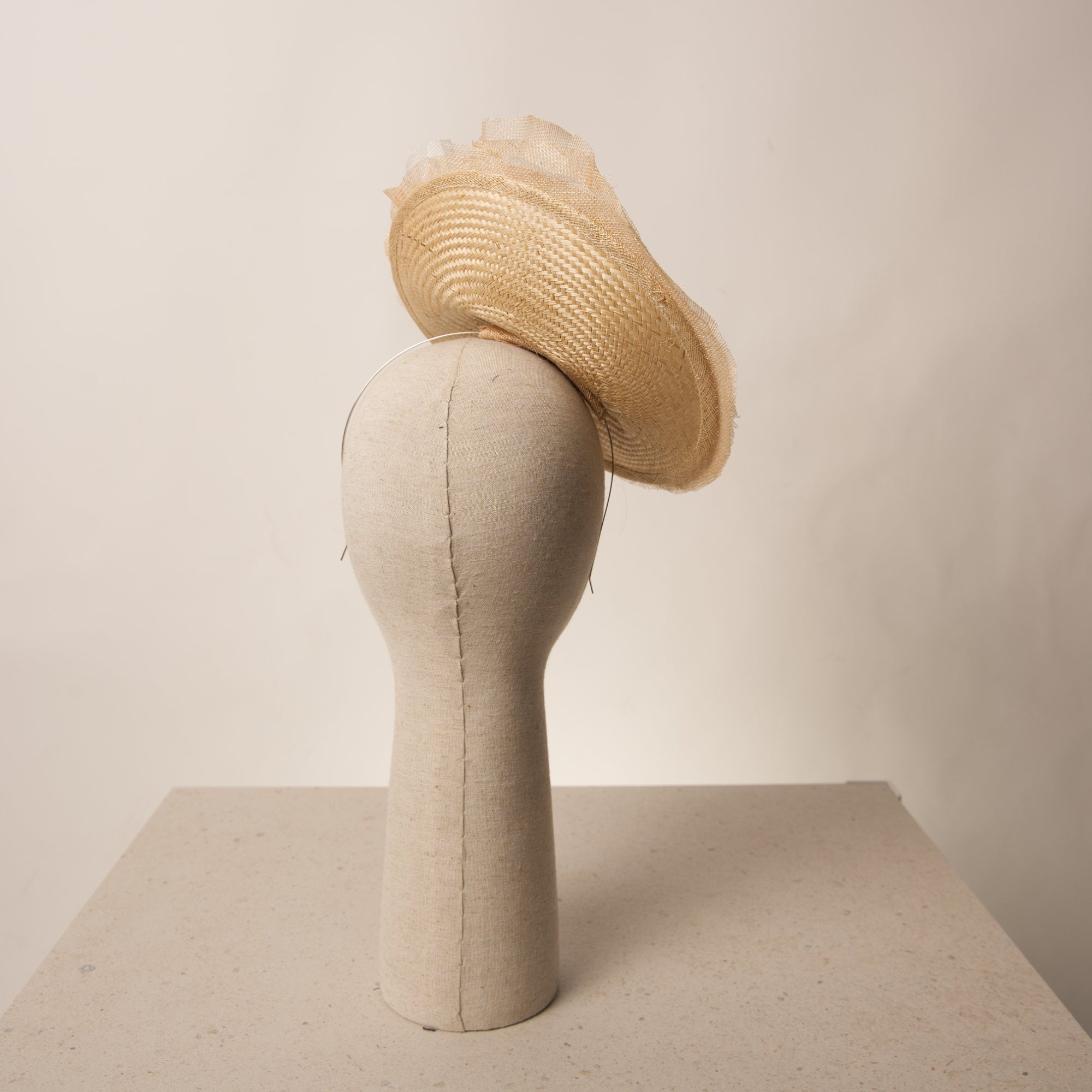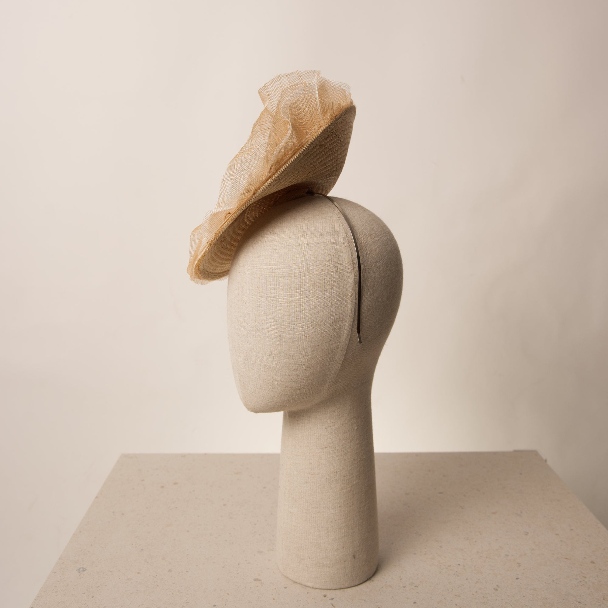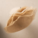 Fascinator tipo plato para ceremonia y eventos especiales. El Fascinator Calix está diseñado a mano sobre buntal de primera calidad. Su exterior se decora con un sin fin de laminas de sinamay haciendo efecto de milhojas onduladas en forma ascendente que aportan verticalidad y un gesto elegante.