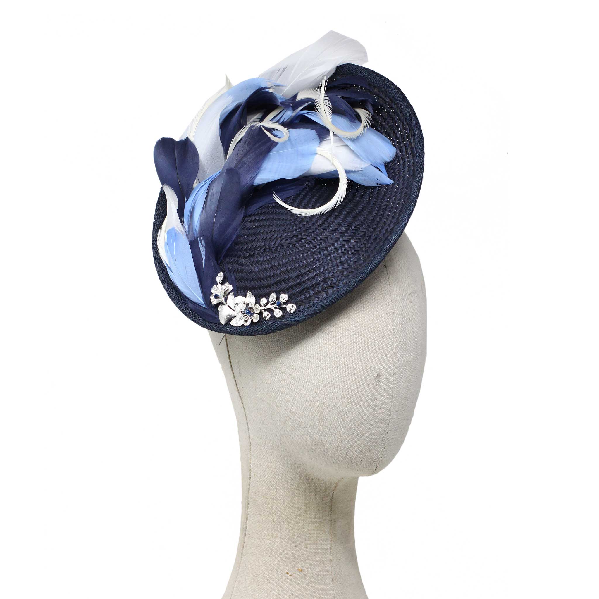 Pamela estilo plato con base azul marino decorada con plumas en diferentes colores. Terminada con pequeños broches joya, tanto en la parte superior como en la inferior, que añaden el toque final perfecto.