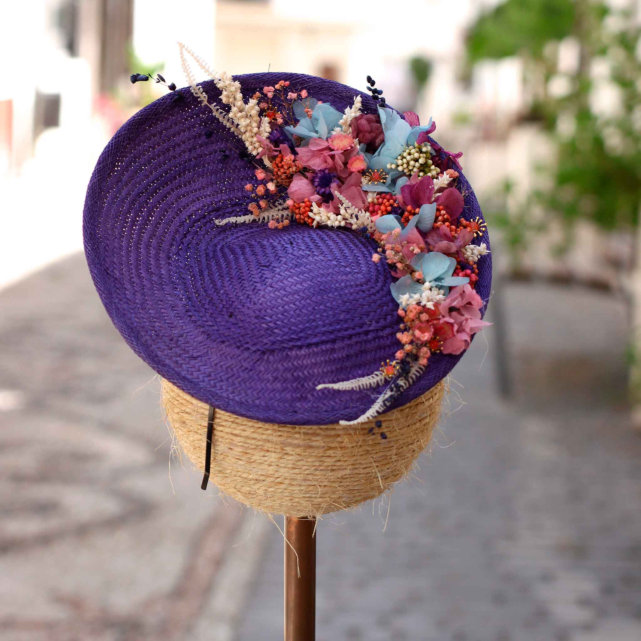 Pamela estilo plato con la base de diadema en tono morado decorado con flores preservadas. Puedes escoger llevarlo con o sin un velo de tul con plumeti.