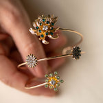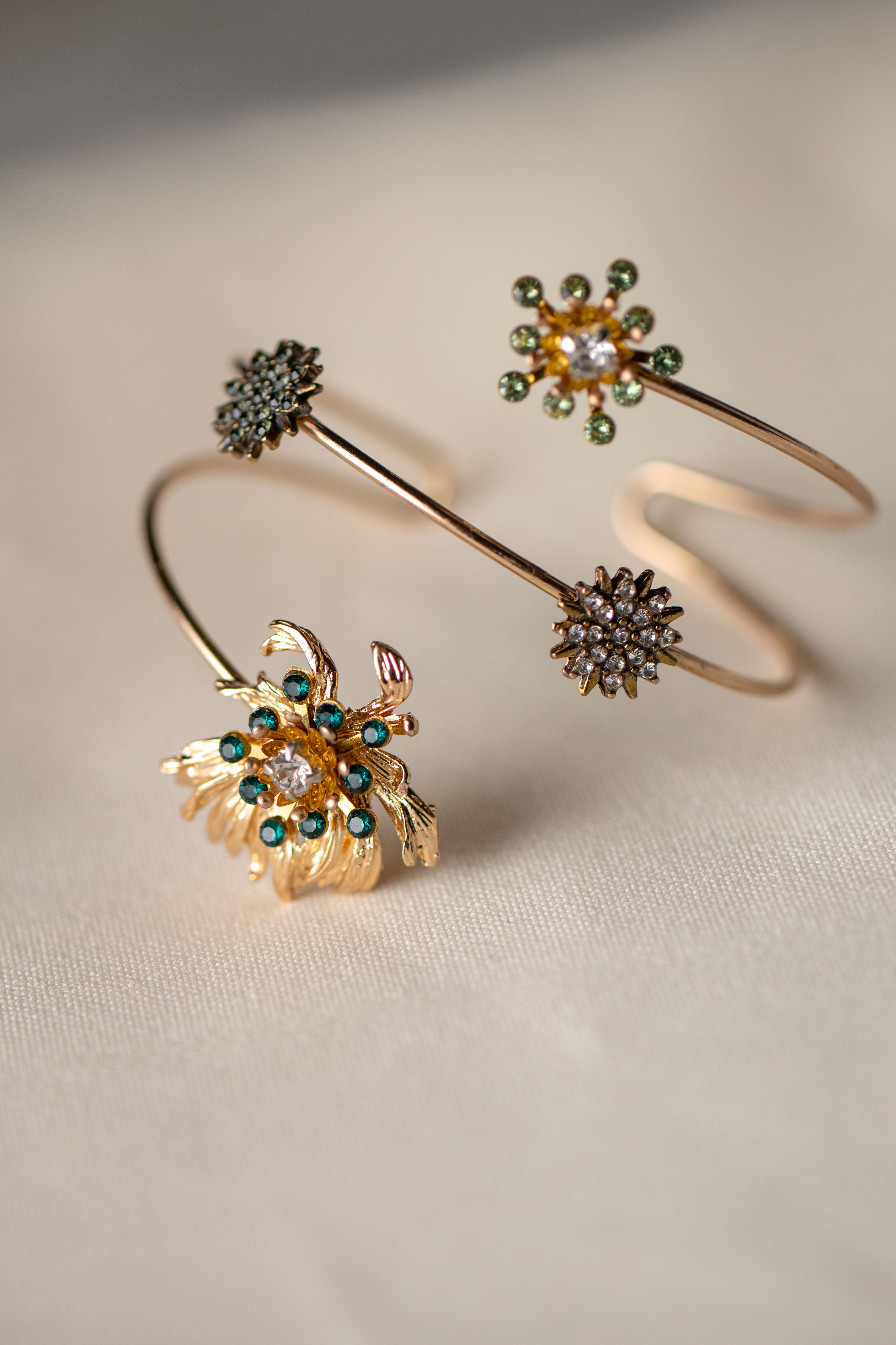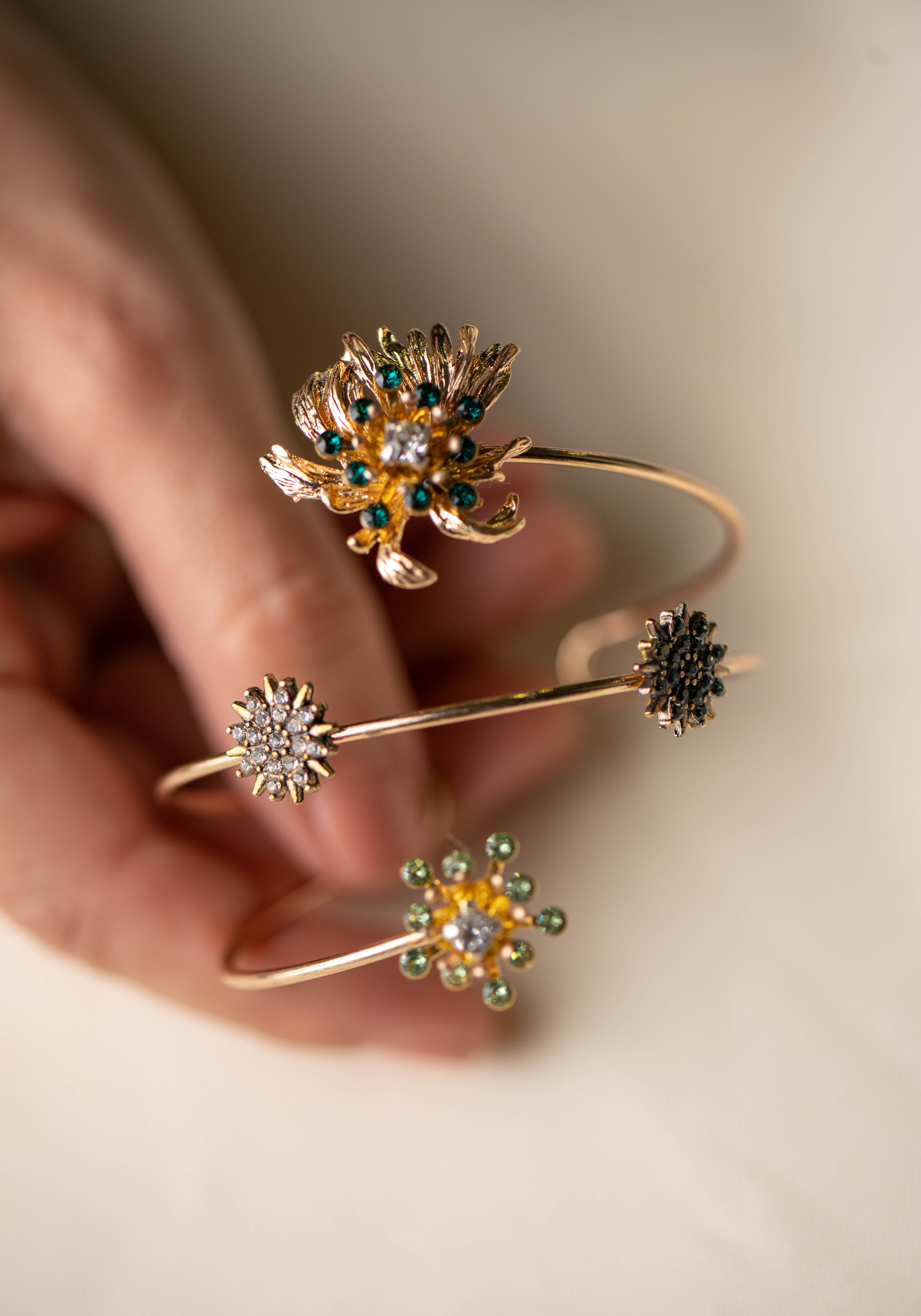 Este brazalete hecho a mano envuelve la muñeca (o incluso el antebrazo) en tres vueltas llenas de brillo y personalidad. Su base dorada flexible abraza con delicadeza, mientras una decoración floral minuciosamente elaborada aporta un aire romántico y elegante.