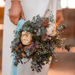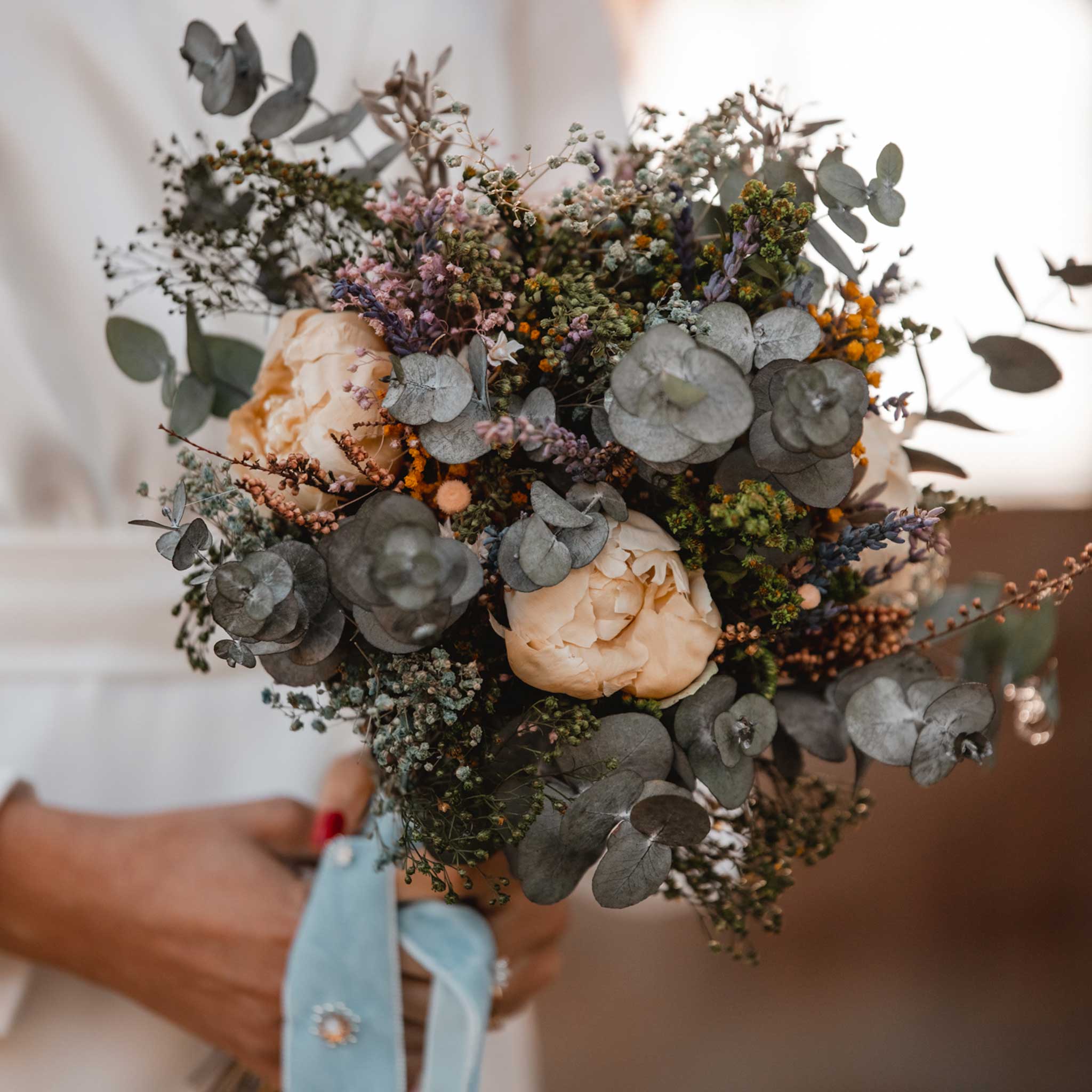 Este precioso ramo es un ramo clásico, y está lleno de una gran variedad de flores y hojas naturales preservadas como el eucaliptus, flores de peonia, hortensias, mini margaritas, y paniculata.