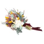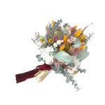 Este precioso ramo es un ramo clásico y está lleno de una gran variedad de flores y hojas naturales preservadas con preciosos detalles de plumas.
