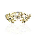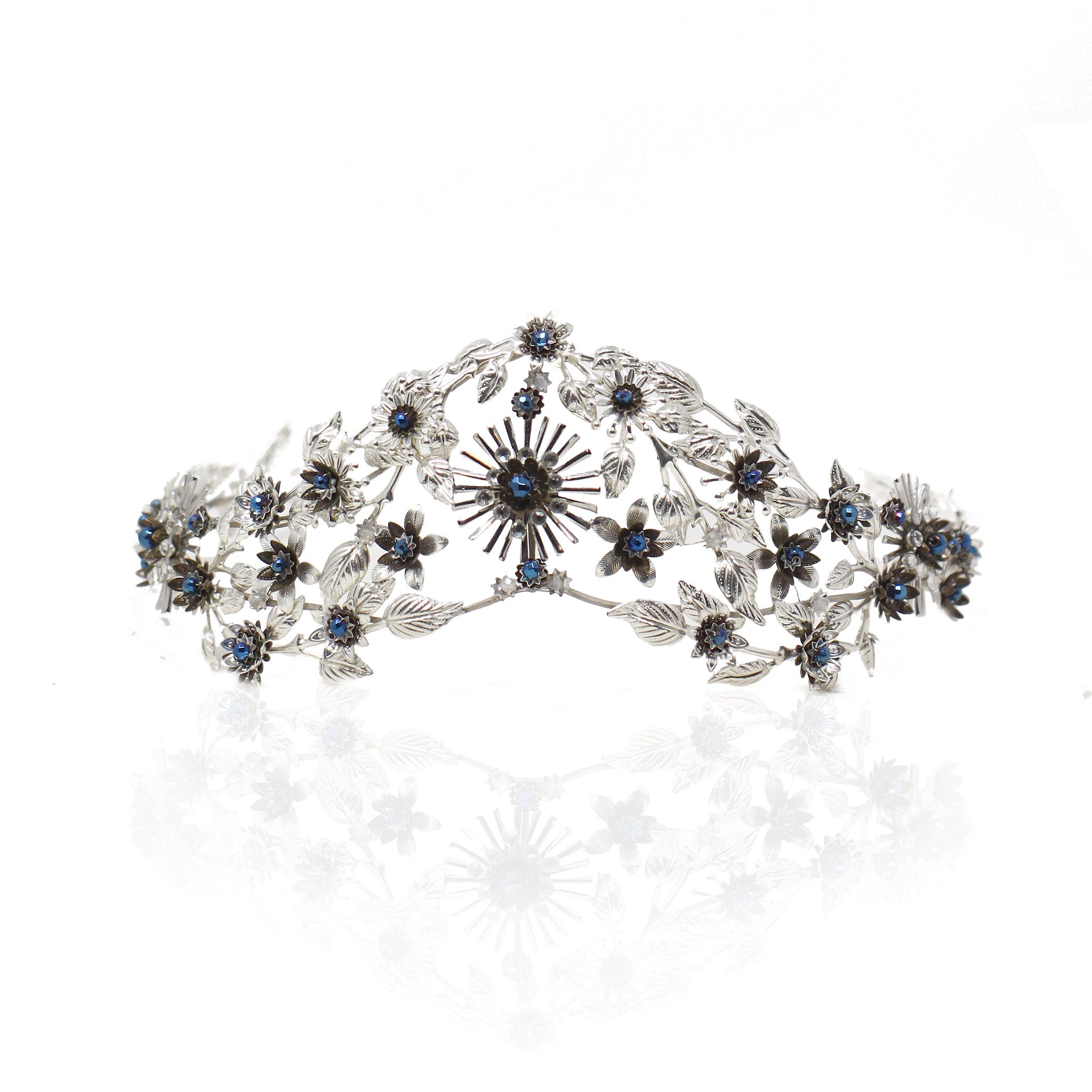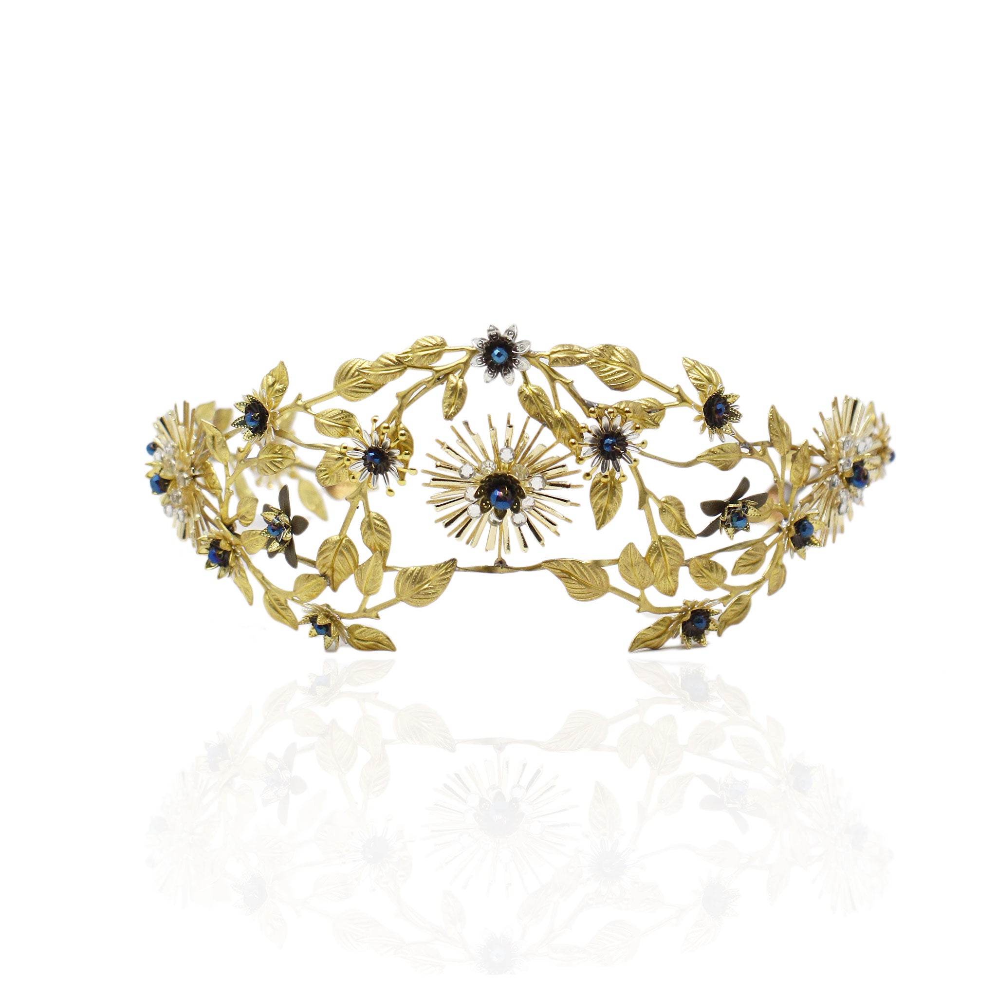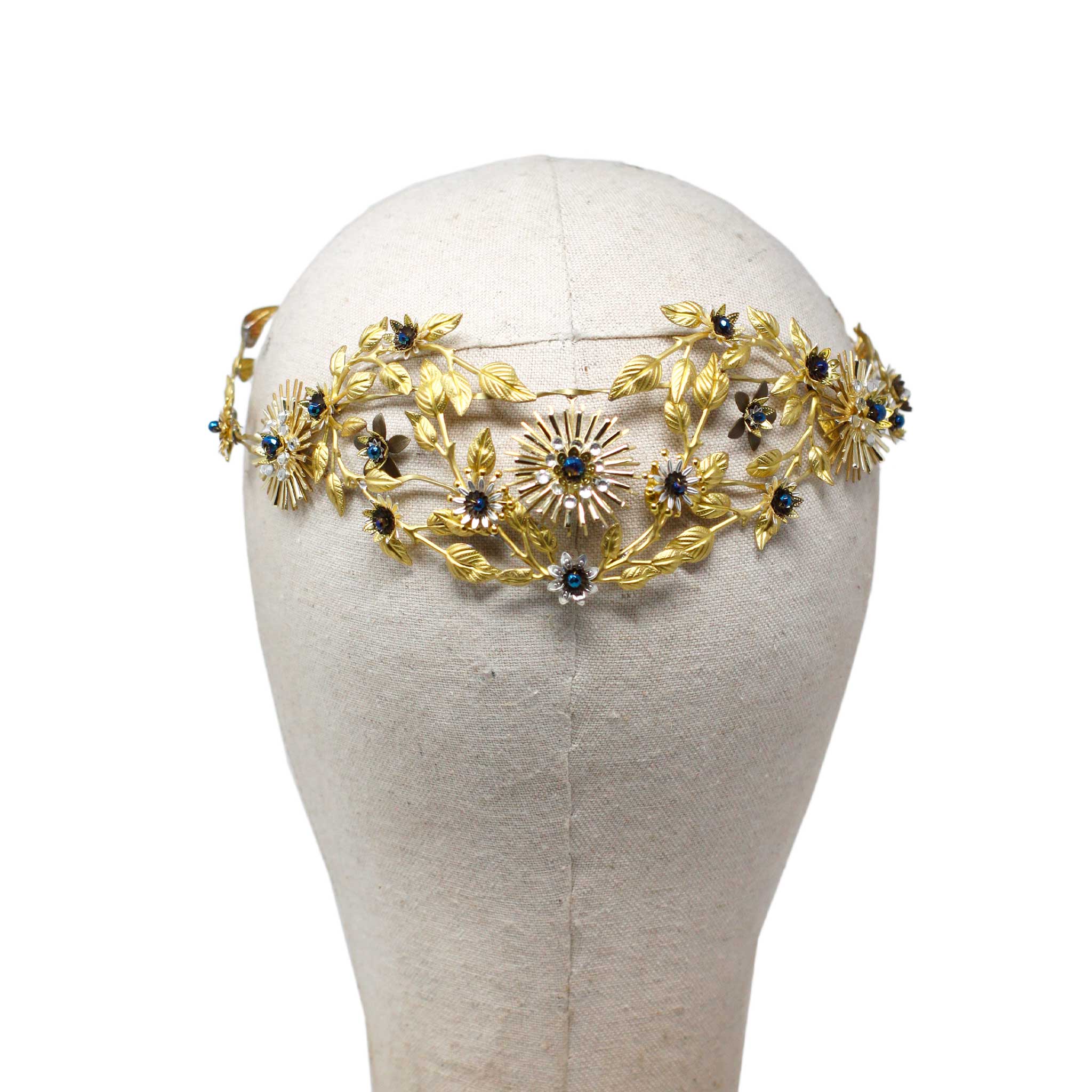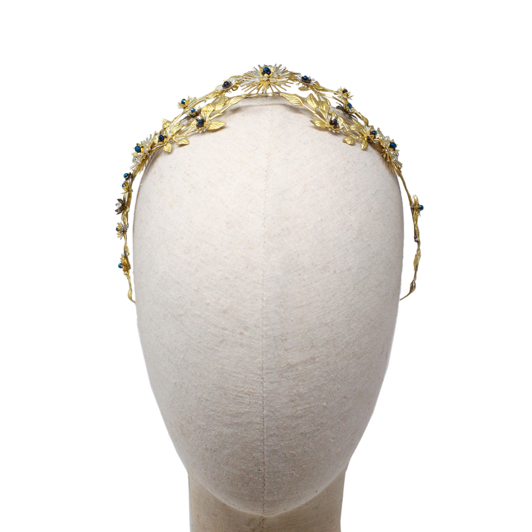 Semi - corona tipo joya totalmente elaborada a mano en tonos dorados o plata con detalles en azul marino. Esta diseño está creado para poder ser utilizada  de dos formas diferentes: como tocado trasero o como corona frontal.