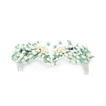 Bautizada por nuestras clientas como la semicorona cisne, este tocado queda precioso con un recogido, semirecogido e incluso con una trenza suelta. Está elaborada con pistilos de porcelana perlados, florecitas joya y detalles de flores naturales preservadas en tonos blancos y azules.