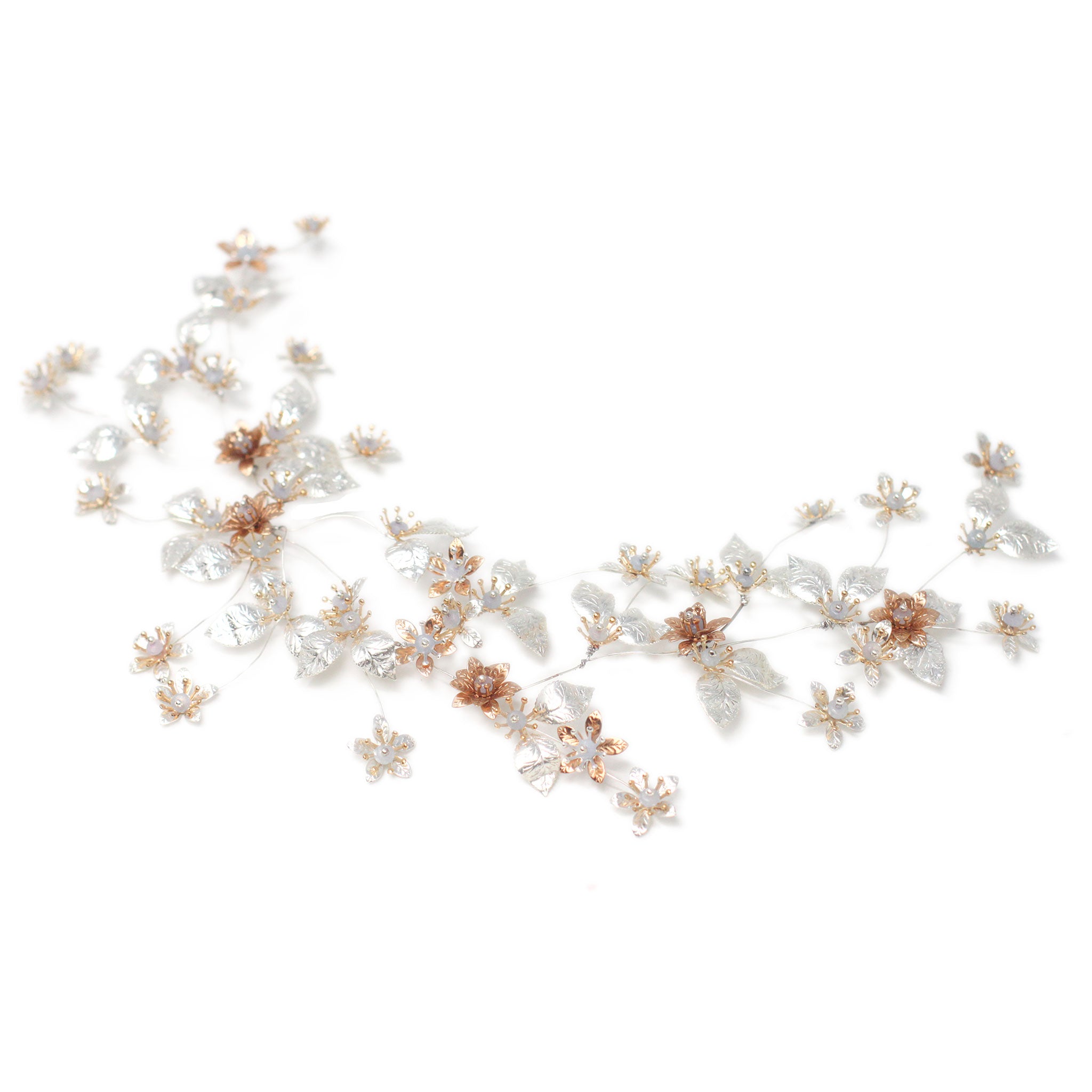 Este tocado es sin duda una de nuestras piezas más versátiles. Gracias a su flexibilidad, tiene la posibilidad de ser colocada de diferentes maneras: puede hacer la función de una semi corona tradicional o como decorado de cualquier tipo de recogido como lo puede ser una trenza.