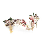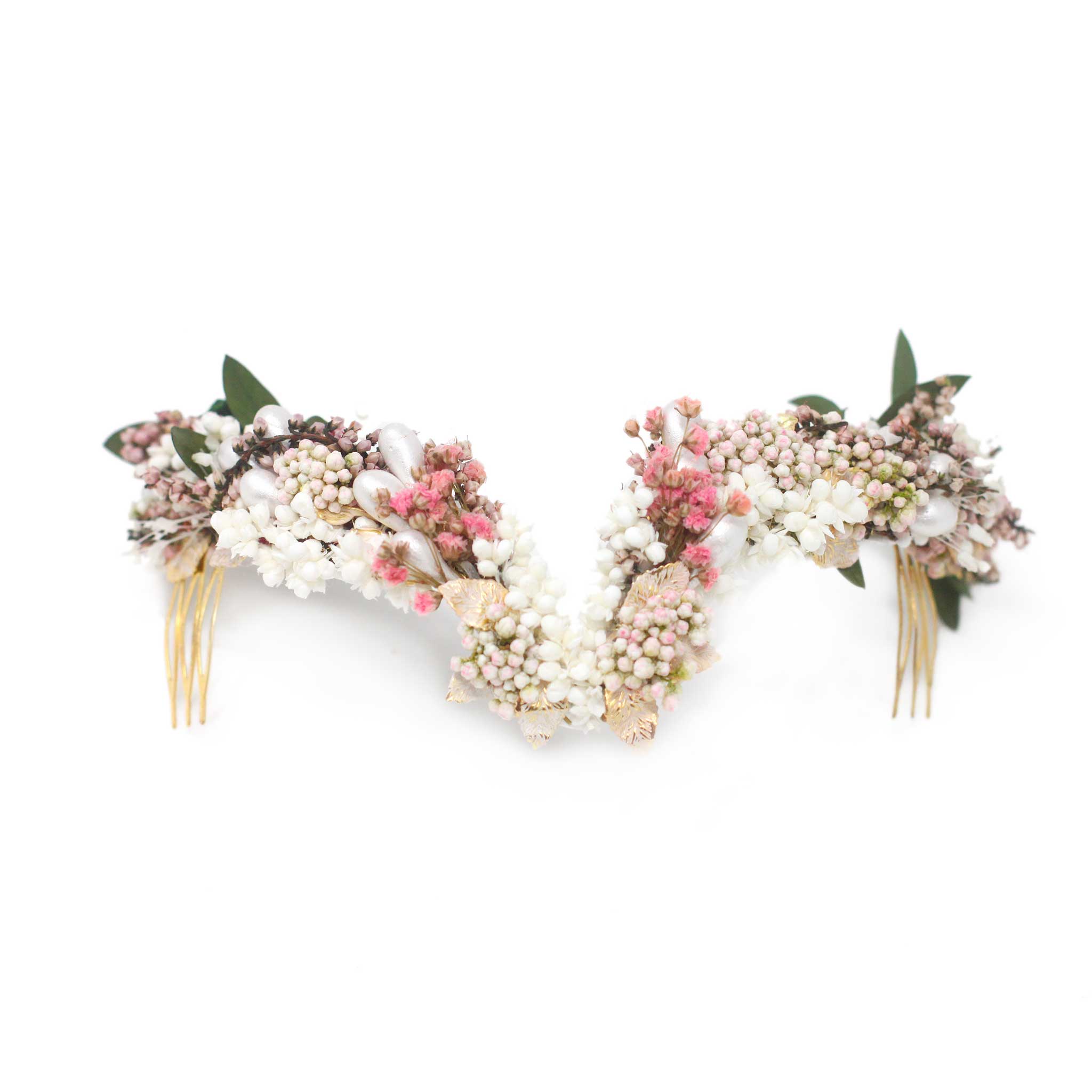 Este tocado queda precioso con un recogido, semirecogido e incluso con una trenza suelta. Está elaborada con pistilos de porcelana perlados, flores y hojas naturales preservadas y un detalle joya central.